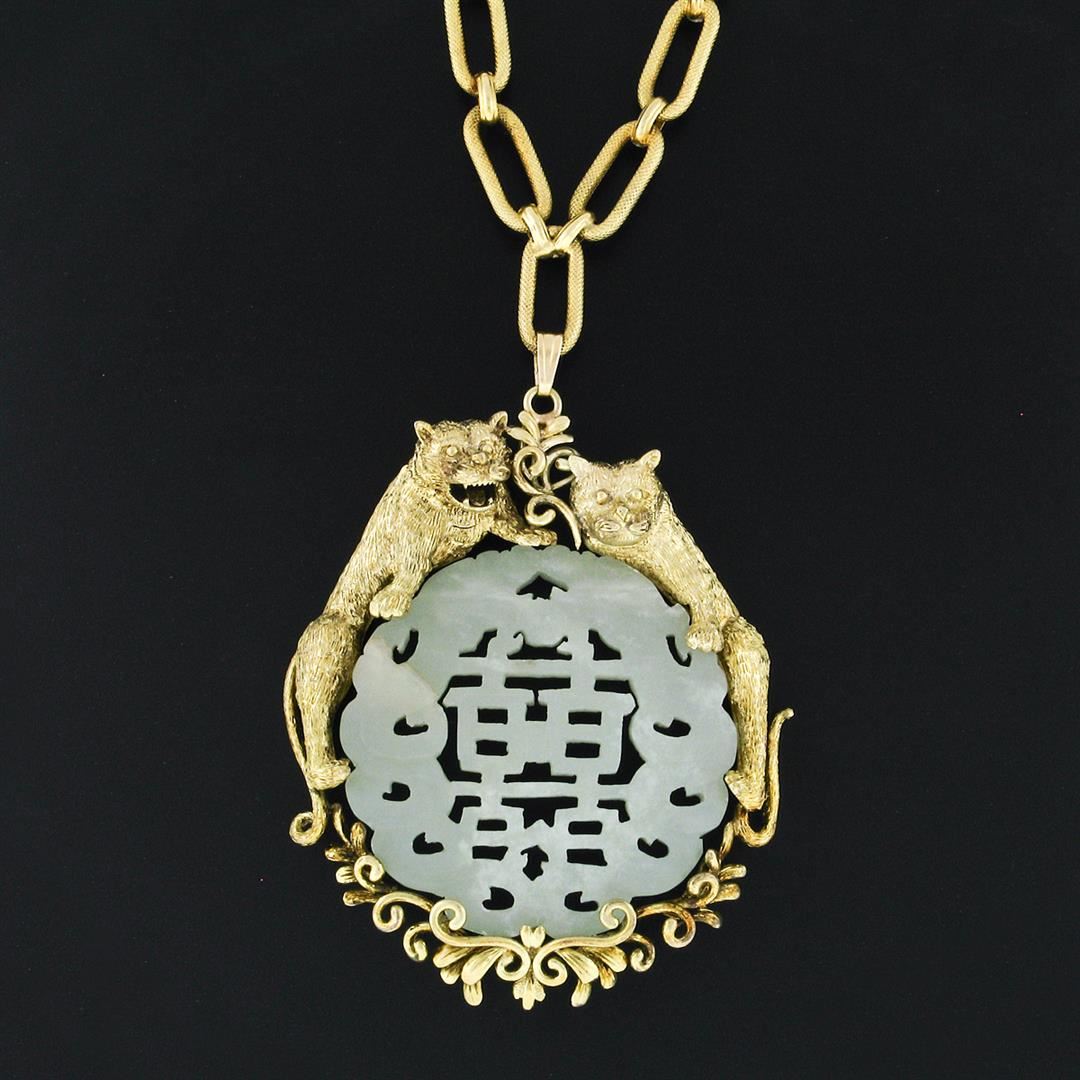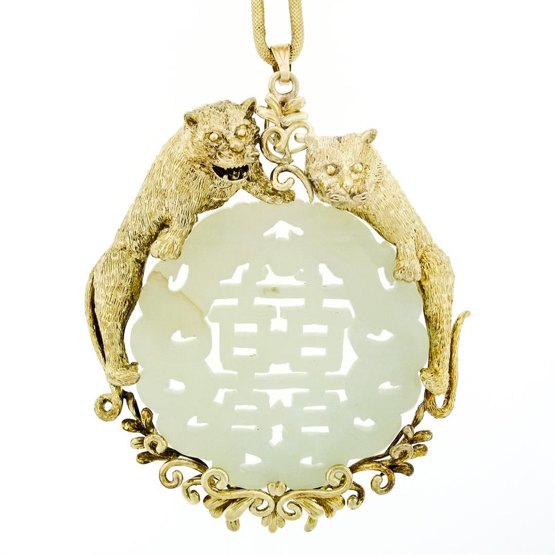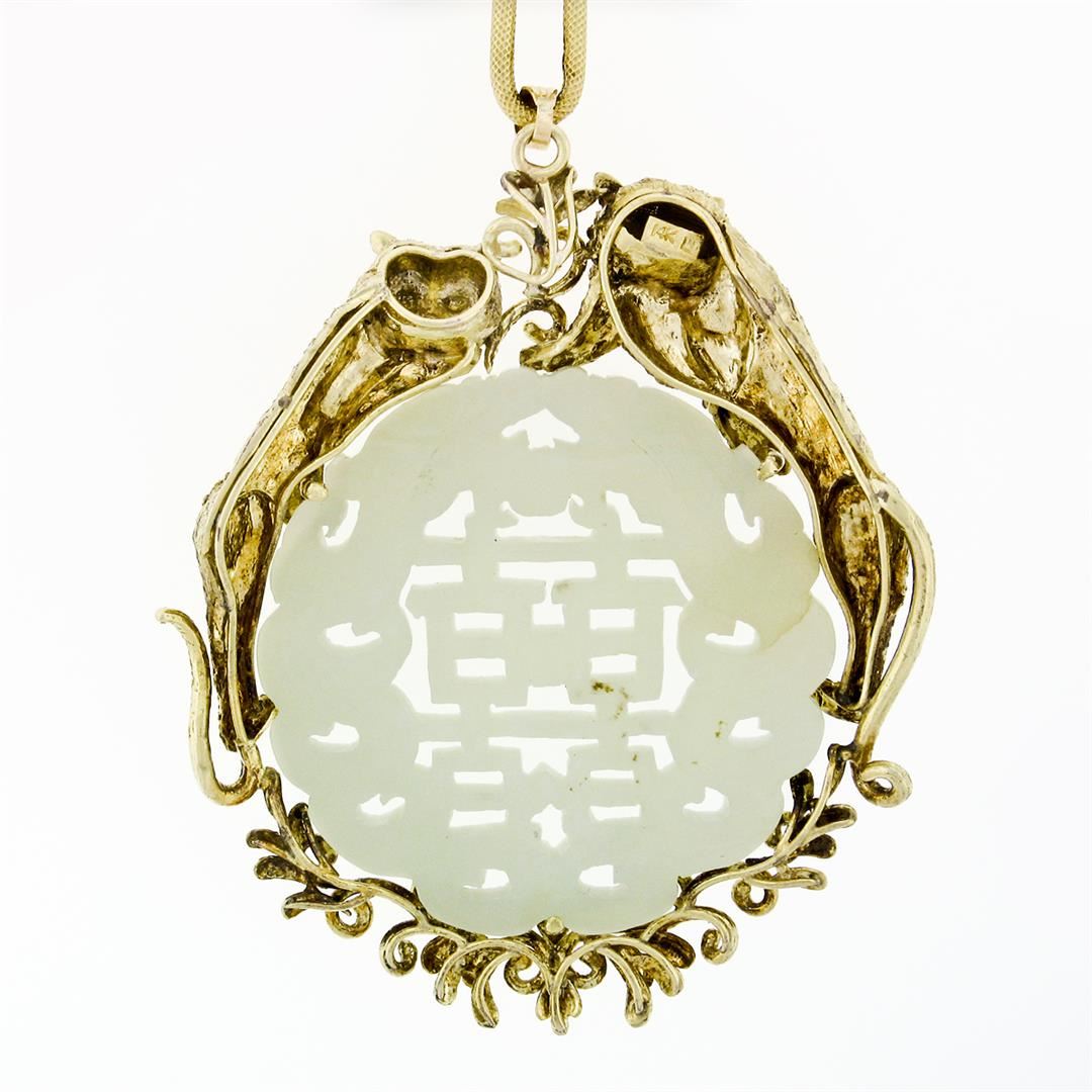 A vintage solid 14k yellow gold pendant with 1 pierced round natural nephrite jade (54.0mm). 22 inch oval link chain, 95.01 grams total weight, pendant measures 86.58x71.80mm.
