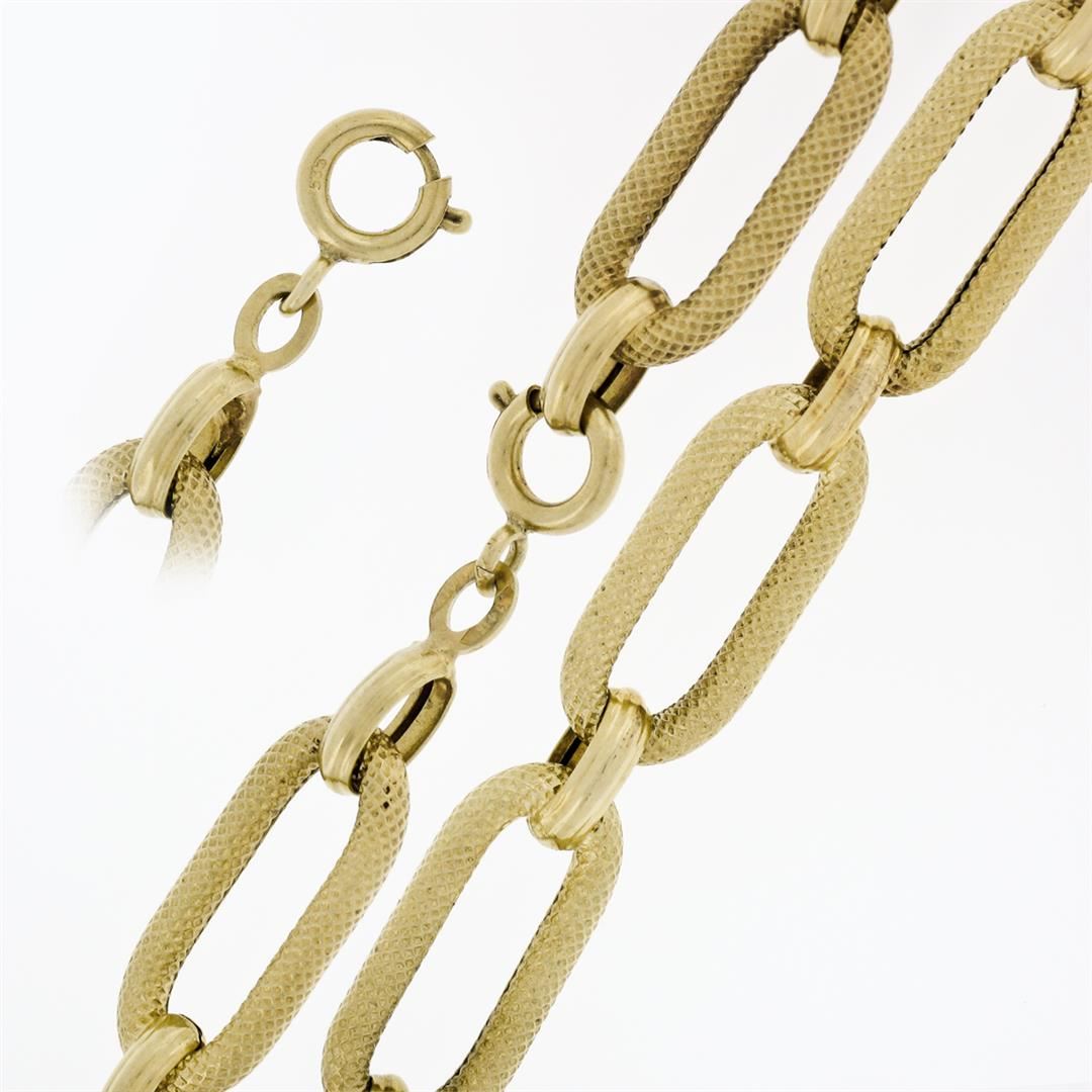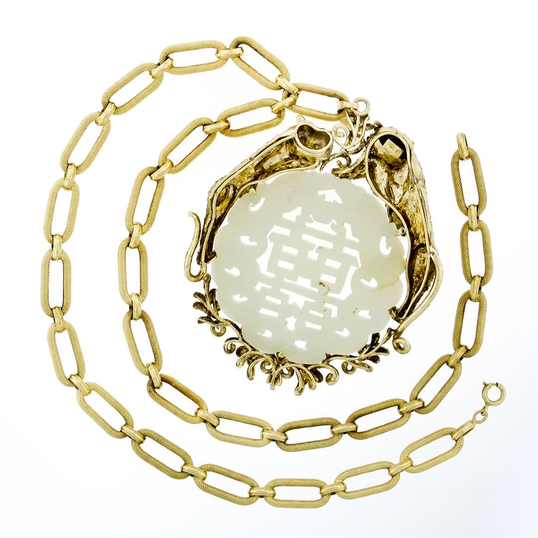 A vintage solid 14k yellow gold pendant with 1 pierced round natural nephrite jade (54.0mm). 22 inch oval link chain, 95.01 grams total weight, pendant measures 86.58x71.80mm.