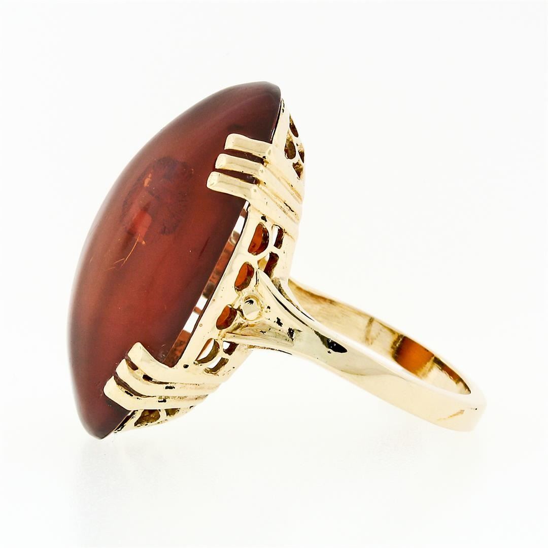 A vintage solid 14k yellow gold statement ring with 1 large oval cabochon cut natural amber (30.5x18.1mm). The ring is size 9.5, weighs a total of 8.96 grams, and measures 30.5mm wide.