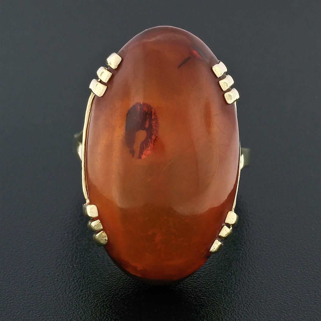 A vintage solid 14k yellow gold statement ring with 1 large oval cabochon cut natural amber (30.5x18.1mm). The ring is size 9.5, weighs a total of 8.96 grams, and measures 30.5mm wide.