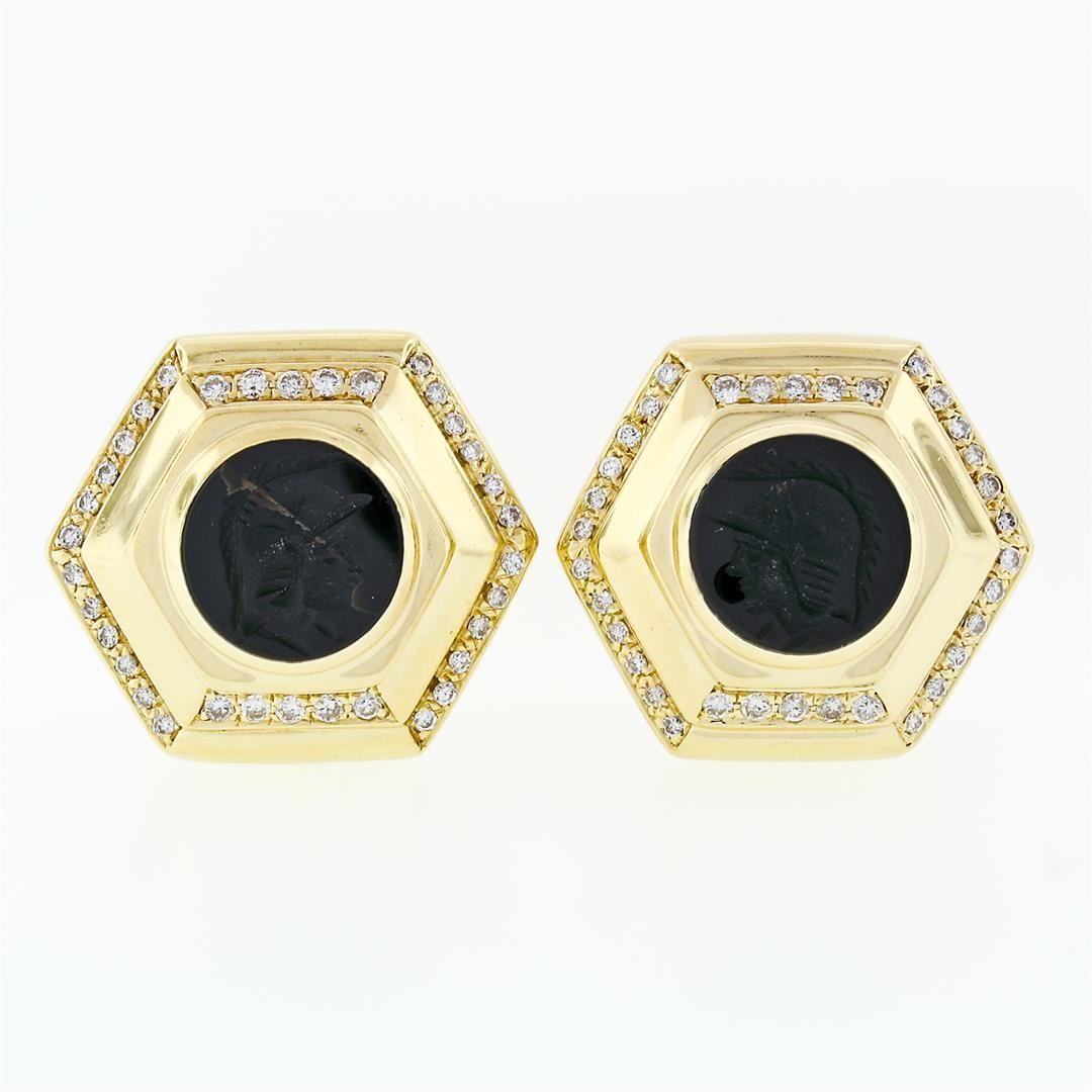 A pair of vintage solid 18k yellow gold Hexagon Earrings, with 2 carved round cut black onyx (12.9mm), and surrounded by round brilliant cut natural diamonds (F/G - VS1/VS2; 0.75ctw). The earrings measure approximately 25.82x28.69mm and weigh a total of 26.54 grams.