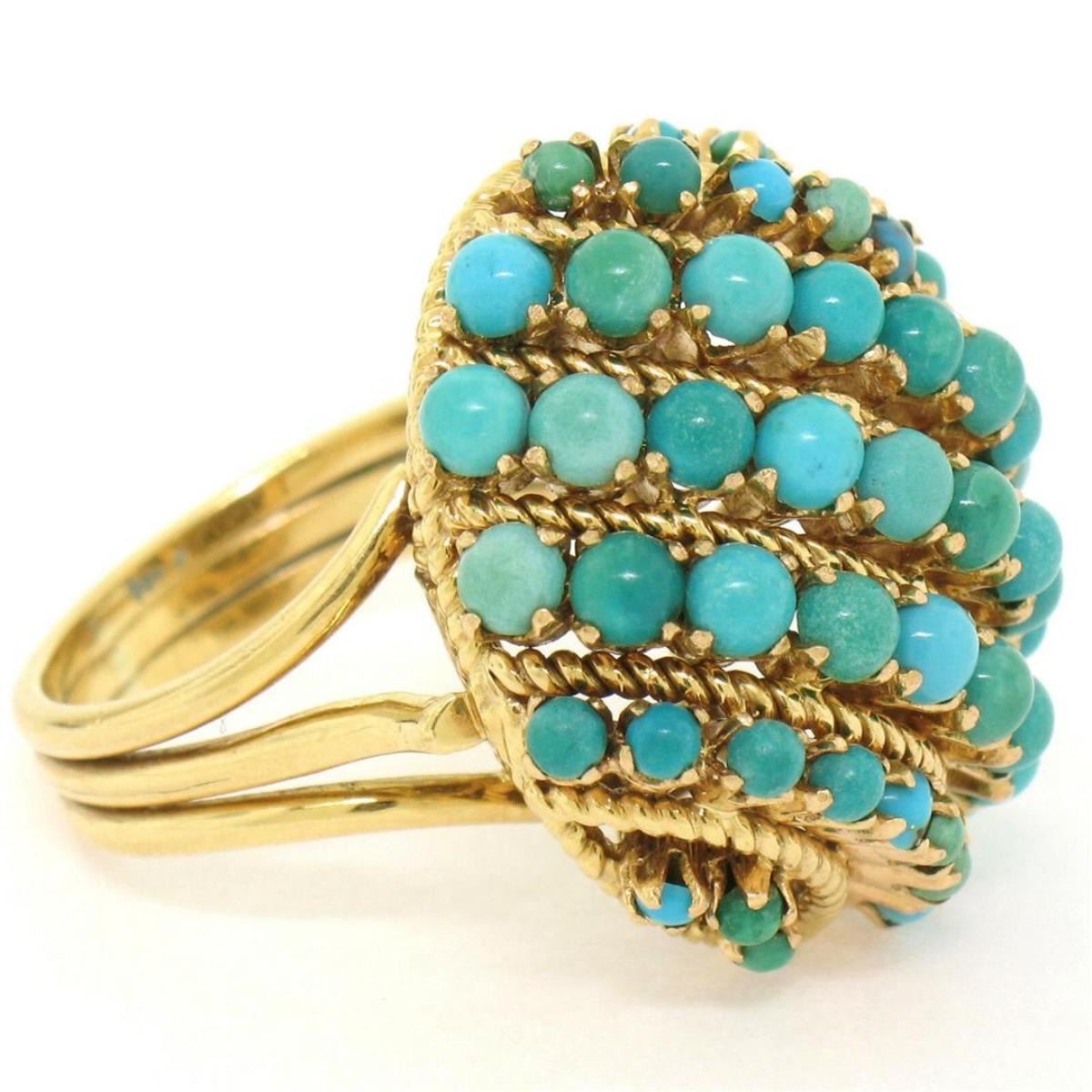 One Vintage Large 18k Yellow Gold 50 Natural Round Turquoise Wire Dome Cocktail Ring. Item Details: Material: Solid 18k Yellow Gold, Weight: 14.05 Grams, Stone(s): (22) Natural Genuine Turquoise - Round Half-Bead - Prong Set - Naturally Varying Turquoise Colors - 1.85mm (approx.), (28) Natural Genuine Turquoise - Round Half-Bead - Prong Set - Naturally Varying Turquoise Colors - 3.05mm (approx.), Ring Size: 6.5 , Ring Width: 25.25mm, Ring Height: 13.97mm rise off the finger, Condition: Vintage piece. Excellent condition!