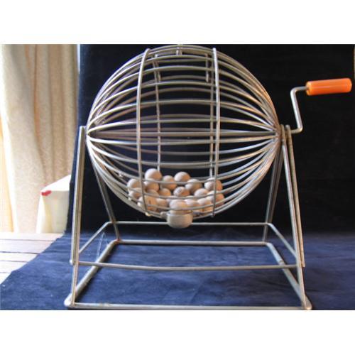 What a fantastic old game item! This is a Bingo tumbler with a metal "cage" and frame, and a butterscotch bakelite handle (I tested it). The cage has a small door that opens, so it could be used for any raffle tickets or the like. There is a little tipping basket into which the ball falls for removal as you play. Inside are 22 wooden balls (if I counted right) with numbers and letters pressed into them. It is very sturdy. The metal is no longer shiney, but could easily be with a brush-up with steel wool.