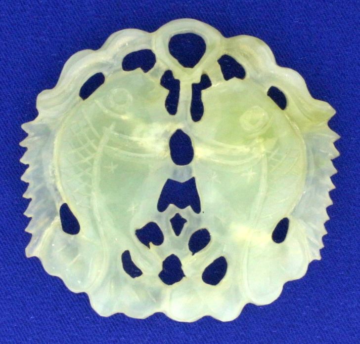 Hand cut in natural jade, Pendant is 2 1/2" in diameter. Can fit up to a 6mm thick chain. 27.7g.