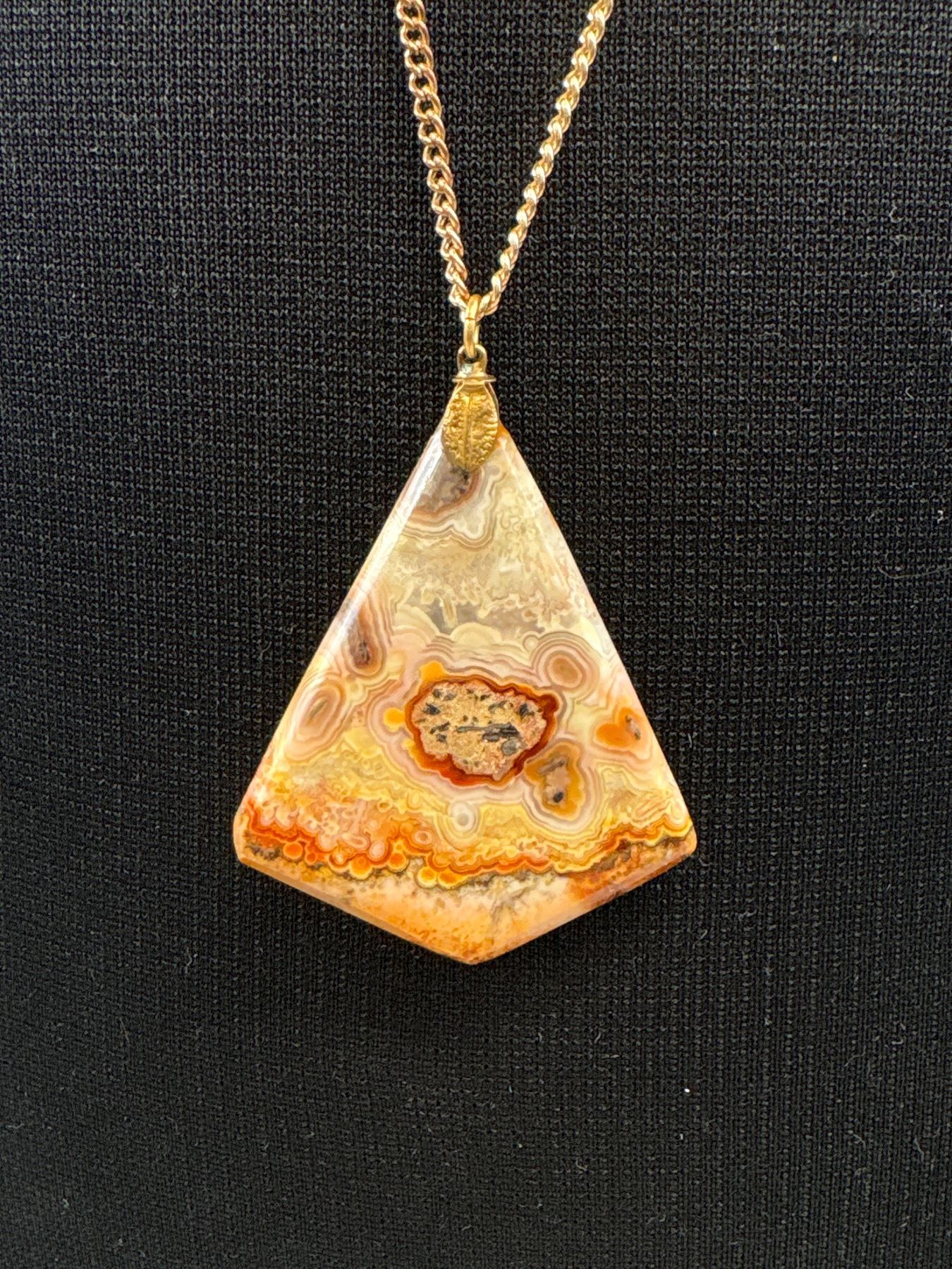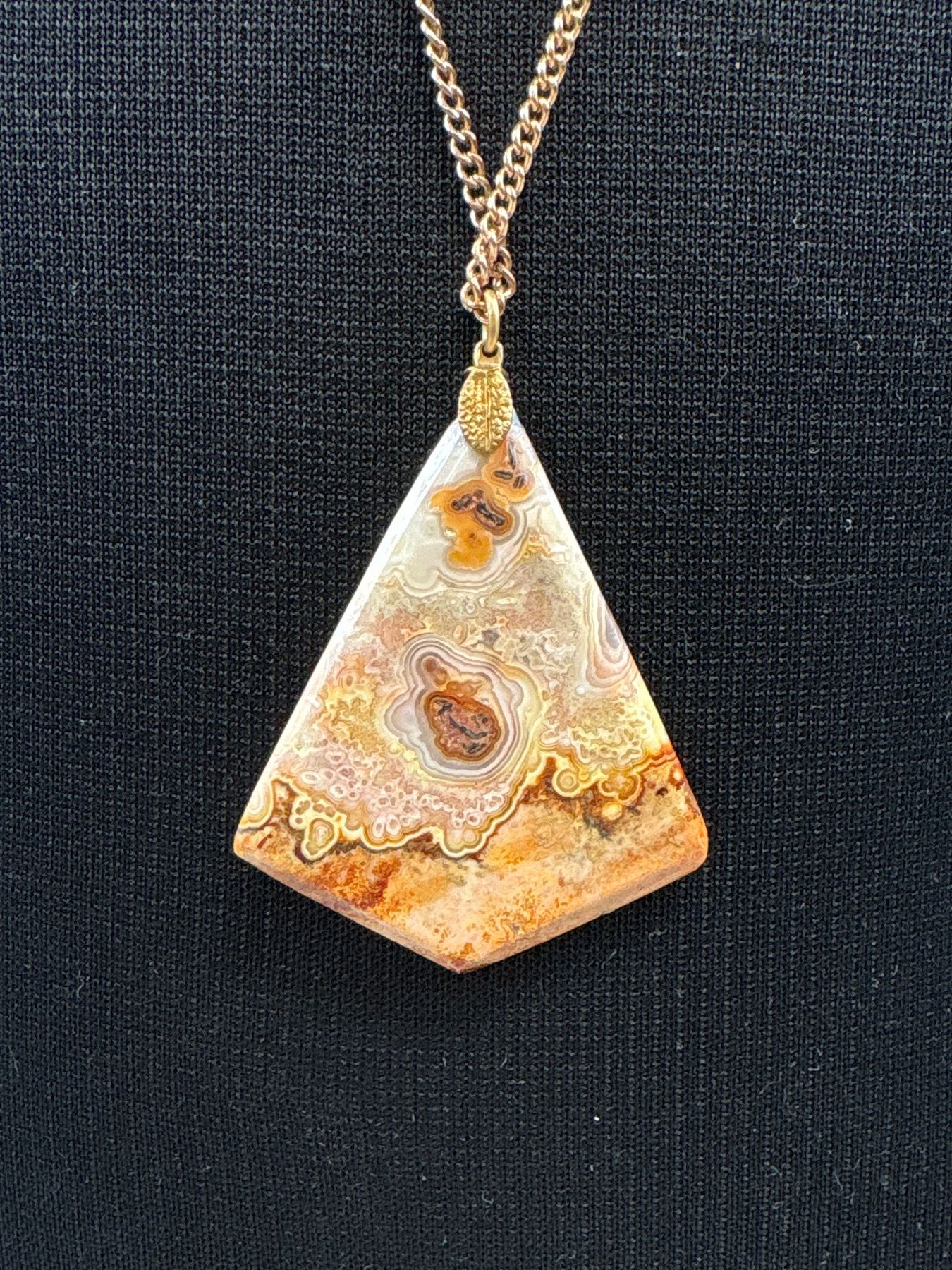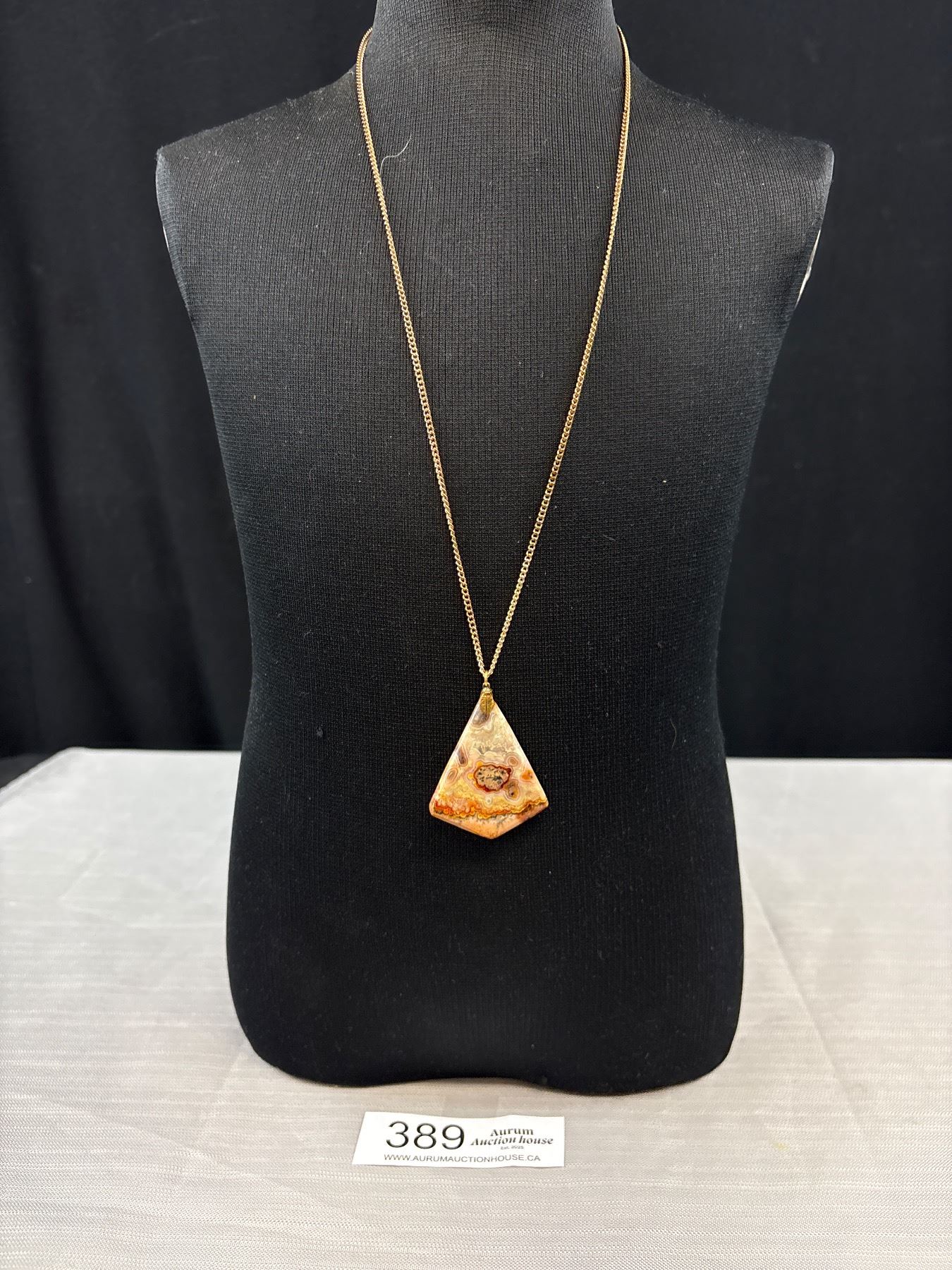 Vintage Large Lace Agate Stone Pendant w/ Chain Necklace
