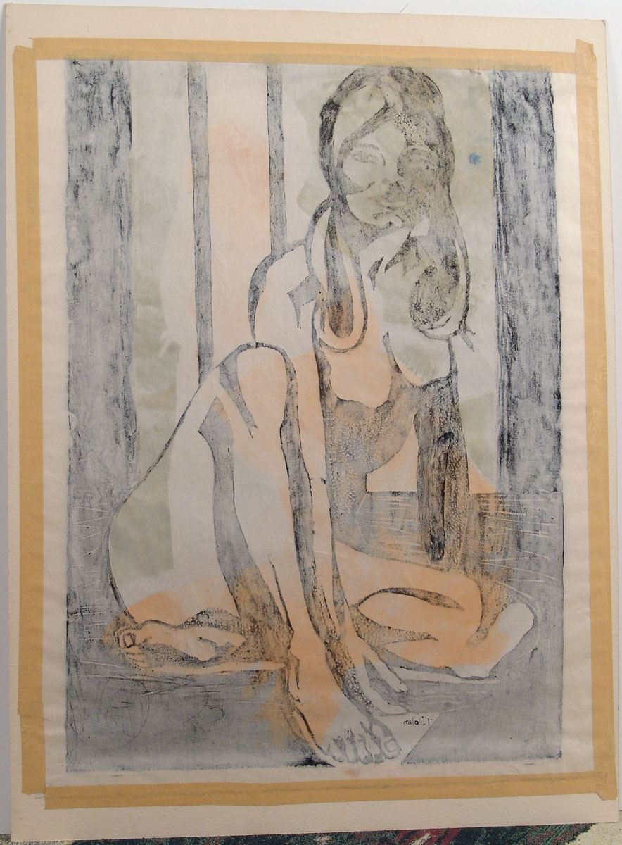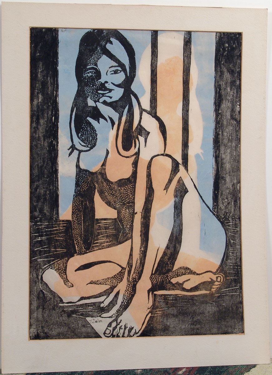 This is a large vintage (probably 1960s) mid-century modern pop art print featuring a stylized nude girl. We believe it is a screen print and it most likely is a one-of-a-kind piece. Signed by the artist "T Dolan." Attached to a mat. This piece will need to be shipped flat. SIZE: 21" x 28" including mat.