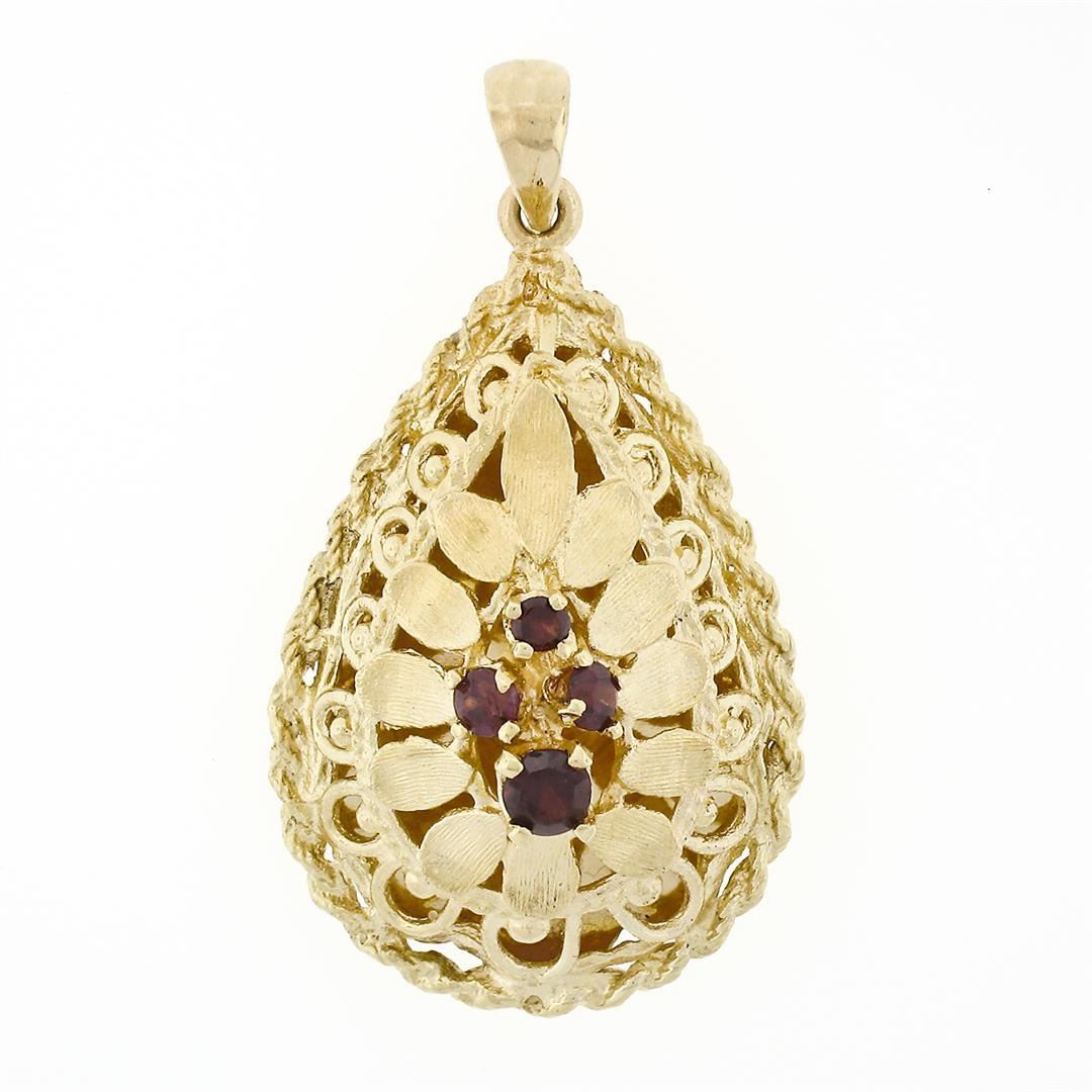 A vintage solid 14k yellow gold pendant, with 1 round cut garnet (3.61mm), and 3 round cut garnets (2.39mm). The pendant weighs a total of 7.71 grams, measures 41.41x22.43mm including the bail, and the inside of the bail measures 3.70x4.95mm.