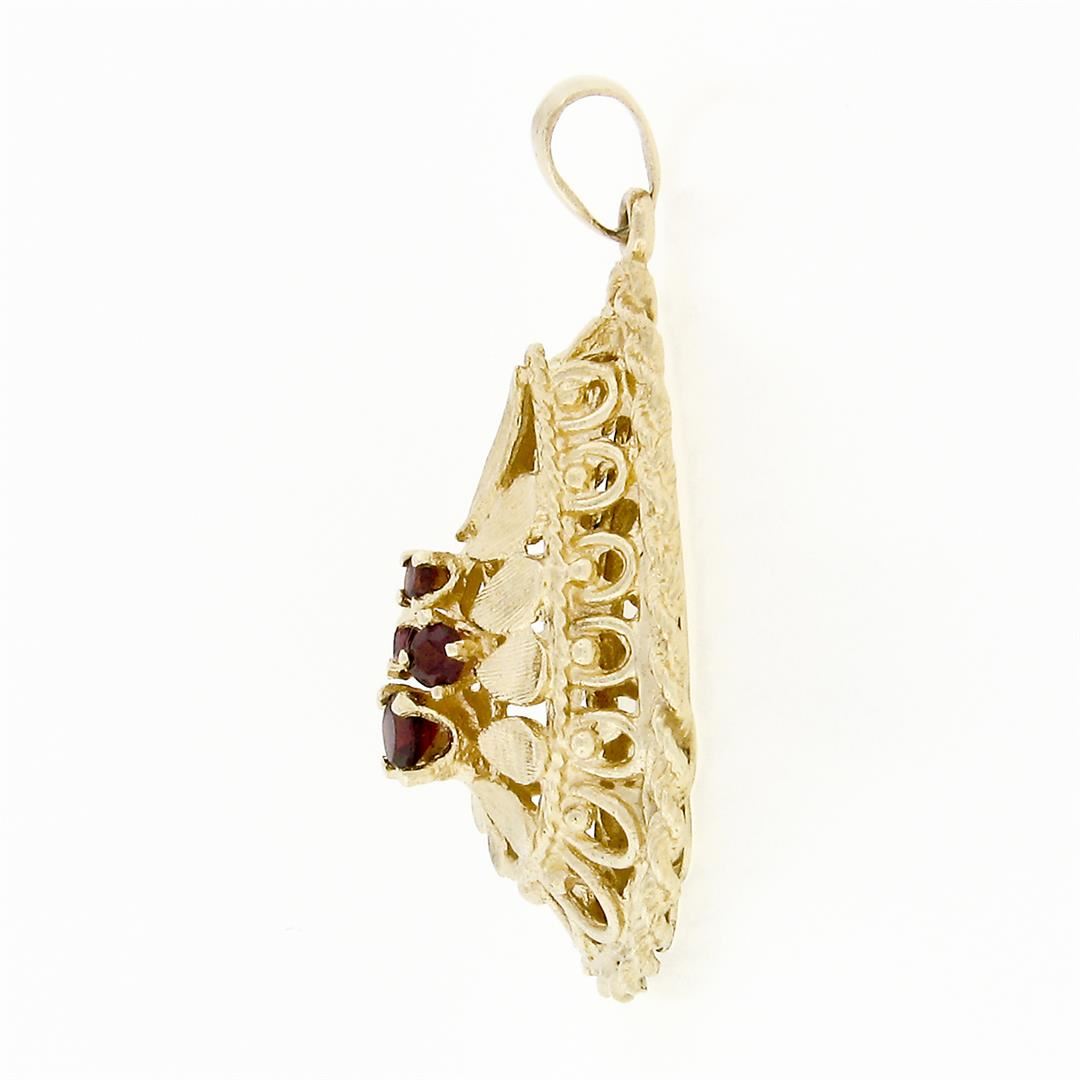 Vintage Large Textured 14k Gold .35 ctw Round Red Garnet Puffed Tear Drop Pendan
