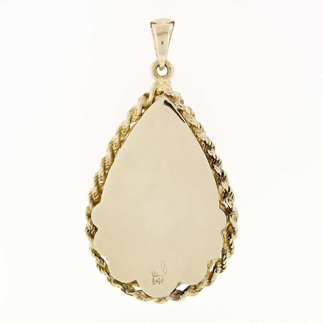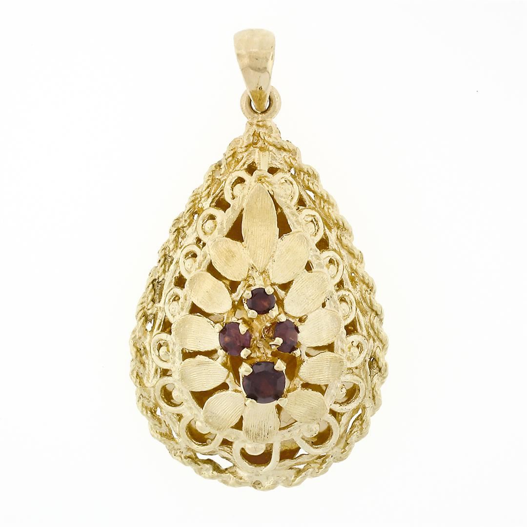 Vintage Large Textured 14k Gold .35 ctw Round Red Garnet Puffed Tear Drop Pendan