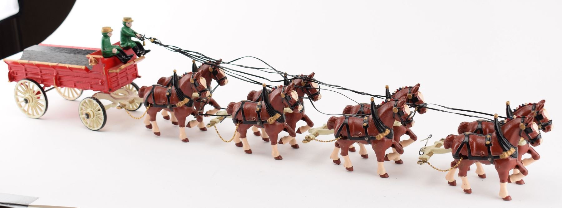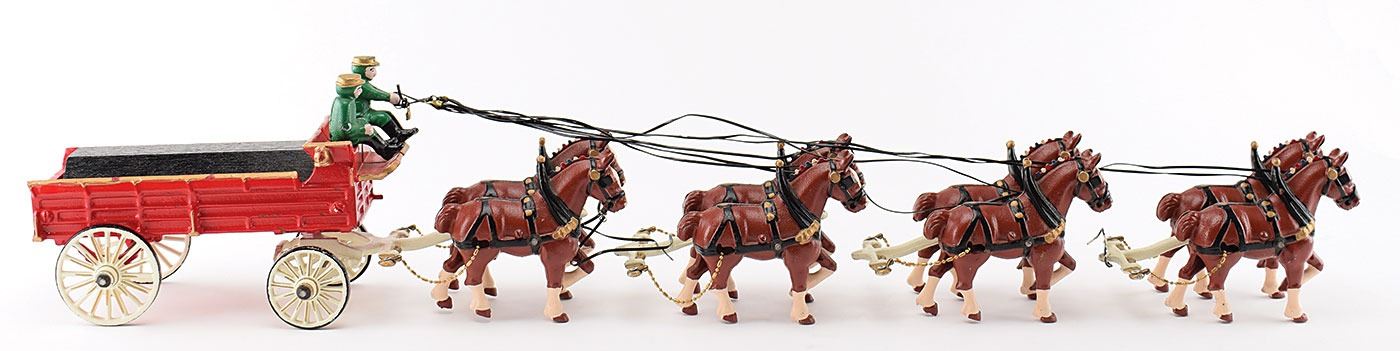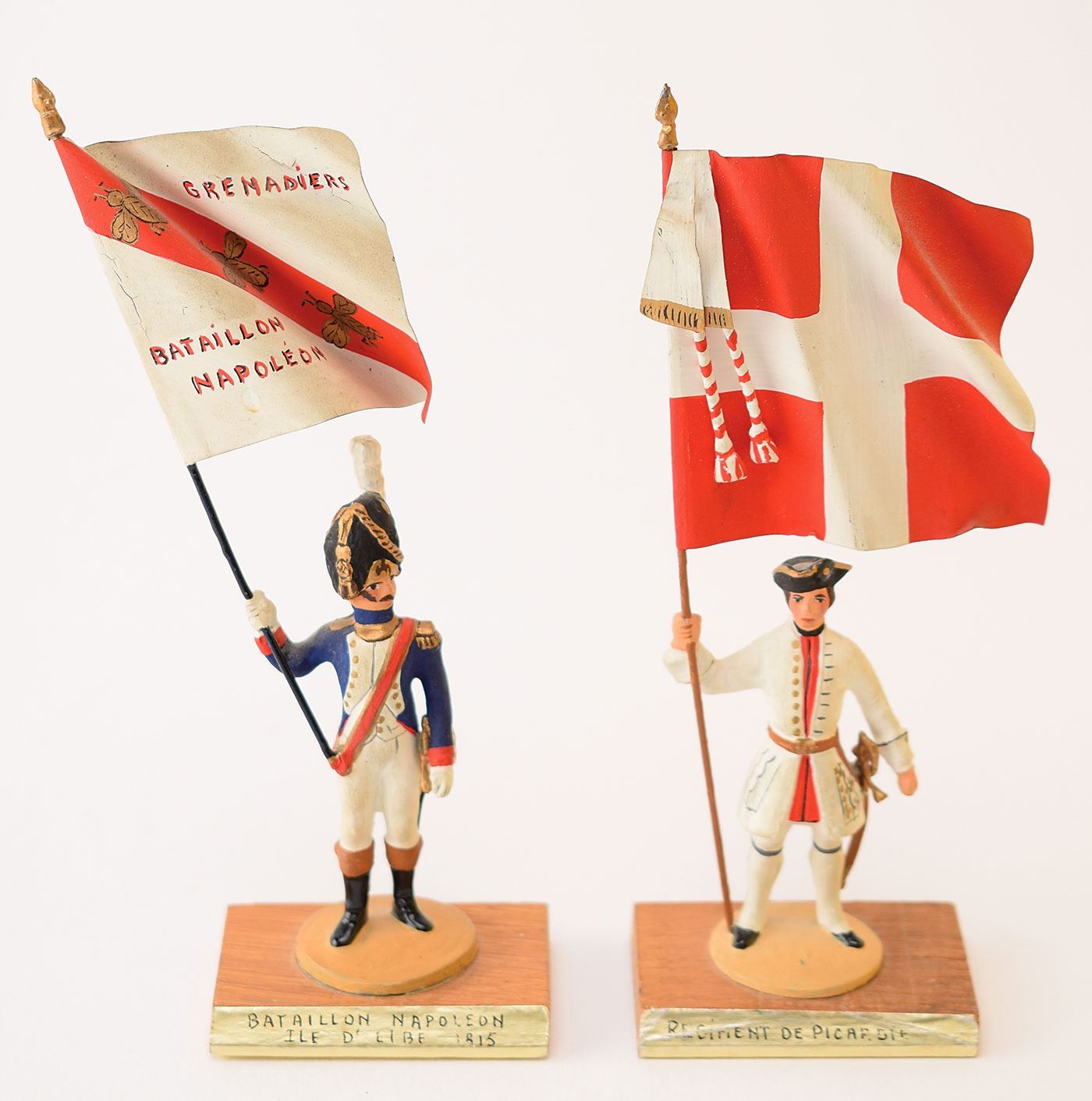 Mixed and incomplete collection of valuable vintage lead toy soldiers, including: seven horses, two riders, two carts, and two smaller French soldiers (marked on their bases as "Regiment de Picardie" and "Batallon Napoleon, Ile d'Elbe 1815"). Includes a bunch of small wooden barrels. In overall very good to fine condition.