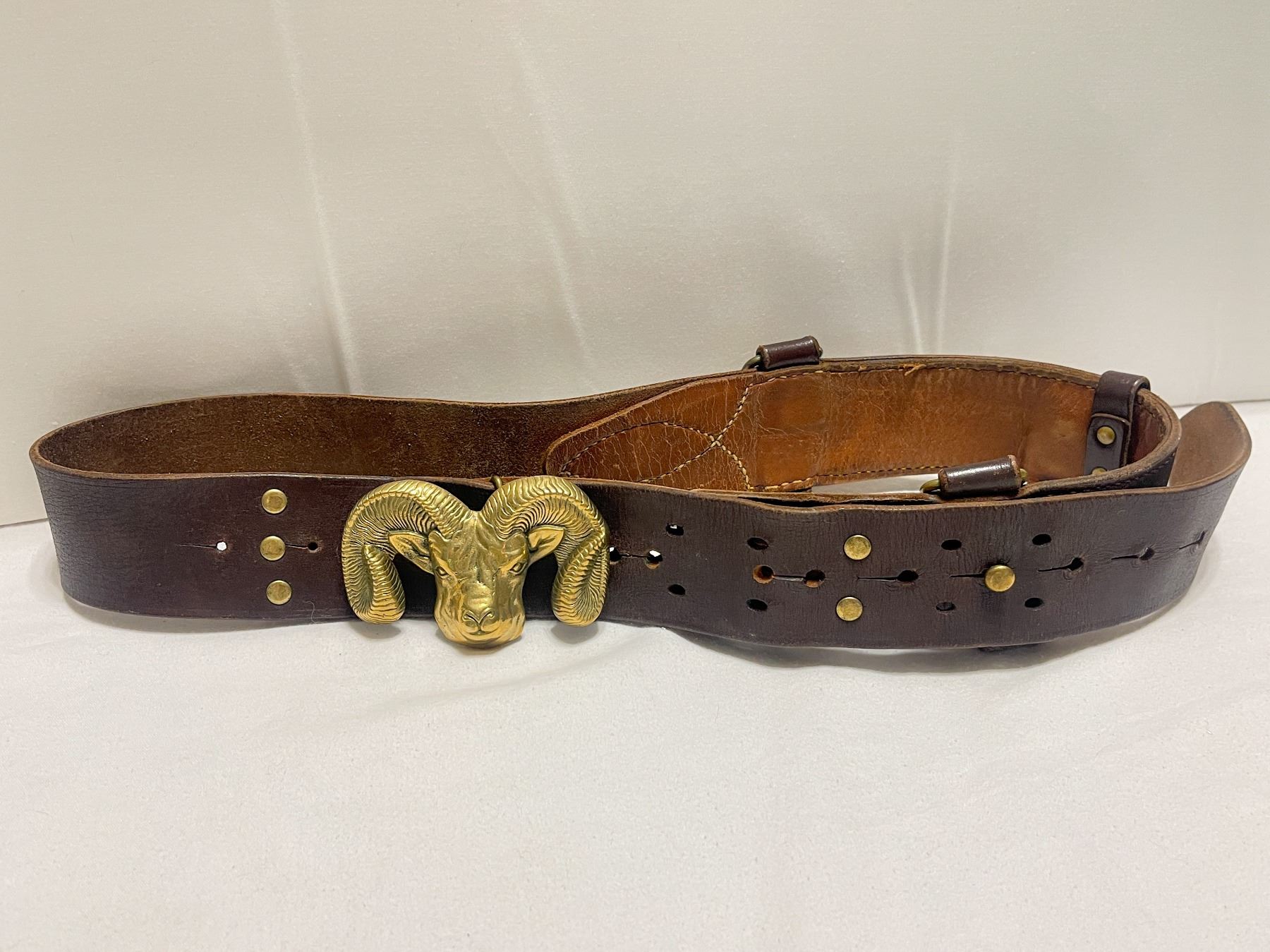Original leather Sam Browne belt featuring classic wide construction, reinforced stitching, and multiple brass D-rings for holster or shoulder strap attachments. The solid brass ram’s head buckle appears to be a later addition, replacing the original military-style clasp. Belt shows attractive age patina with minor wear consistent with use. A collectible piece combining authentic military craftsmanship with a unique decorative touch.