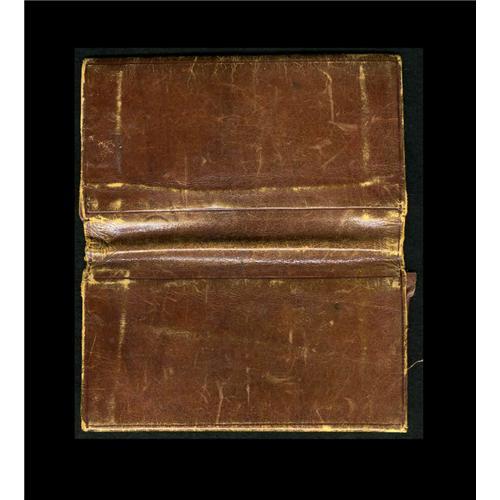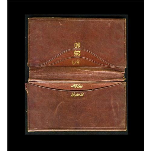 <B>Vintage Leather Wallet</B></I> This old leather wallet is in fine condition. There is gold foil stamping designating each compartment noted as 10, 25, 50, Notes, & Cards. An interesting piece from a bygone era.