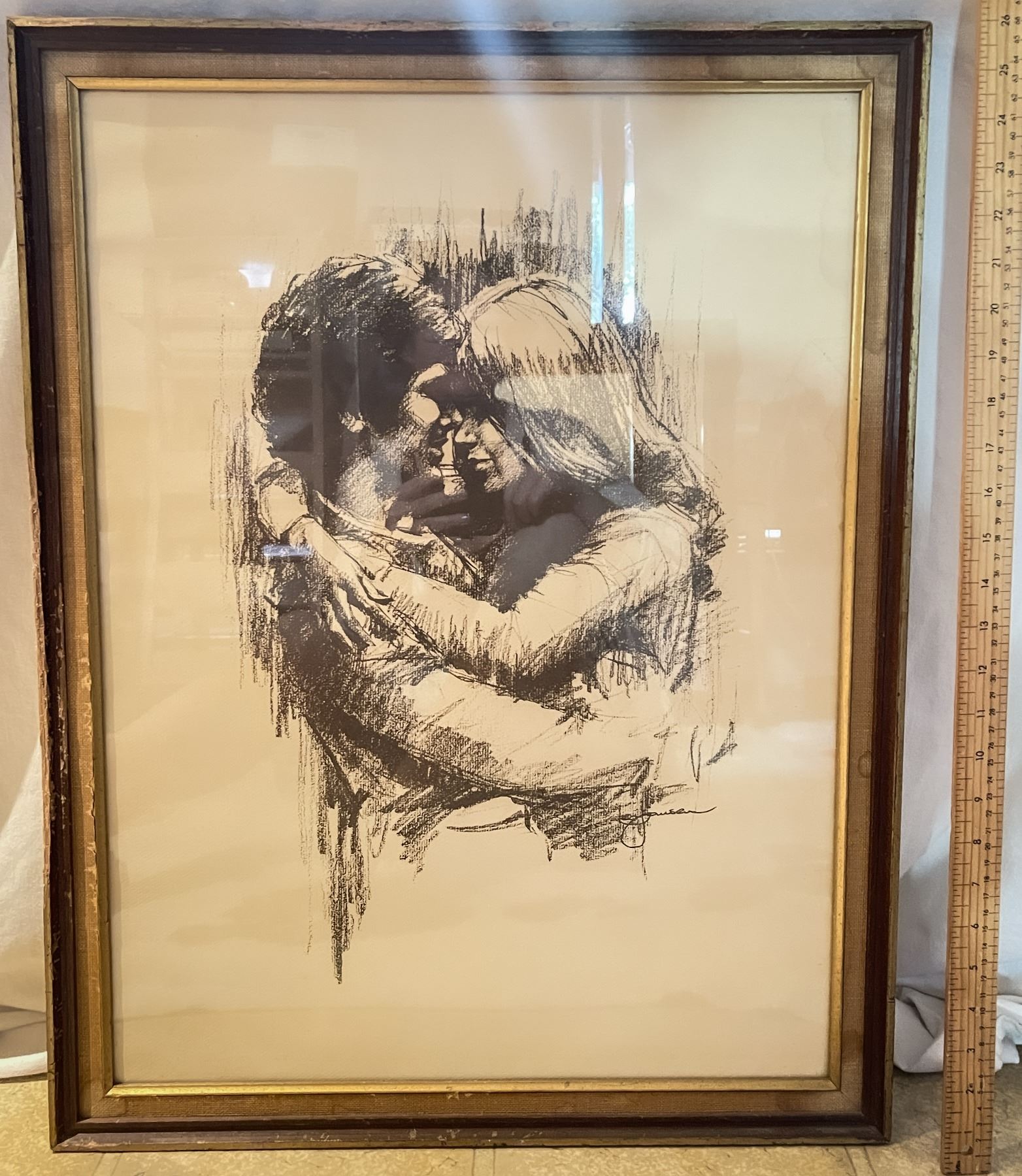 Large vintage print of Leo Jansen’s “Hugging,” depicting an embracing couple in Jansen’s expressive sketch style, housed in the original wood frame with gold trim. Leo Jansen (1930–1980) was a Dutch-American artist best known for his work as Playboy Magazine’s commissioned painter for 18 years, creating portraits of Playmates and celebrity nudes that graced the homes of collectors from Hugh Hefner to Judy Garland.