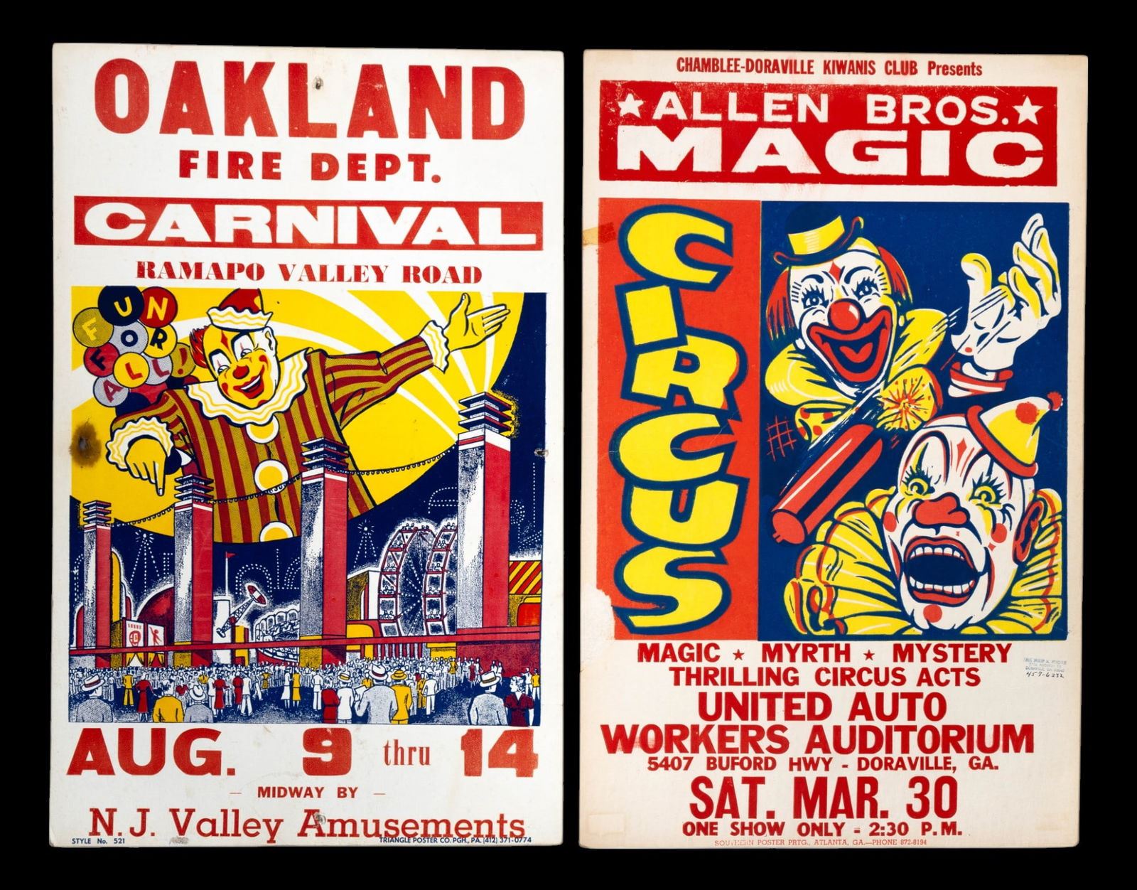 Oakland Fire Dept. Carnival poster by Triangle Poster Co. - measures approx. 14" W x 22" H. Allen Bros. Magic by Southern Poster Prtg. - has a personal information stamp on face of poster (see photos) Posters have some wear and loss consistent with age and use.