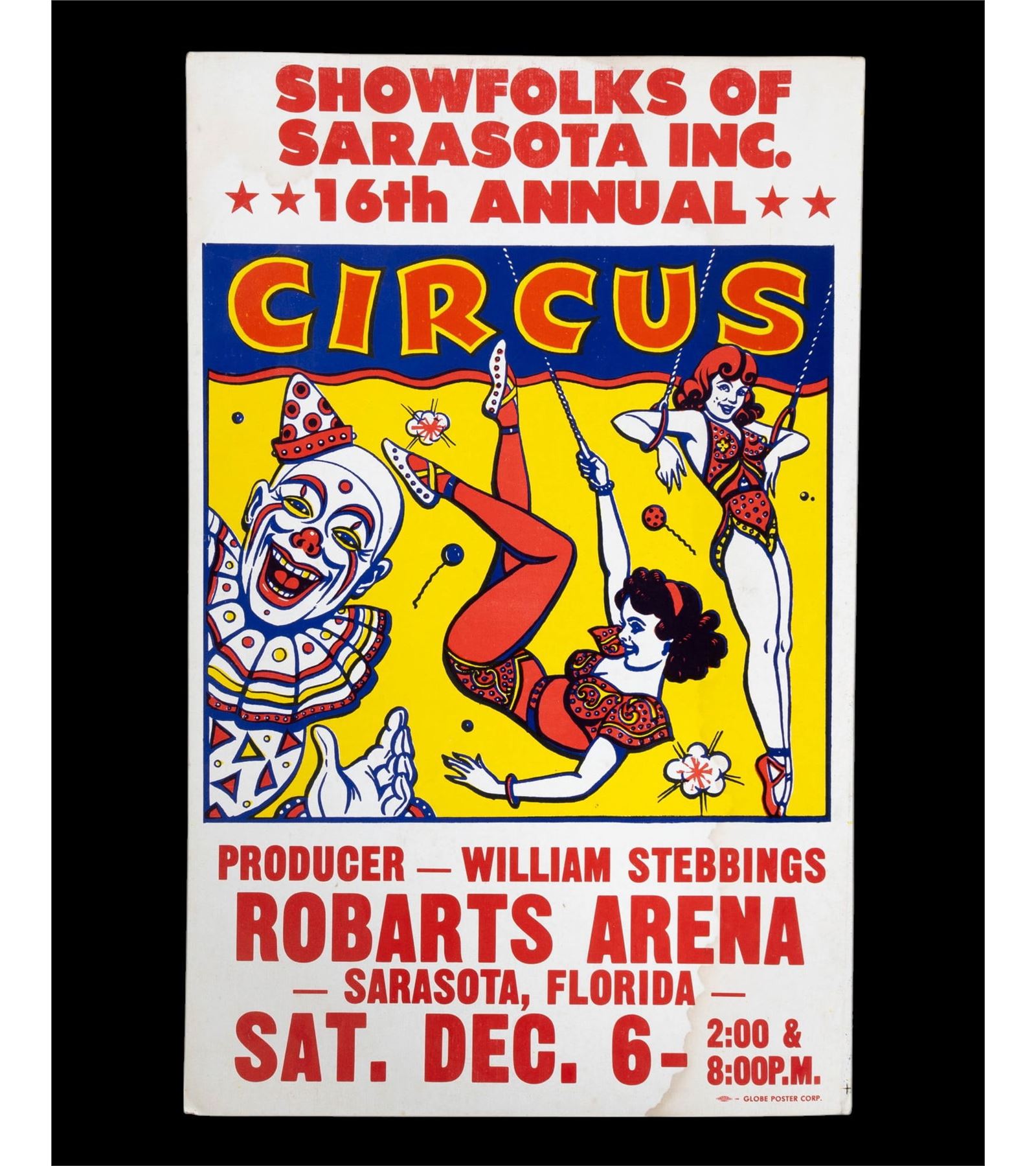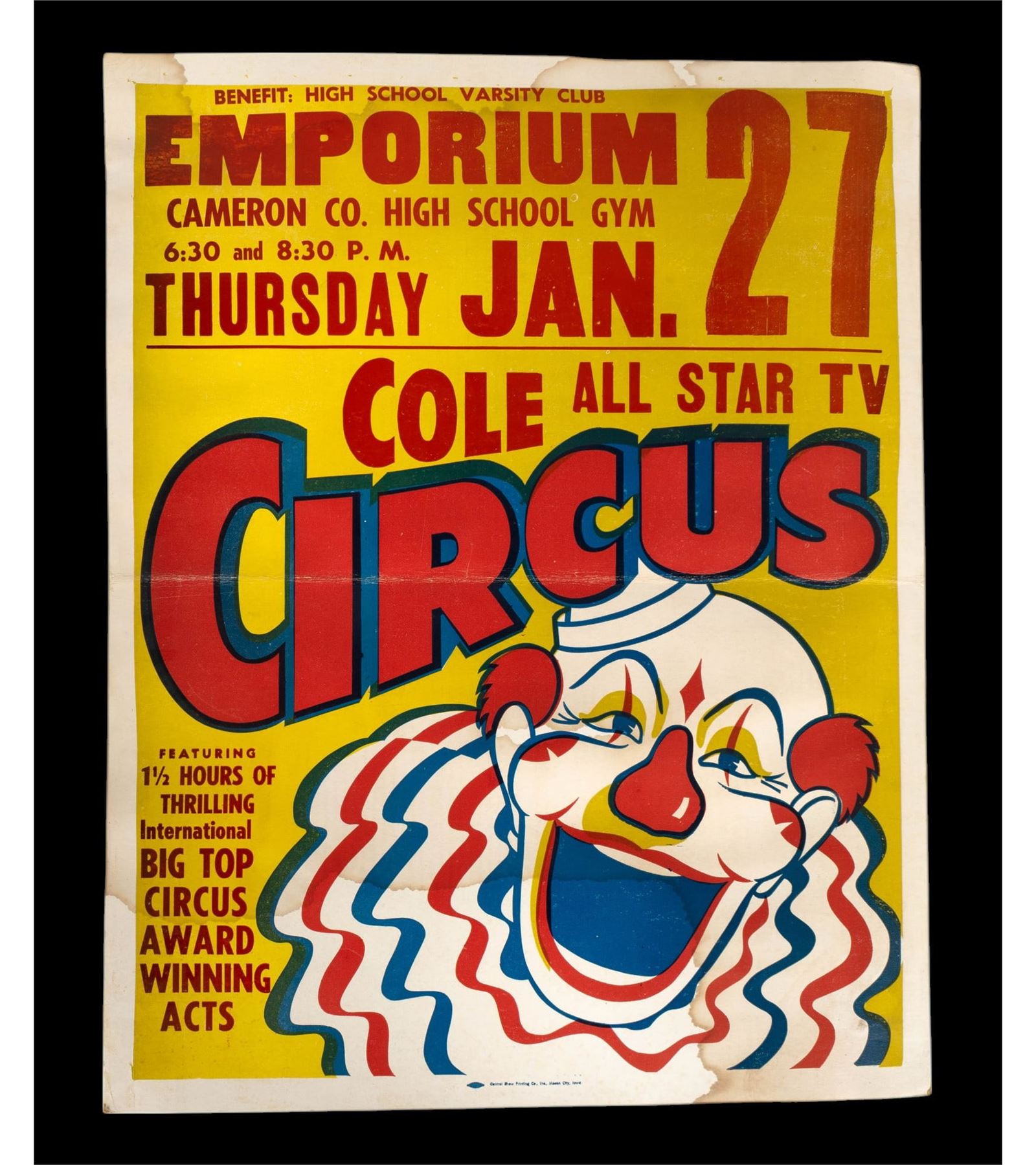 Large Cole All Star TV Circus poster by Central Show Printing Co. - measures approx. 22" W x 28" H. Showfolks of Sarasota Circus poster by Globe Poster Corp. Both posters have some wear and discoloration consistent with age and use.
