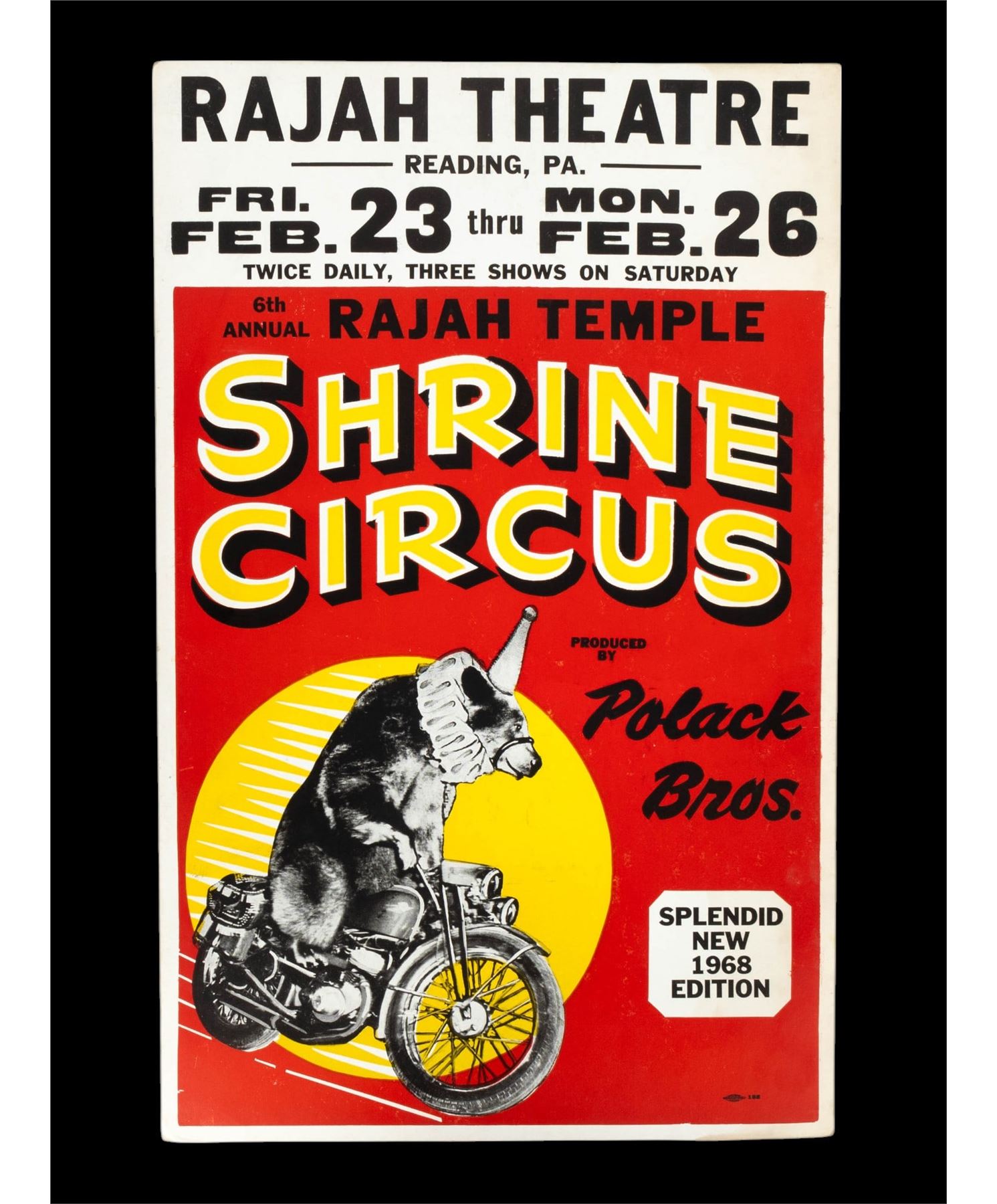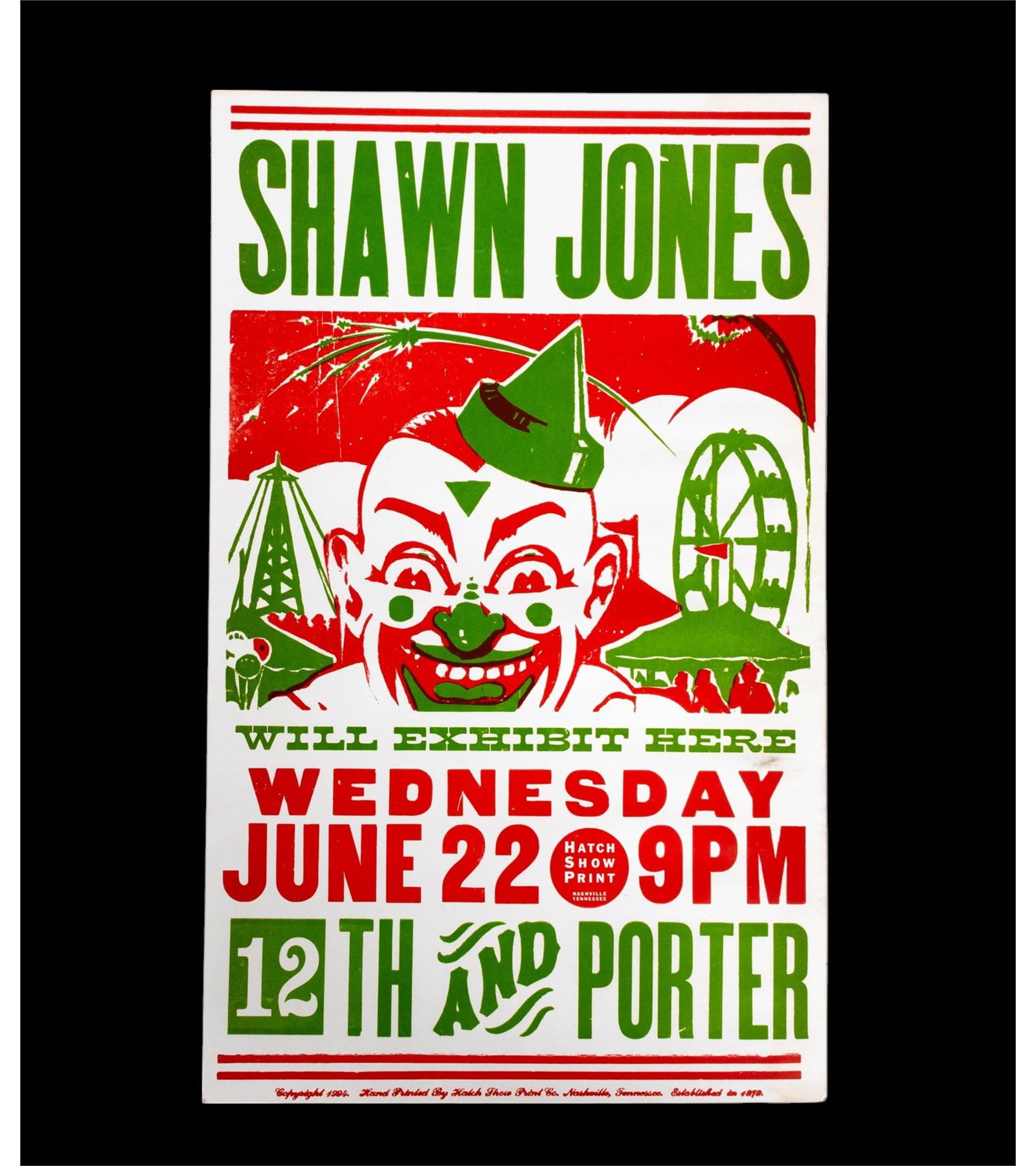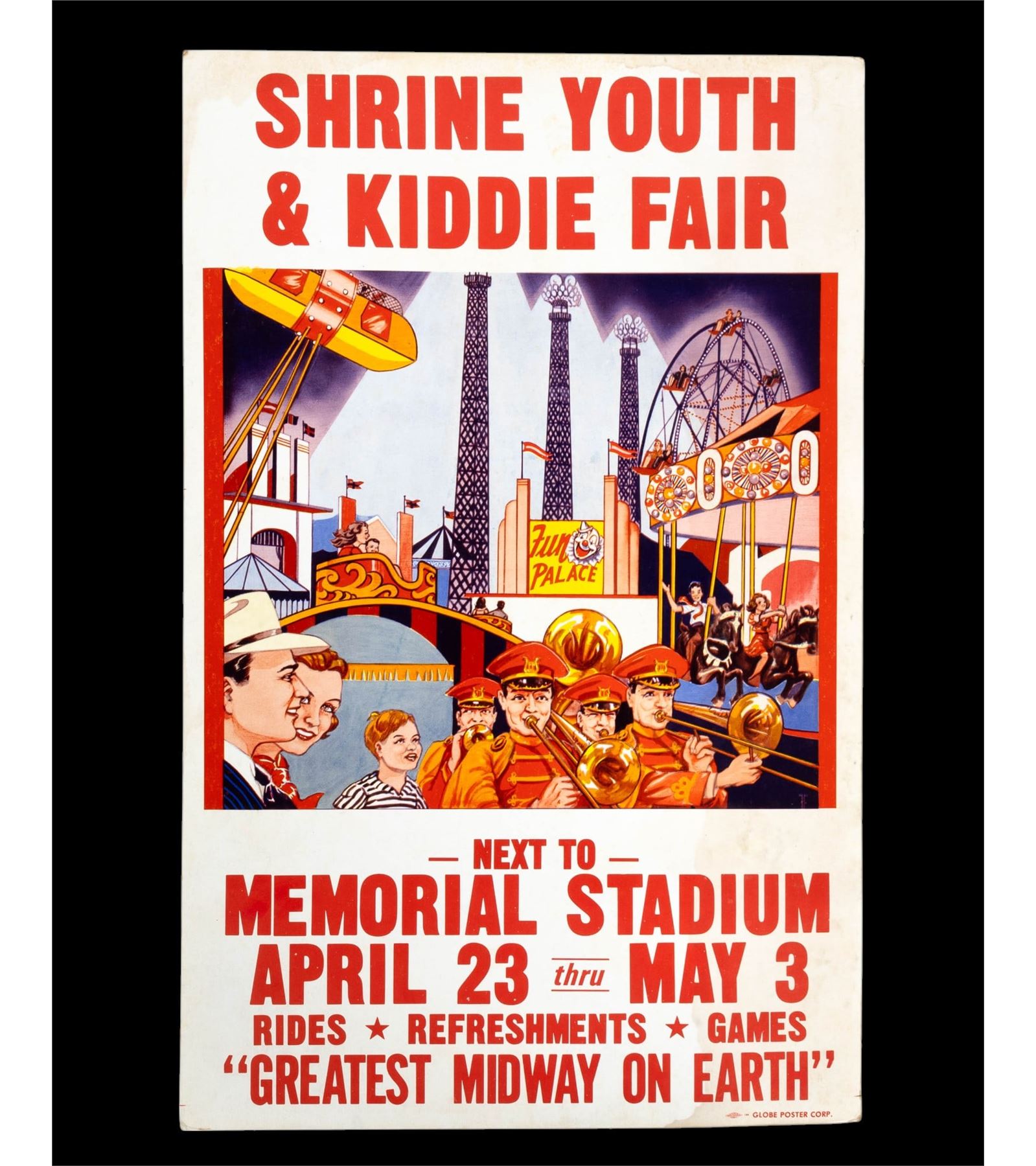 Shrine Youth & Kiddie Fair silkscreen and letterpress poster by Globe Poster Corp. with some wear and discoloration - measures approx. 14" W x 22" H. Rajah Temple Shrine Circus letterpress and silkscreen poster with bear on motorcycle motif. Shawn Jones exhibit poster with clown / circus art by Hatch Show Print Co.