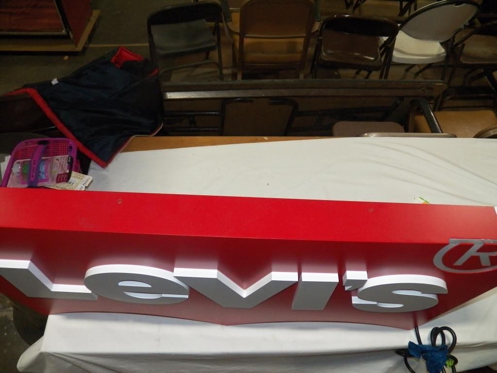 Electric Levi Store Display sign approx 48" long x 20" tall x 5" deep including mounting brakets.This sign is new in box only taken out for picture to be taken
