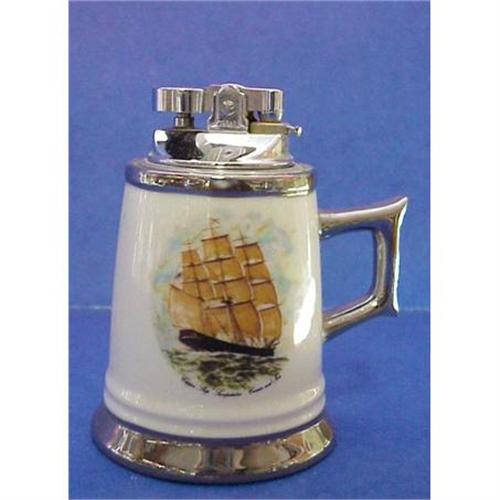 Lovely vintage figural lighter, it comes in the shape of a beer mug - Made from chrome and porcelain and adorned with two beautiful pictures, clippers "Sweepstakes" by Currier and Ives - Made by Colibri Japan - It seems to be in very good condition - and lighter seems to be in working condition - It stands 4 1/4" high - Buyer to pay 6.00 for ship.+ insce. - Please pay via Paypal - Thanks!
