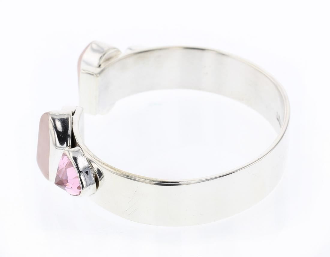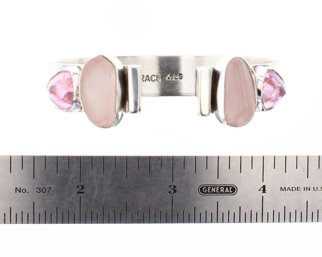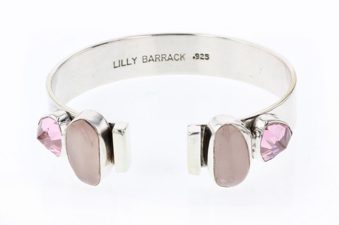 Sterling Silver | Genuine Quartz & Pink Shell | Vintage Lilly Barrack Pink Shell & Quartz Cuff Bracelet | Lilly Barrack Southwest New Mexico | Weight:39.8 Grams, | Dimensions: Bracelet: 5.75" inner, .5" gap, 6.25" total, .5" face width, 8mm x 16mm center stones | Signed: Lilly Barrack