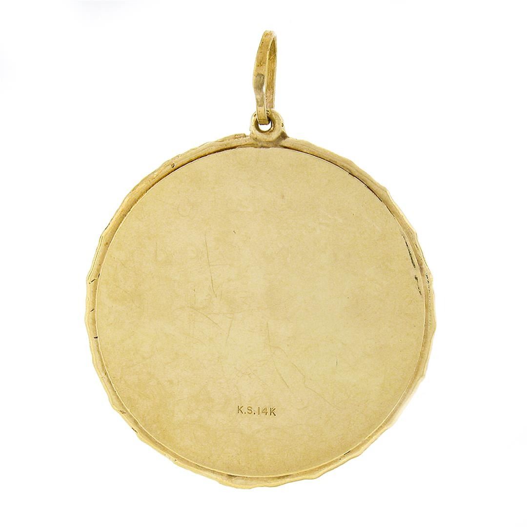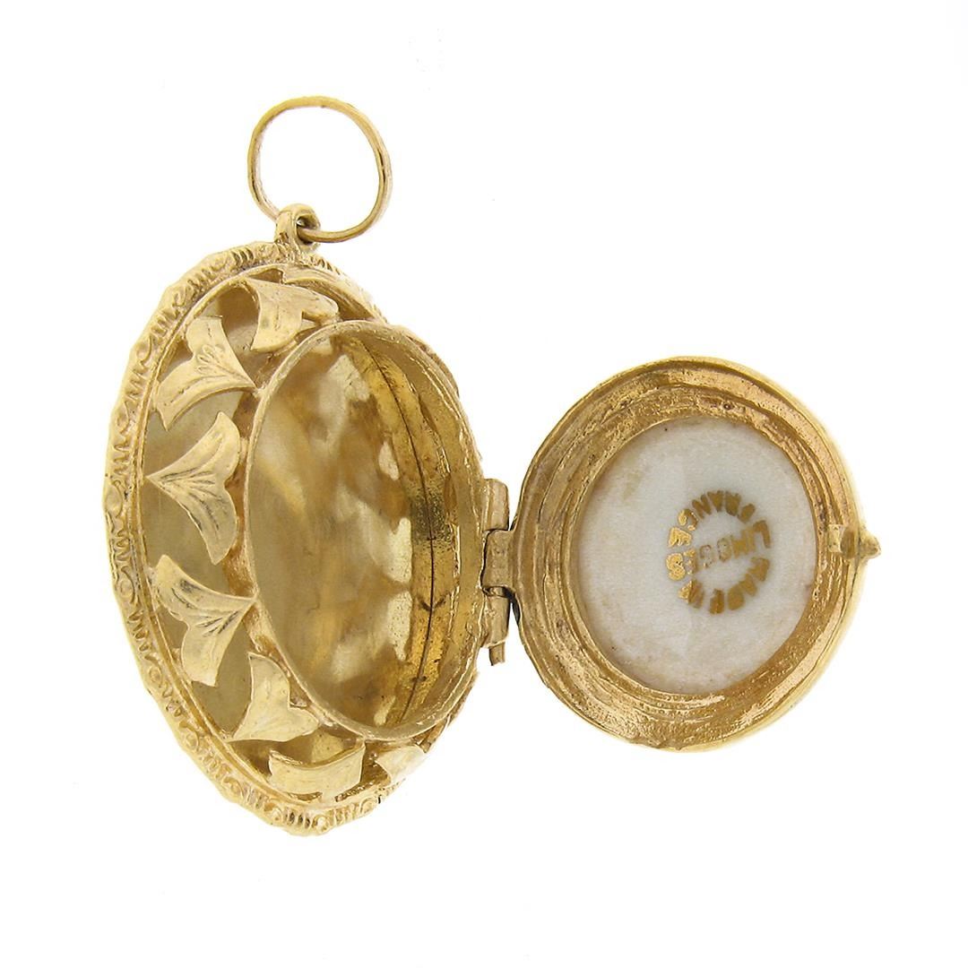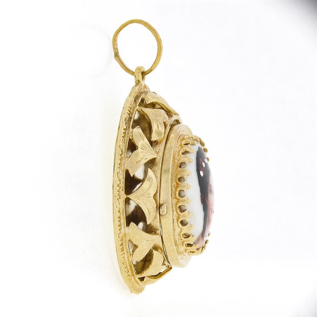 A solid 13k yellow gold limoges french painted portrait locket pendant. The pendant weighs a total of 15.0 grams, measures 43.80x34.20mm including the bail, and the inside of the bail measures 7.5mm.