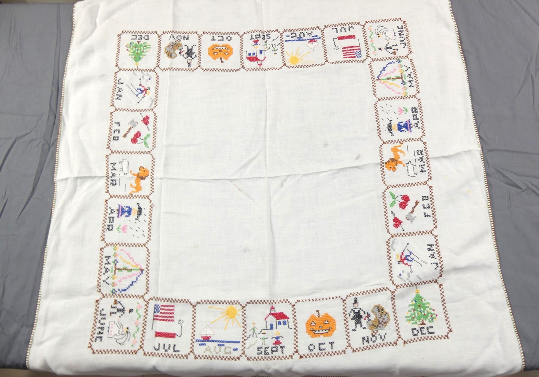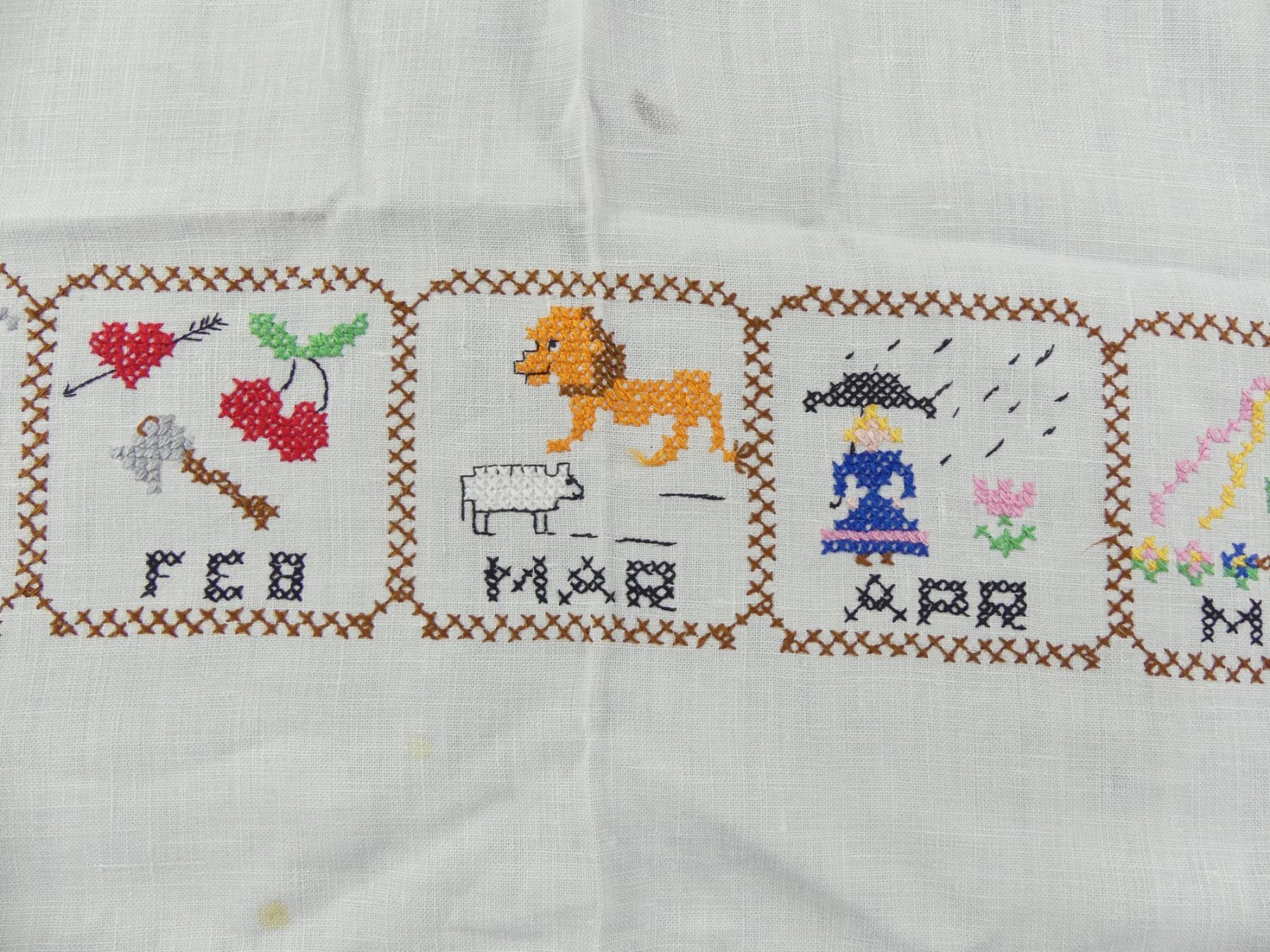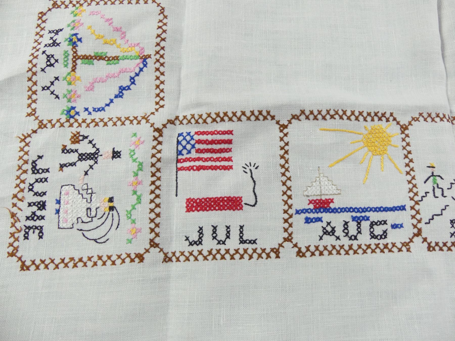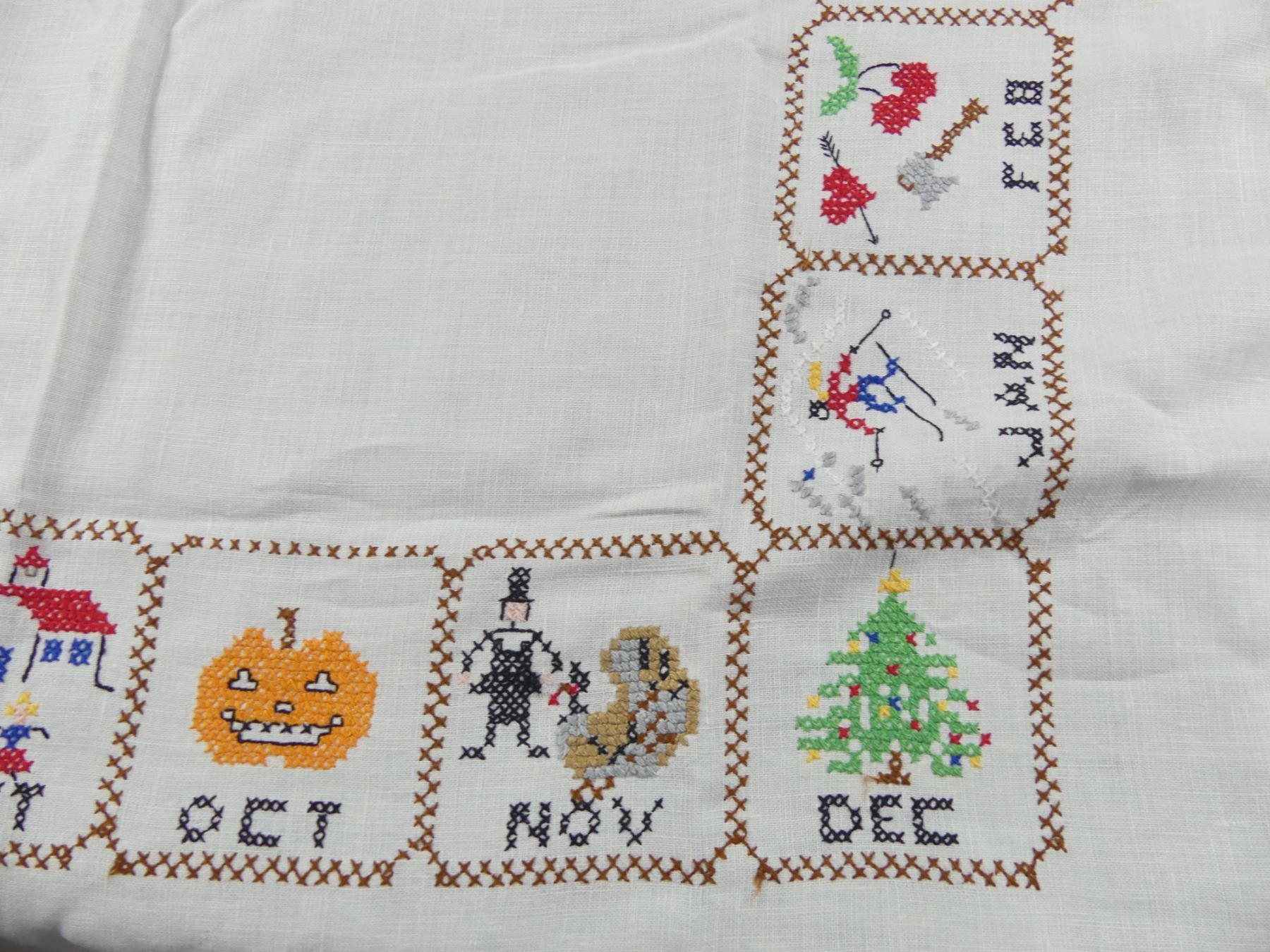 Vintage Linen Embroidered Cross Stick Calander Tablecloth