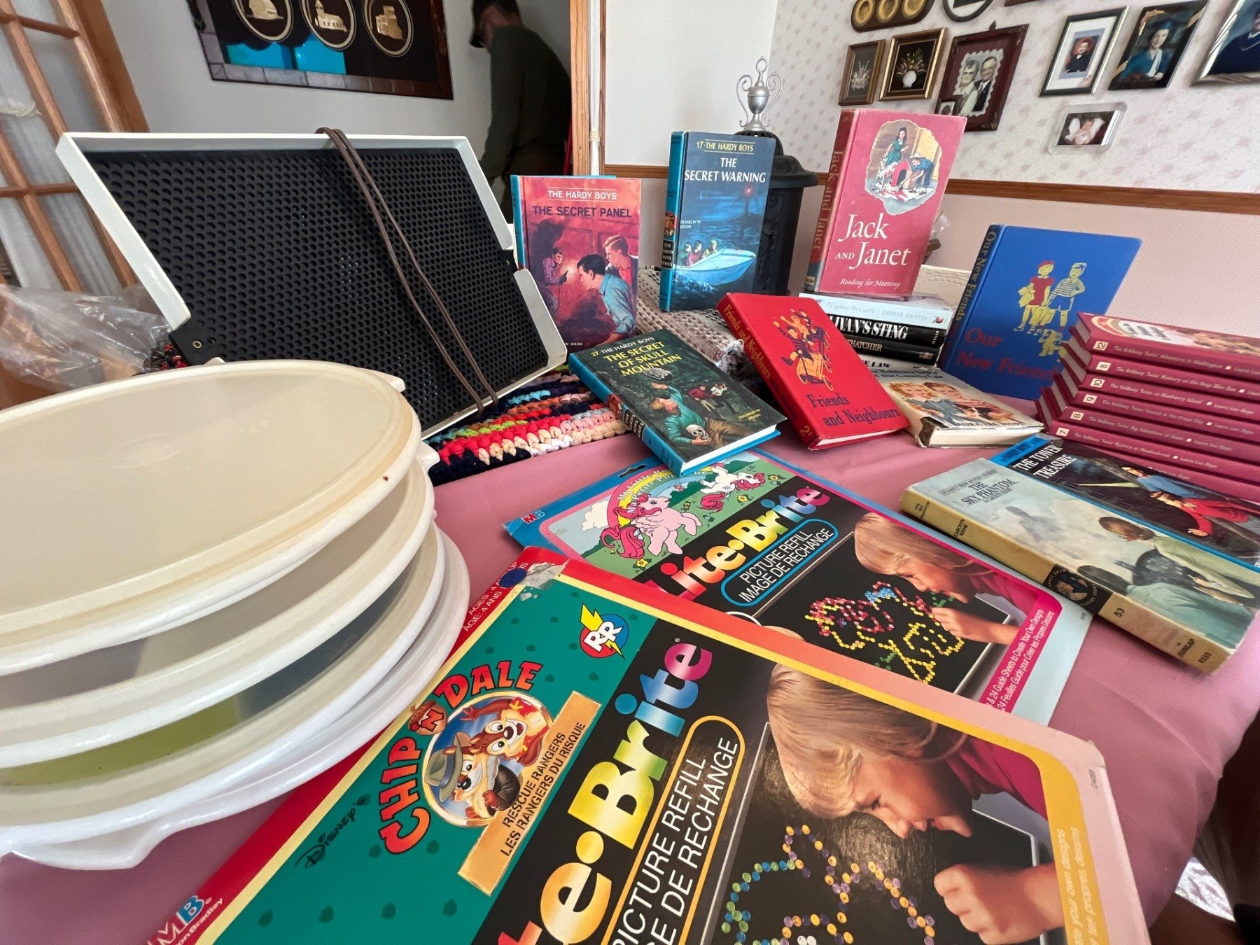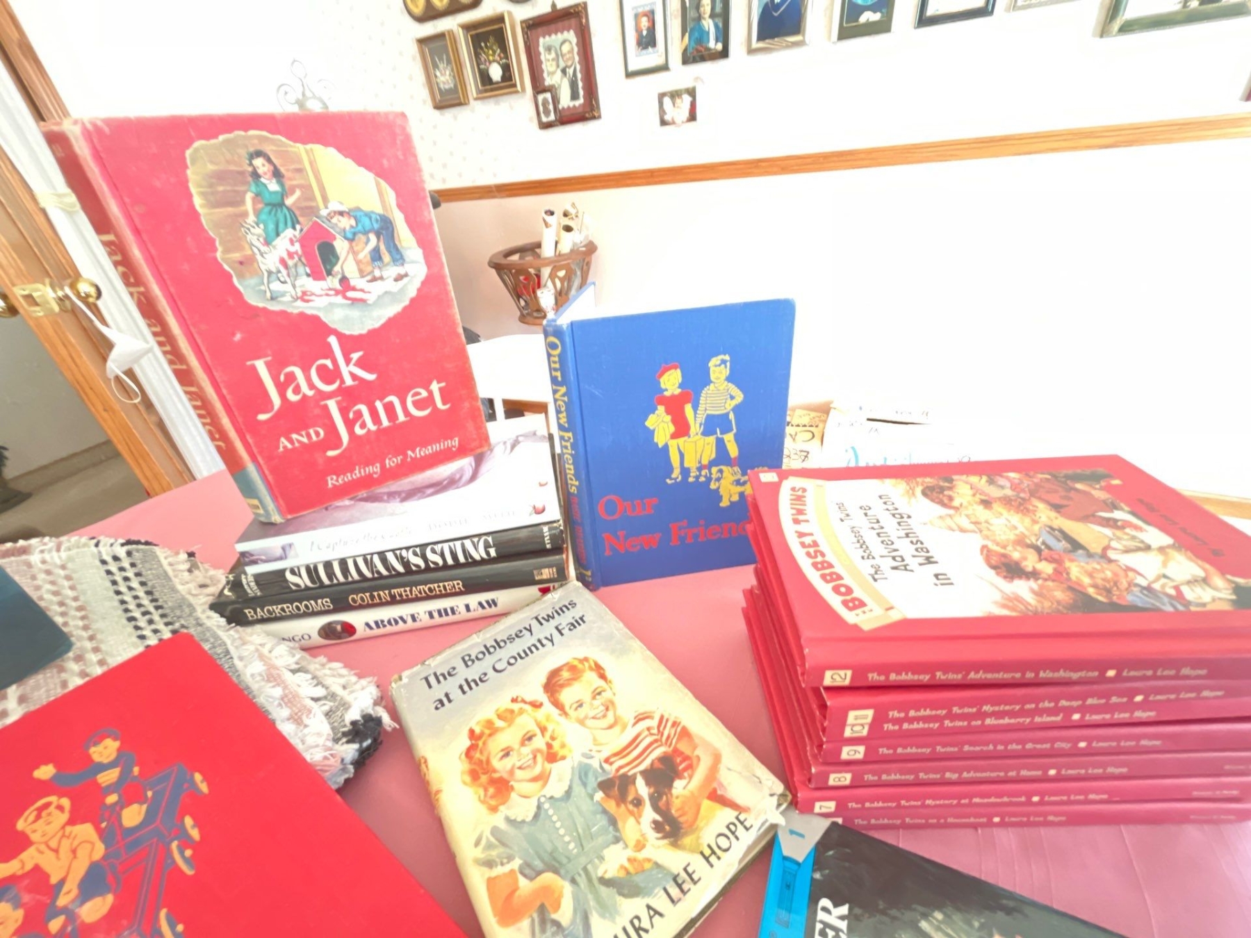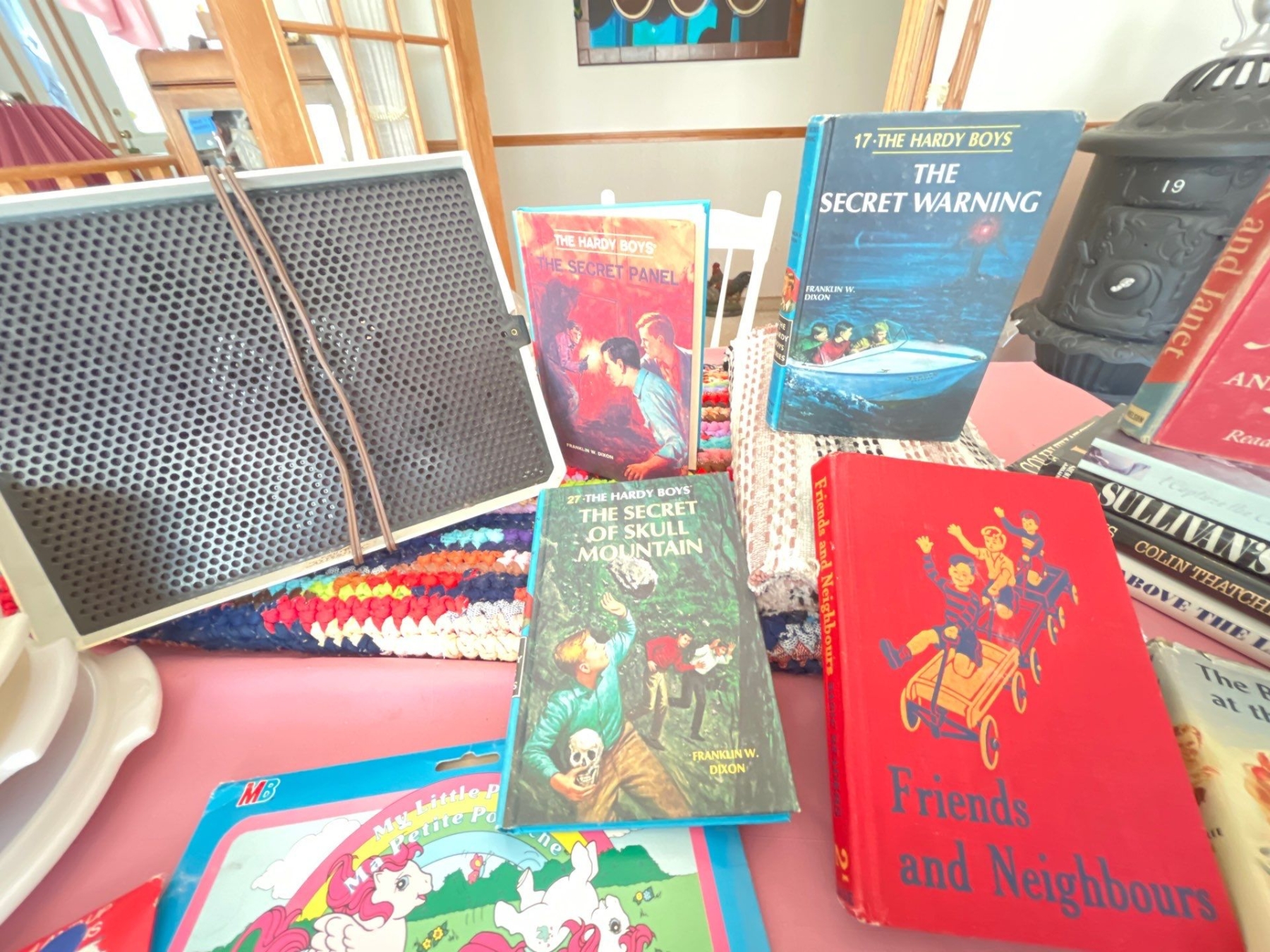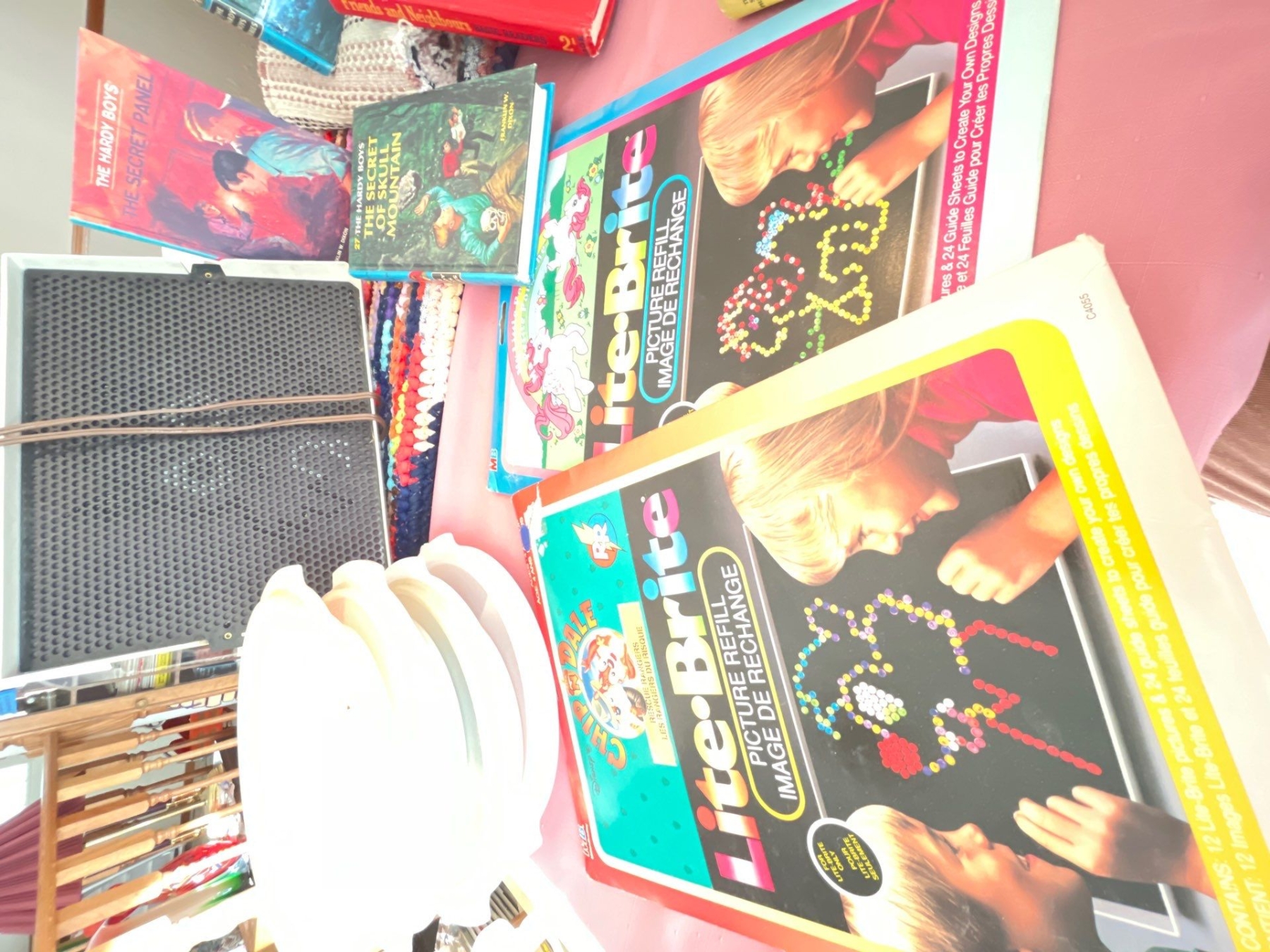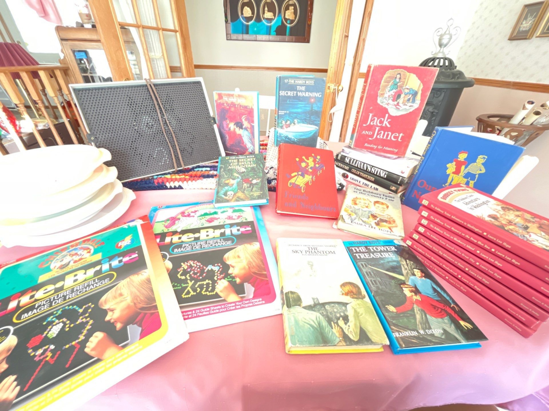 Vintage Lite-Brite with two packs of unused light, bright design paper and a selection of vintage hardy boy, books, Bobbsey twins, and friends and neighbors. Including had made rugs and placemats.