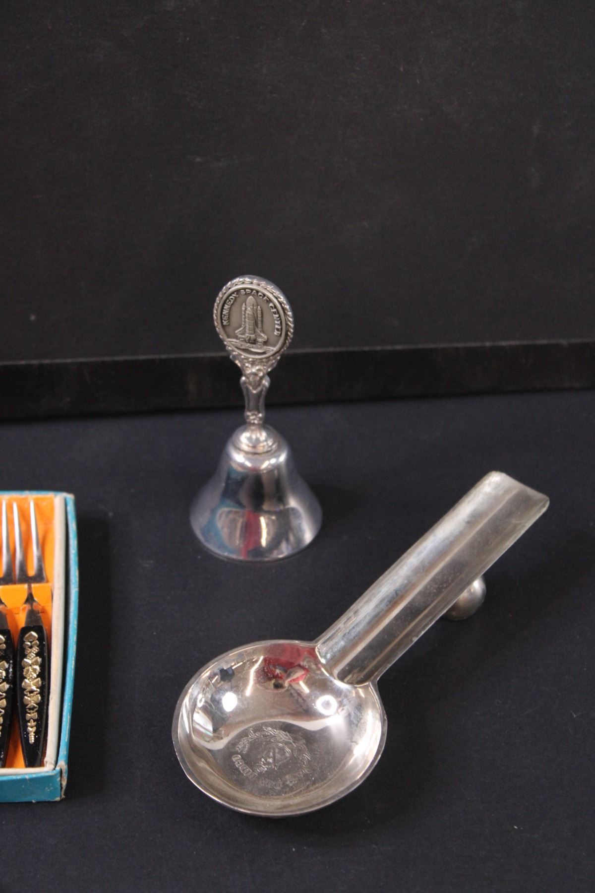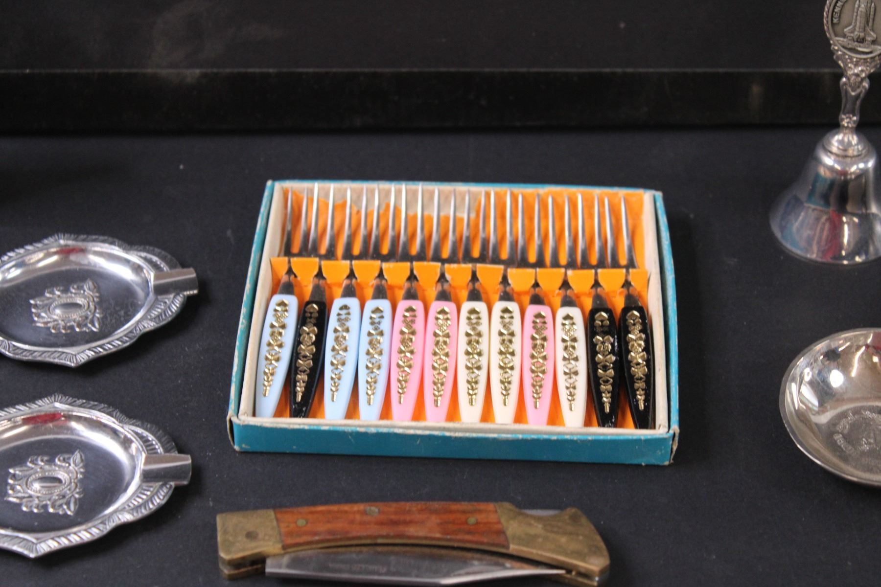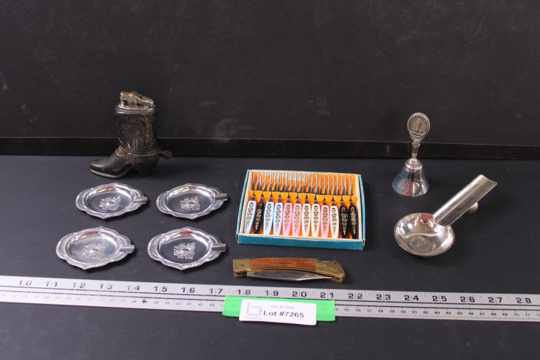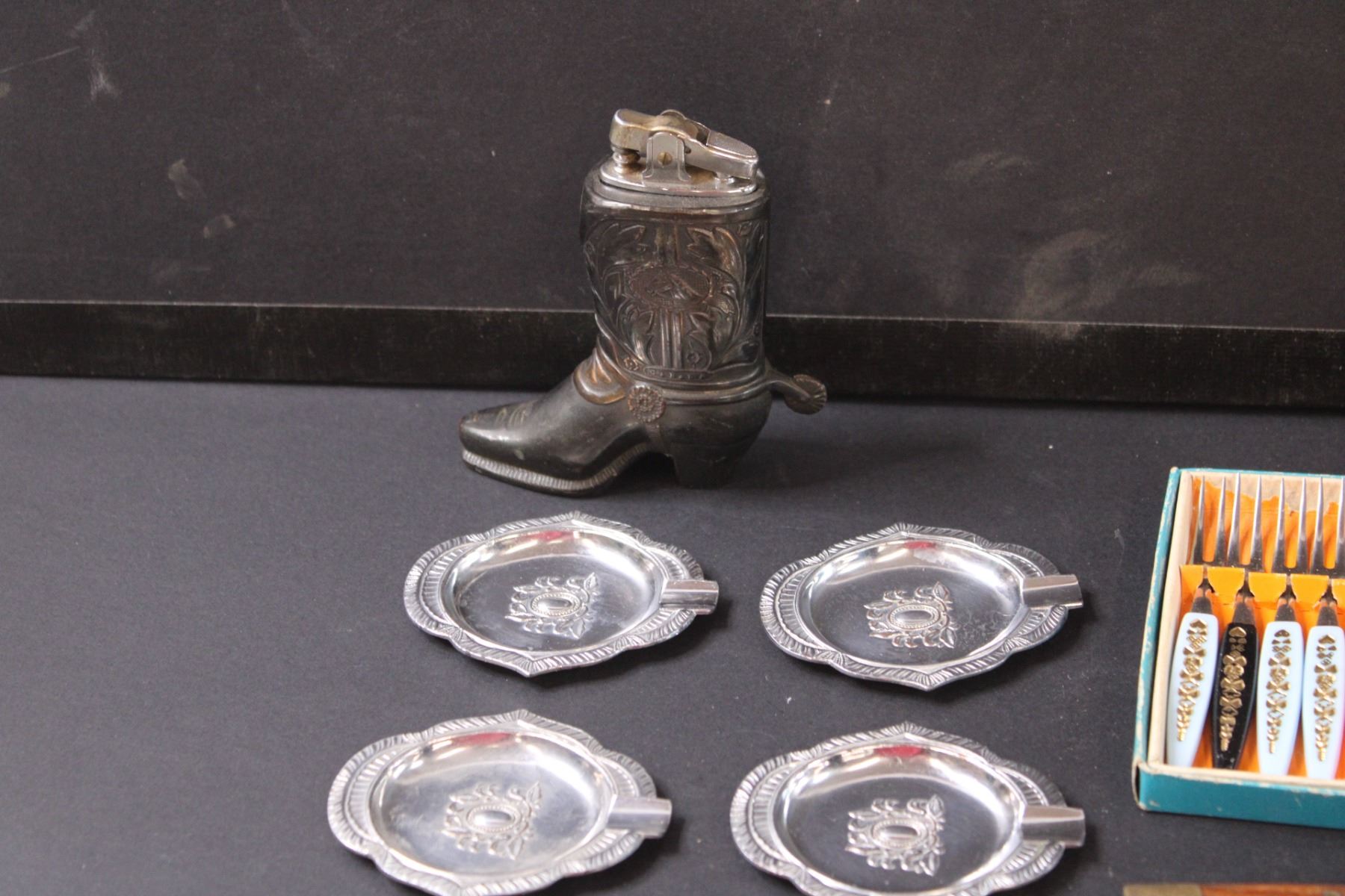 Vintage Little Forks Set, (5) Spoon Trays, Folding Hunters Knife, Cowboy Boot Lighter, Bell