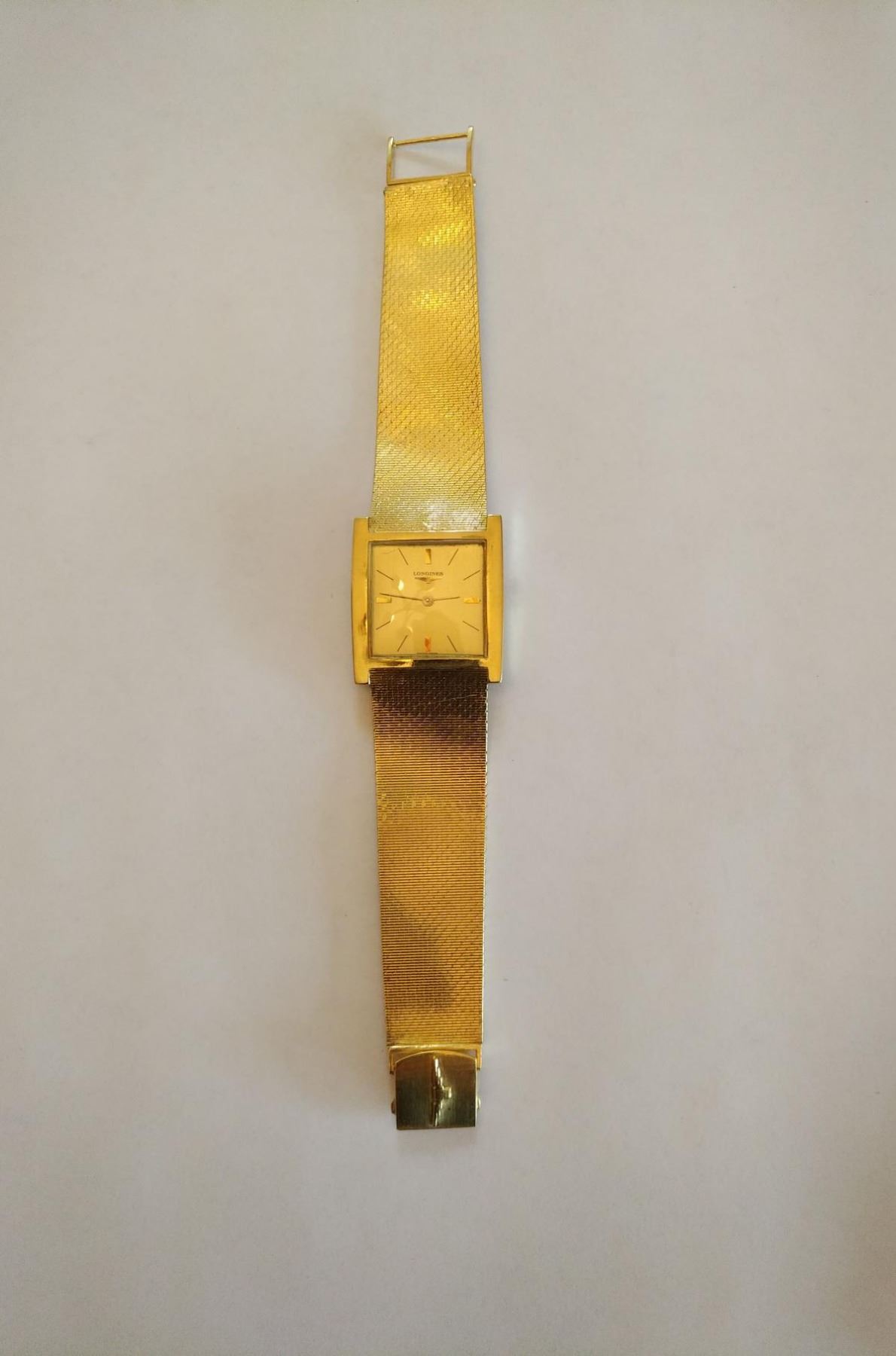 1966 Longines .... (unisex) Watch;Serial # 13686031;Manual Wind;18 K GOLD CASE;18 K GOLD Unique thin mesh strap;17 Jewel;79 Grams weight;3 Grams (2 extra links) Recently professionally cleaned & serviced;1 owner estate sale;Bought new in 1966 at the Longines manufacture facility; Recently serviced and bill is attached. Works fine.
