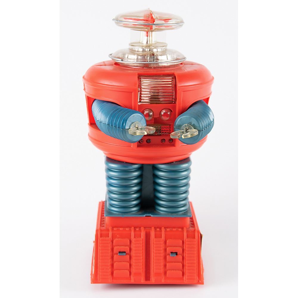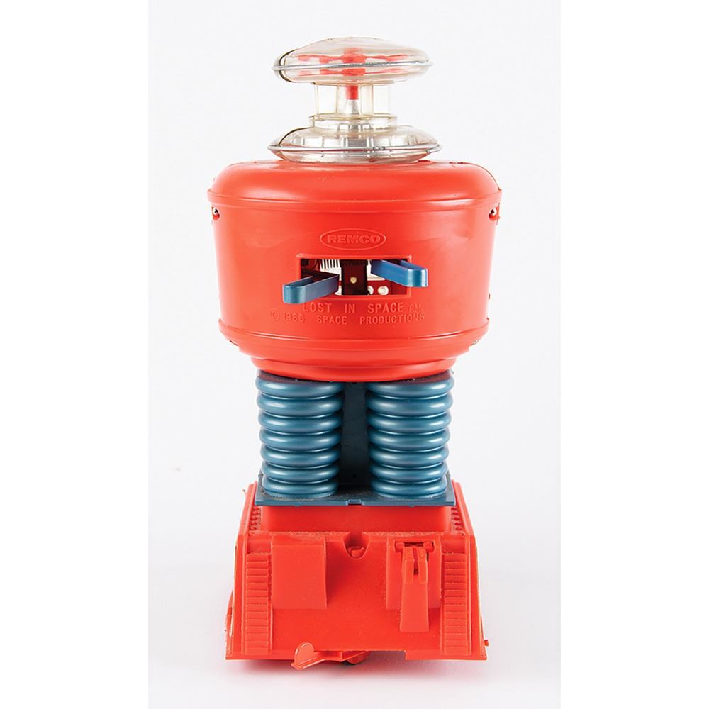 Vintage circa 1966 battery-operated "Lost in Space" toy robot, made in the U.S.A. by Remco, standing at 12Àù tall. The robot features a red-and-blue plastic body; clear head, hands, and chest; and retains its colorful decals on either side. Exhibits a few cracks to plastic on its head and chest. Includes its Remco "Motorized Robot Style No. 760" instruction sheet and heavily worn original box (reinforced with masking tape in several places), advertising the robot's actions: "Moves Forward, Working Arms, Lights Blink, Body Turns."