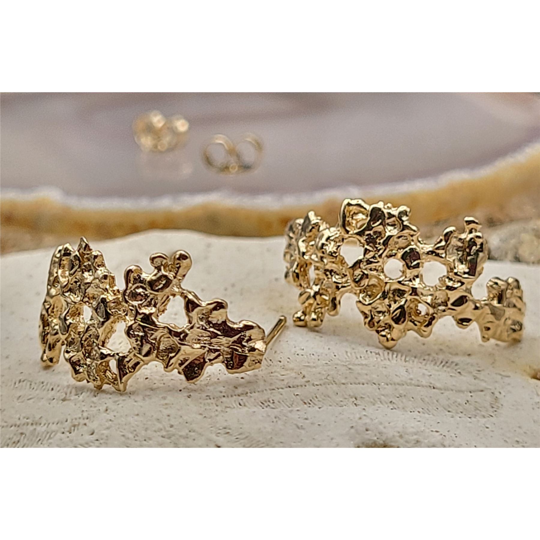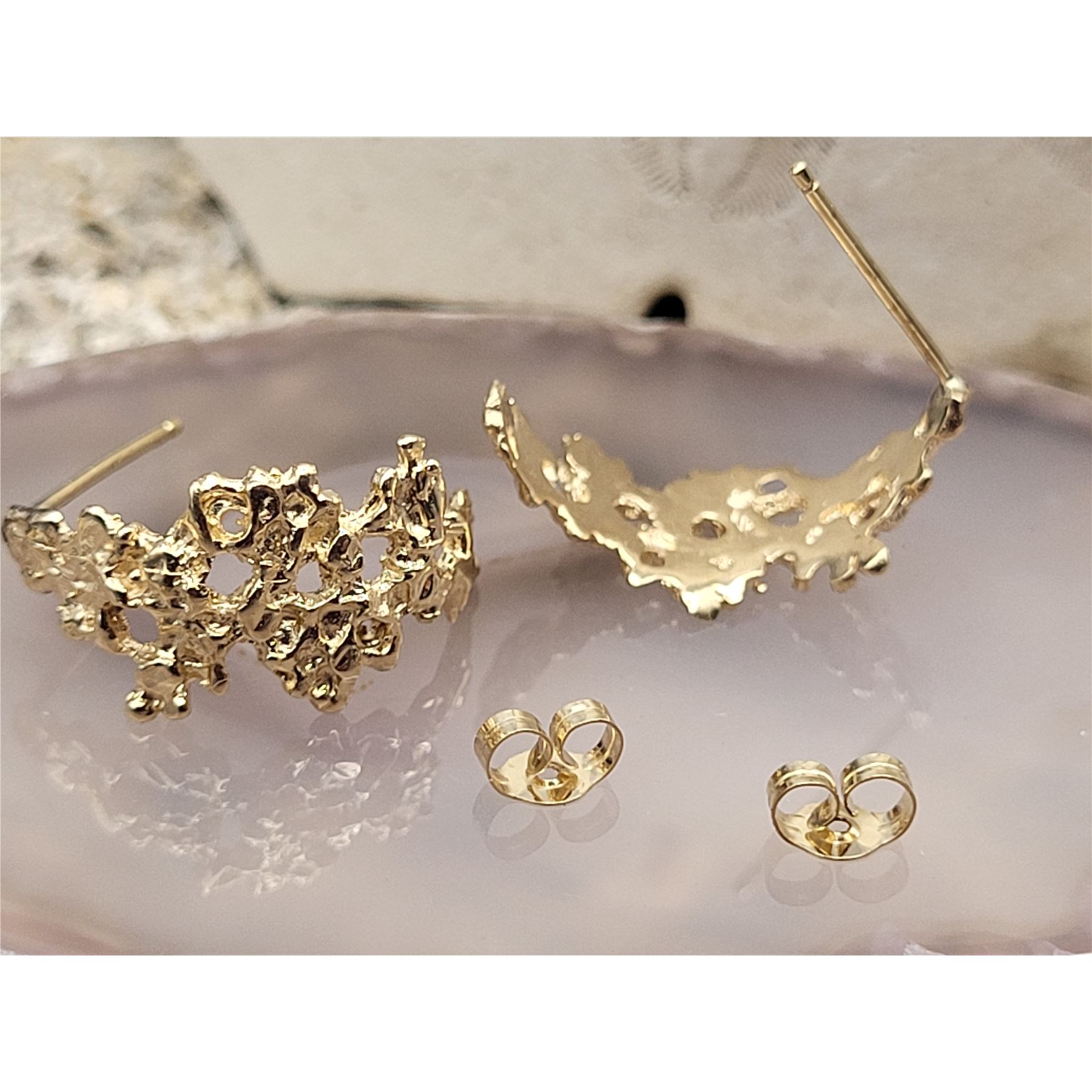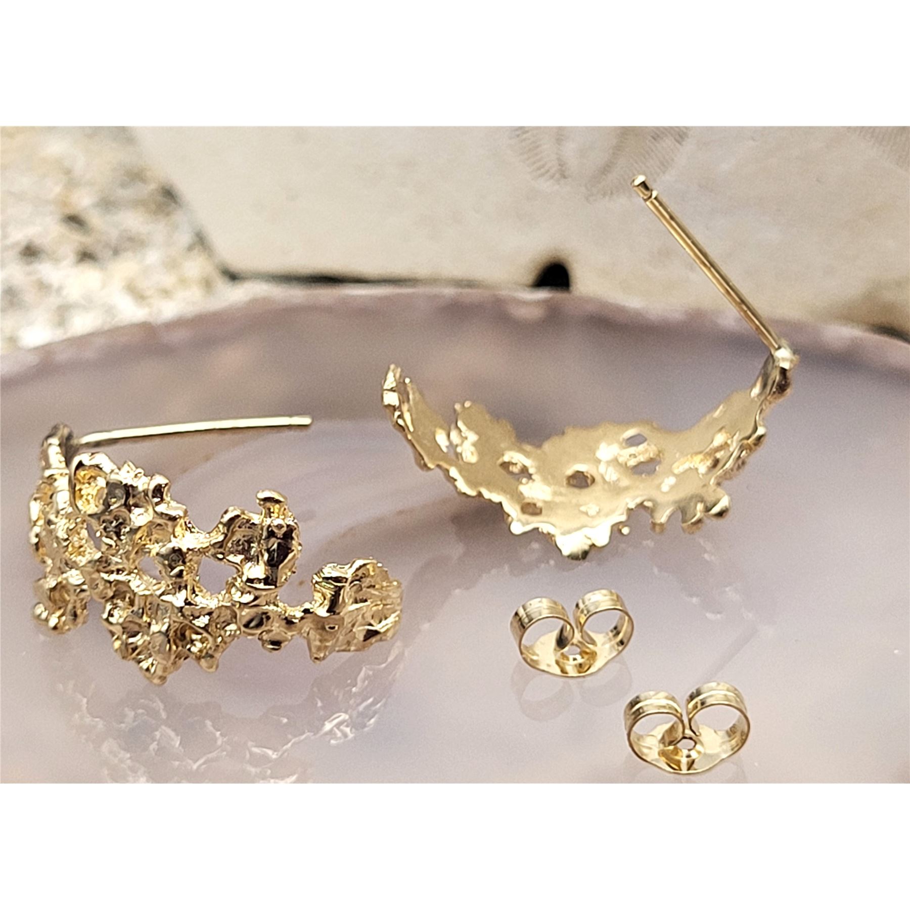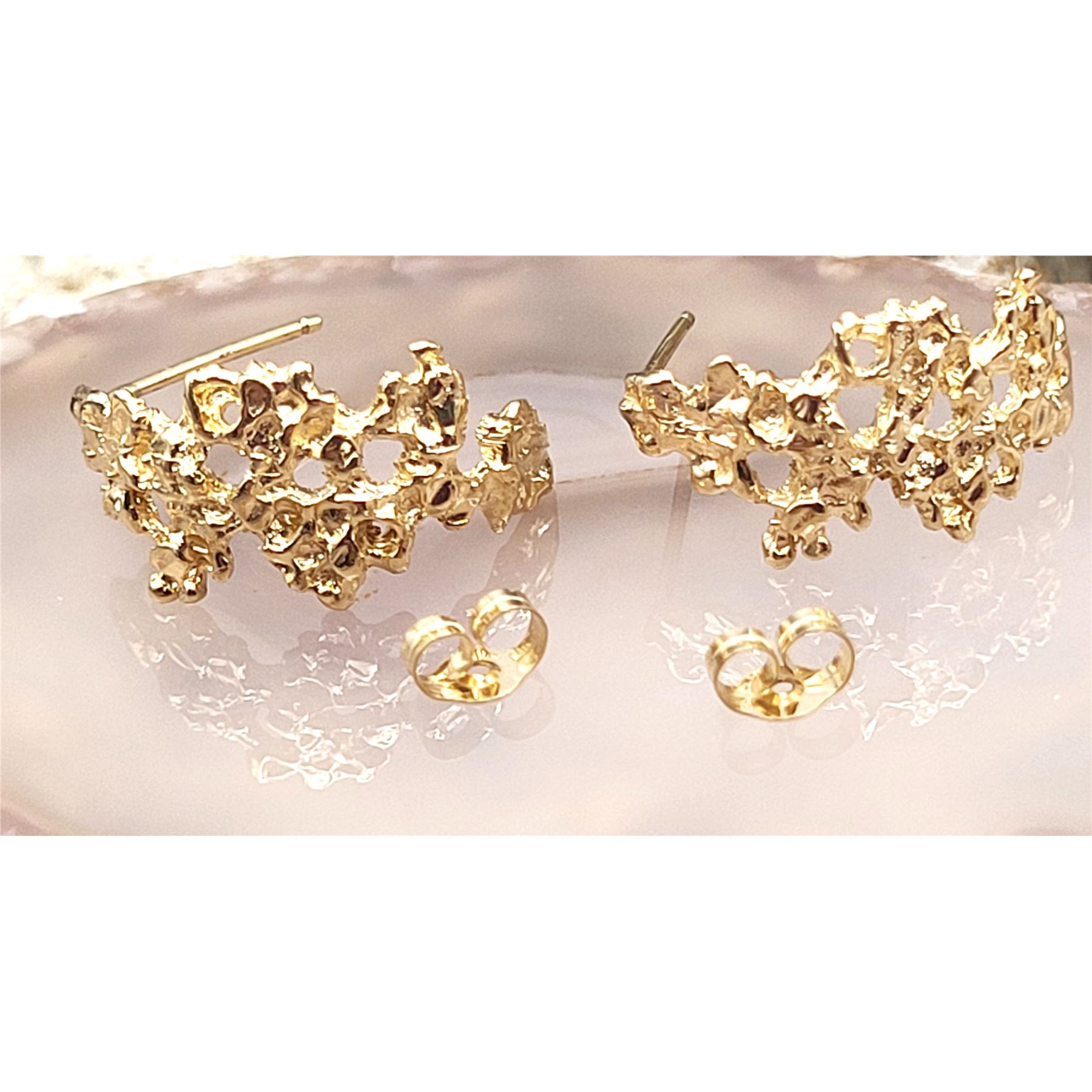 This is a pair of 14 karat yellow gold & quot;nugget-style& quot; earrings that look to have been crafted using the 'lost wax' method.& nbsp; The earrings are approximately 3/4& quot; long and attach to the earlobe with posts and friction backs.& nbsp; Admin: TC/7-bwr