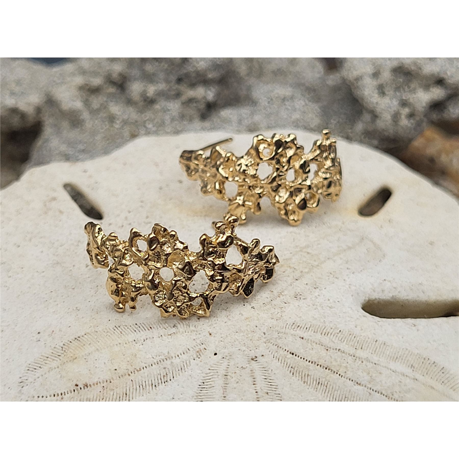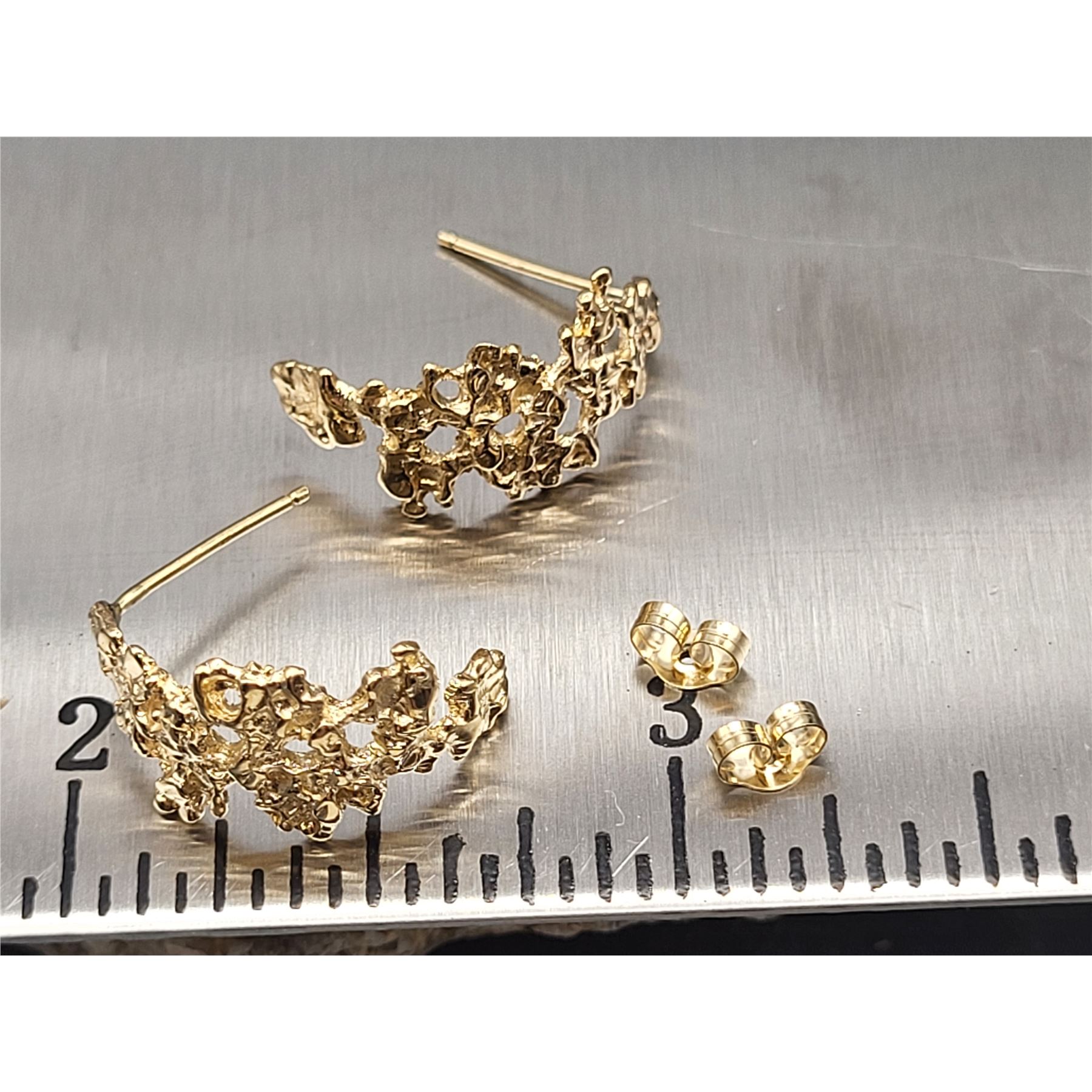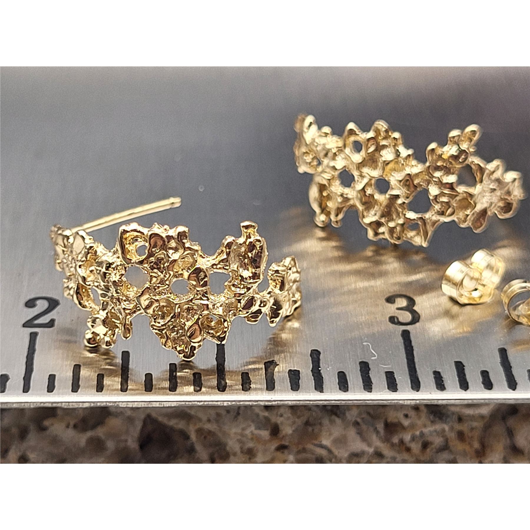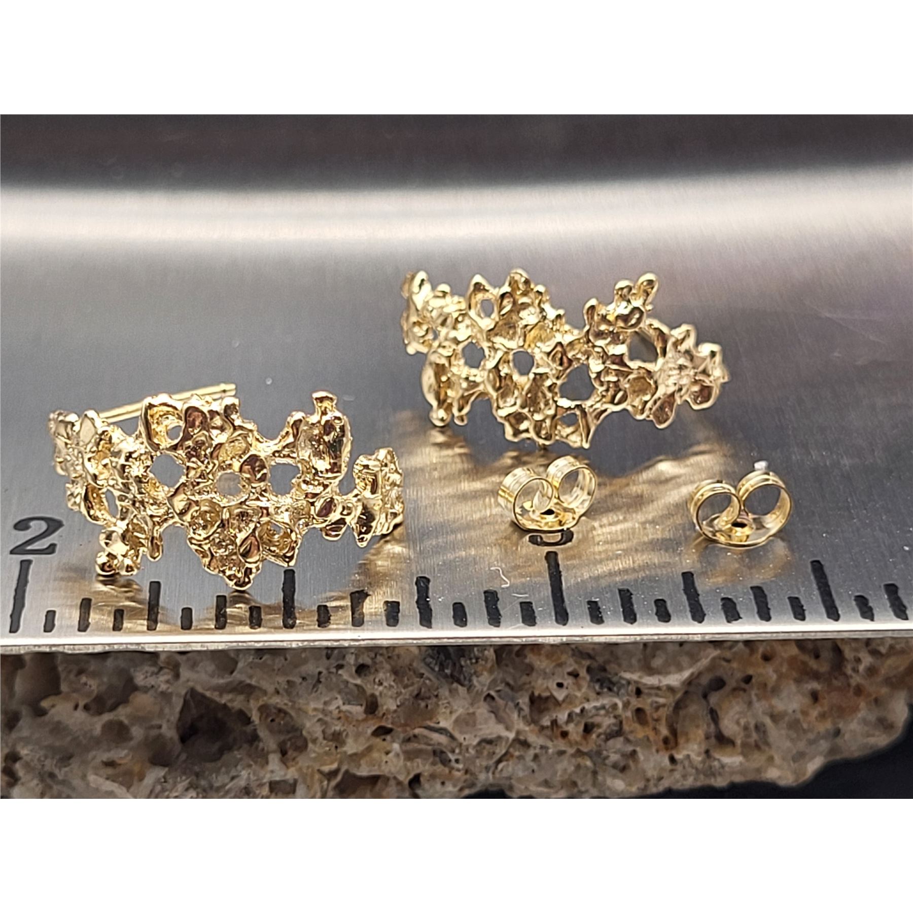 This is a pair of 14 karat yellow gold & quot;nugget-style& quot; earrings that look to have been crafted using the 'lost wax' method.& nbsp; The earrings are approximately 3/4& quot; long and attach to the earlobe with posts and friction backs.& nbsp; Admin: TC/7-bwr