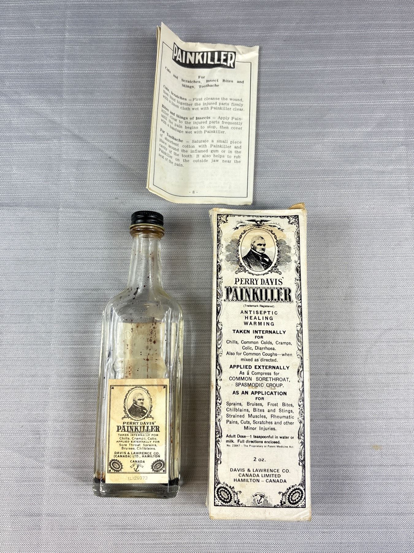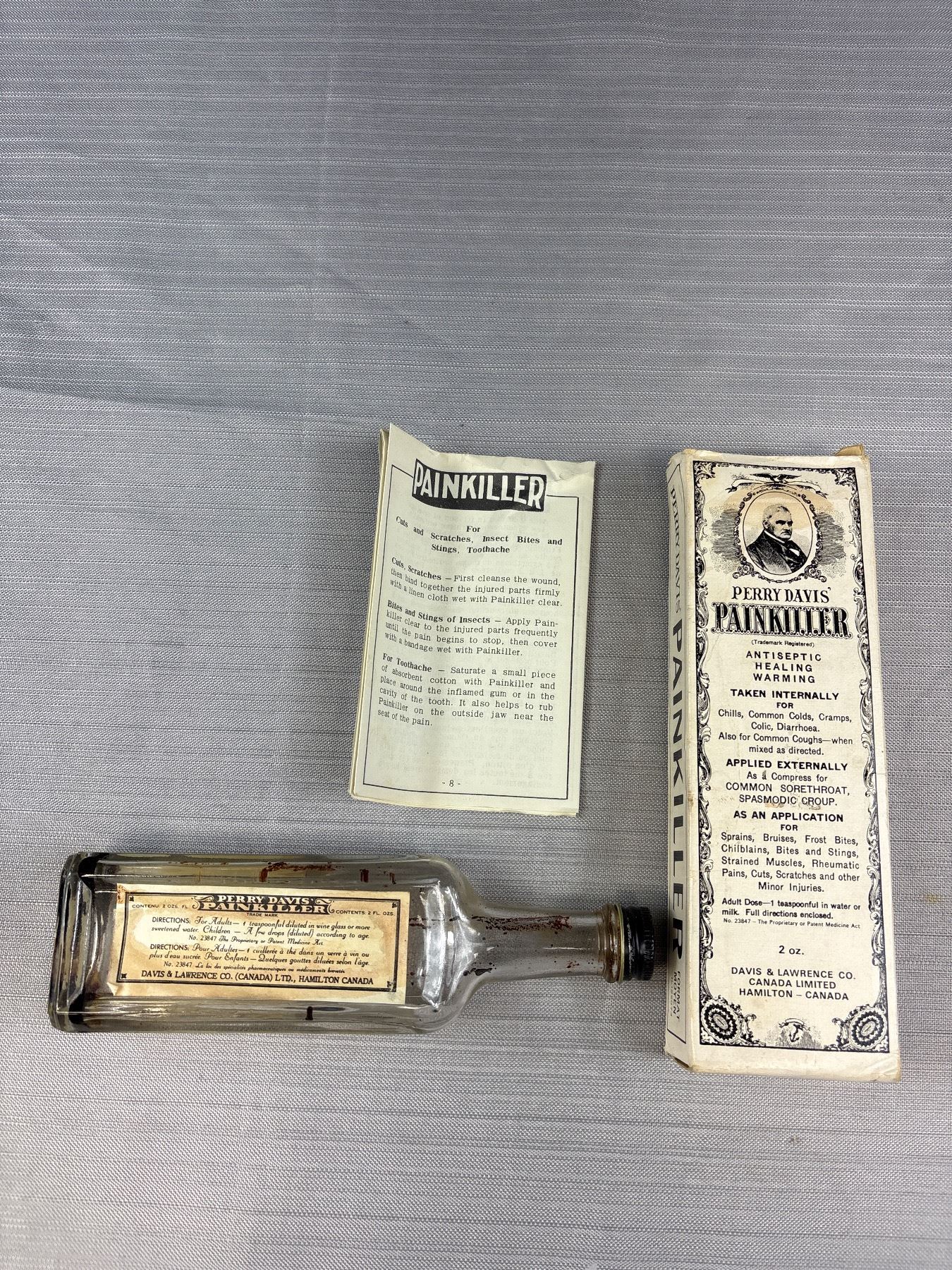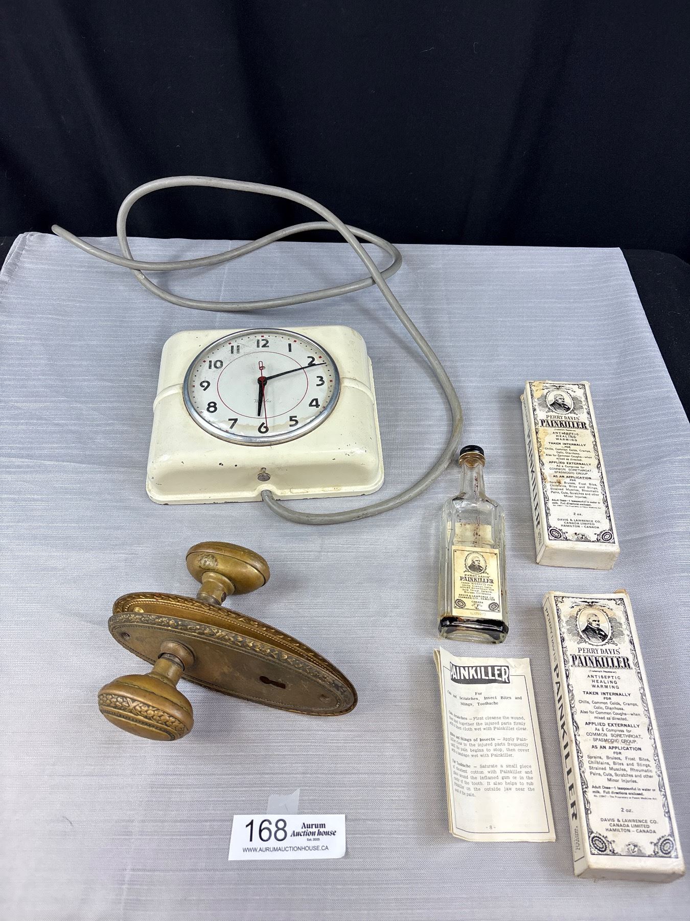 Vintage Lot Old Wall Clock Brass Doorhandle and Perry Davis Painkiller in Original Boxes