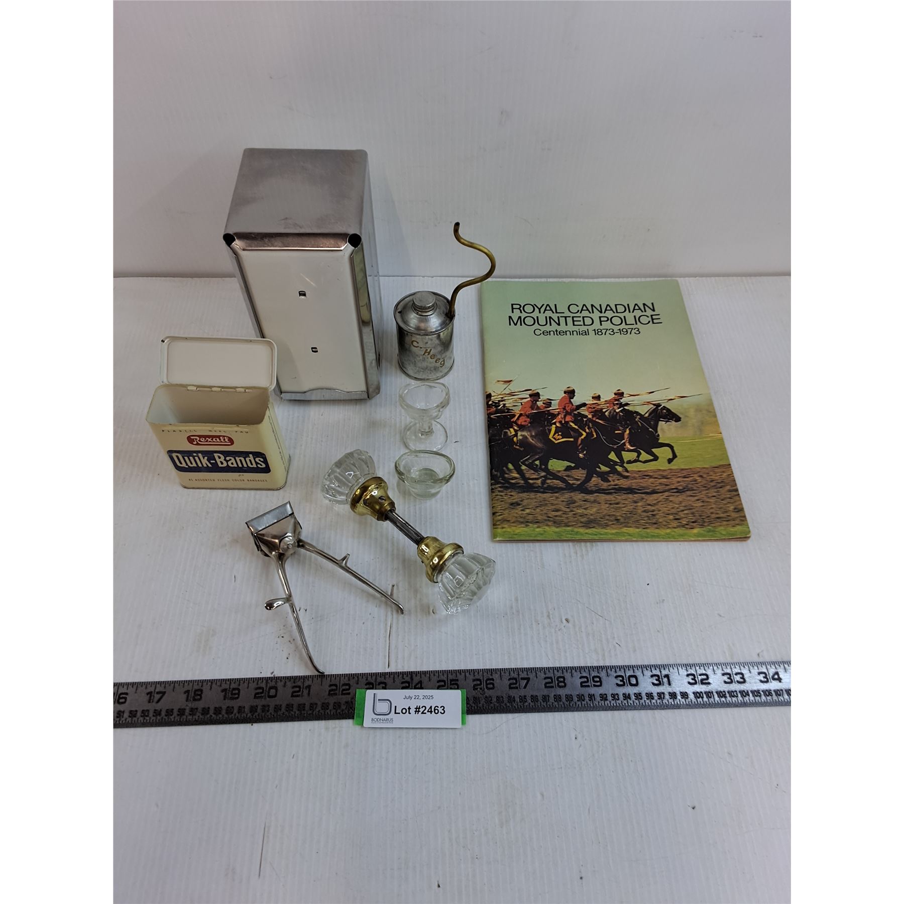 Vintage Lot - RCMP Centennial Booklet, Door Knob Set, Trimmer, Tins, Serviette Dispenser, Misc.