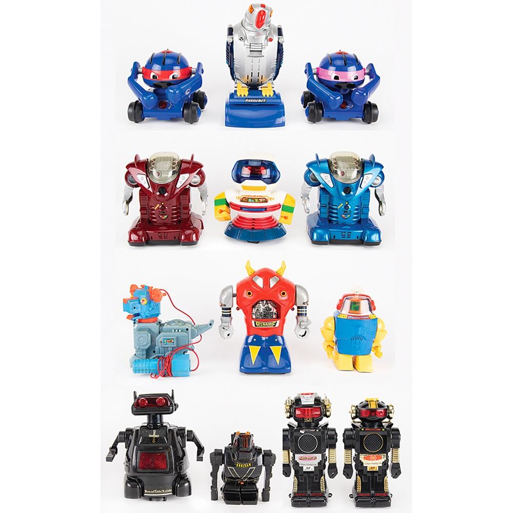 Collection of 13 vintage circa 1970s–2000s plastic toy robots, most battery-operated, ranging in height from 5˝ to 11˝, highlighted by "Dynamic Machine" by Yonezawa, "Walk-a-Tron" by Playwell, "Robot Puppy" by Arco, "Round Table Knight" by PToy, "Magic Mike II" by New Bright, "Micro Chip" by New Bright, "Battle Robot" by Nikko, "Clamster Rumble Robot" by Trendmaster, and "Parrobot" by Fong Toys. Includes toy robots made in Japan, China, Hong Kong, and Taiwan.
