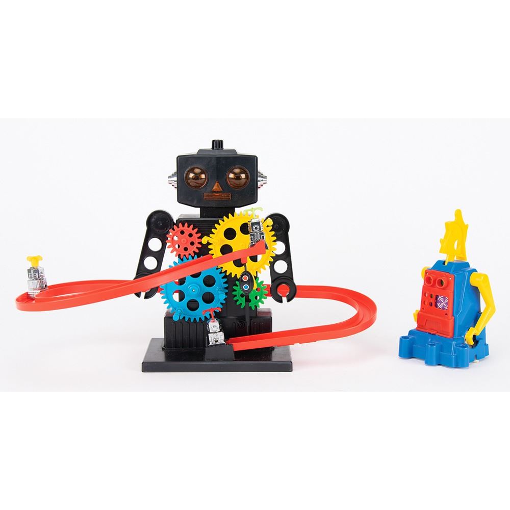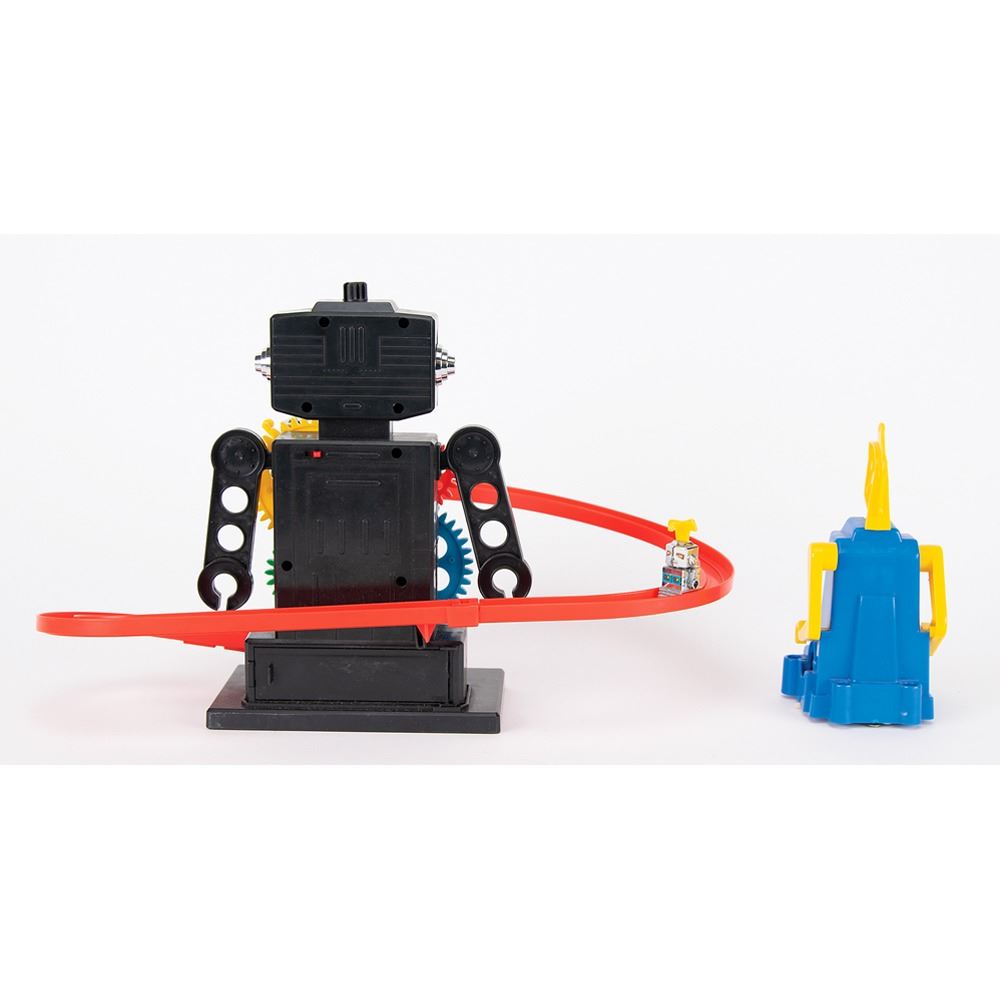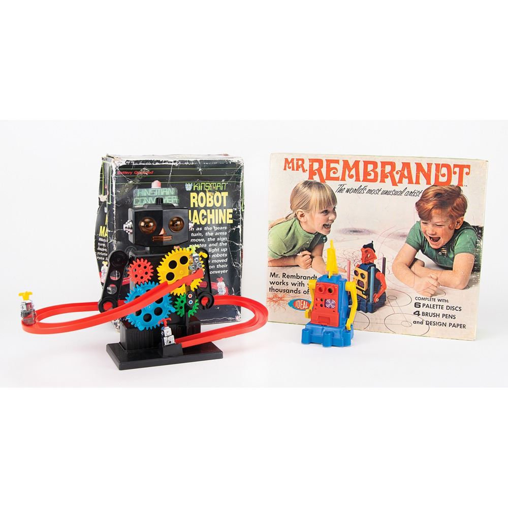 Two vintage battery-operated plastic toy robots, both with their original boxes. Includes: a circa 1970 "Mr. Rembrandt" drawing robot, made by Ideal, with accessories including four loose brush pens, five palette discs, and a refill kit with four unopened brush pens plus sheets of paper; and a circa 1985 "Kinsman Robot Machine (No. 7021)," made in Taiwan by Dah Yang Toy, with accessories including two red tracks and three miniature robots.