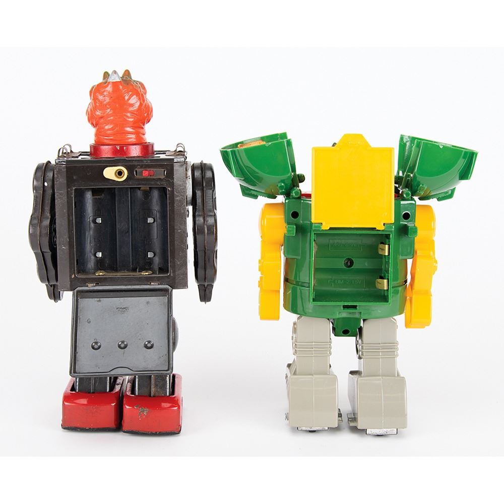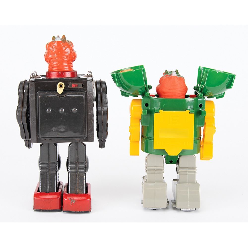 Two fantastic vintage battery-operated Dino robots: a classic vintage circa 1960s–70s battery-operated "Dino-Robot" with black tin body and red feet and lightbulb in its monster mouth, made in Japan by Horikawa, standing at 11˝ tall (missing its robot head shoulder flaps); and a later "Monster Robot" in a similar style with green-and-yellow plastic body, made in Taiwan, standing at 9˝ tall.