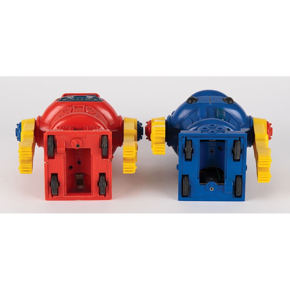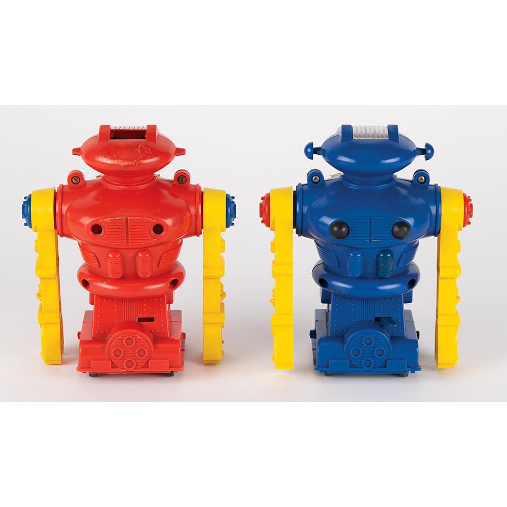 Two vintage circa early 1970s battery-operated "Karate Robot Jr." toys, made in Hong Kong by Tomy, each standing at 6.5Àù tall. Includes one red robot and one blue robot, as well as one heavily worn original box. The red robot is missing its head plate.