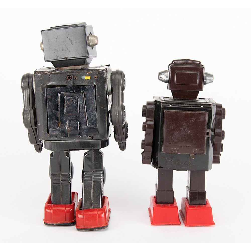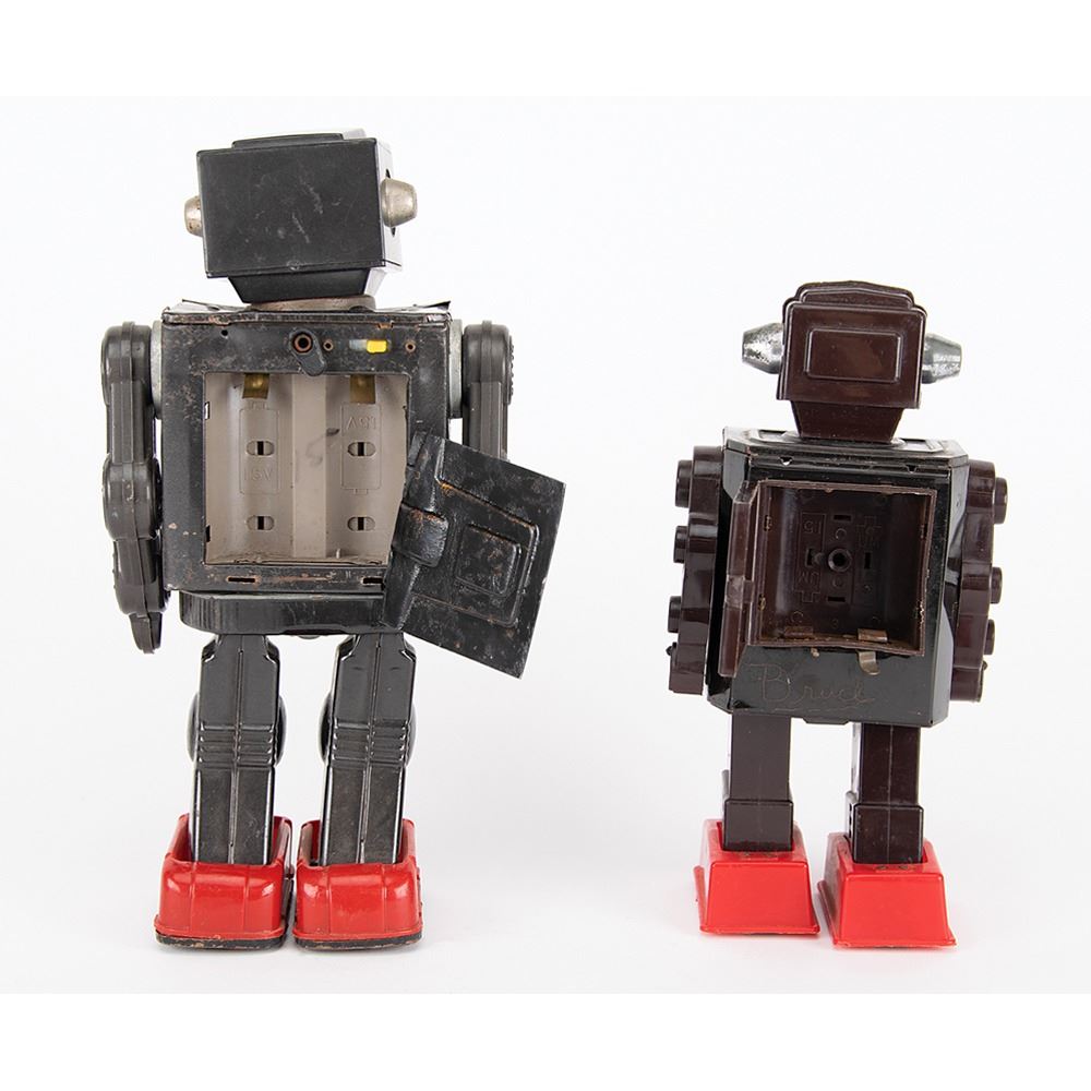 Two vintage circa 1960s–70s battery-operated walking tin toy robots, made in Japan by Horikawa, including the 11.5˝ tall Rotate-O-Matic Super Astronaut Robot and the 9˝ tall Space Fighter Robot. Both feature black tin bodies with red plastic feet and similar graphics on the chest. The battery plate for the taller robot is dented and missing one of its tabs, making it difficult to secure in place.