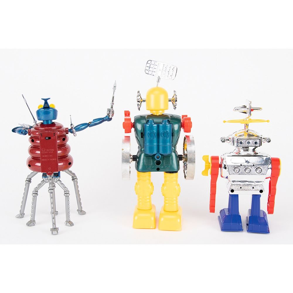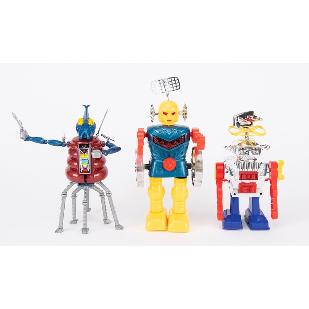 Three vintage circa 1980s plastic robots, all with their original boxes. Includes: a battery-operated "B/O Super Robot" made in Hong Kong, standing at 16.5Àù tall and advertising "12 Combination with Funny Action"; a battery-operated "Spacey Spider" all-terrain walking robot, made in Taiwan by Tai Fong, standing at 10Àù tall; and a wind-up "Super Revolution Robot," made in Japan by Junior Toy, standing at 10Àù tall.