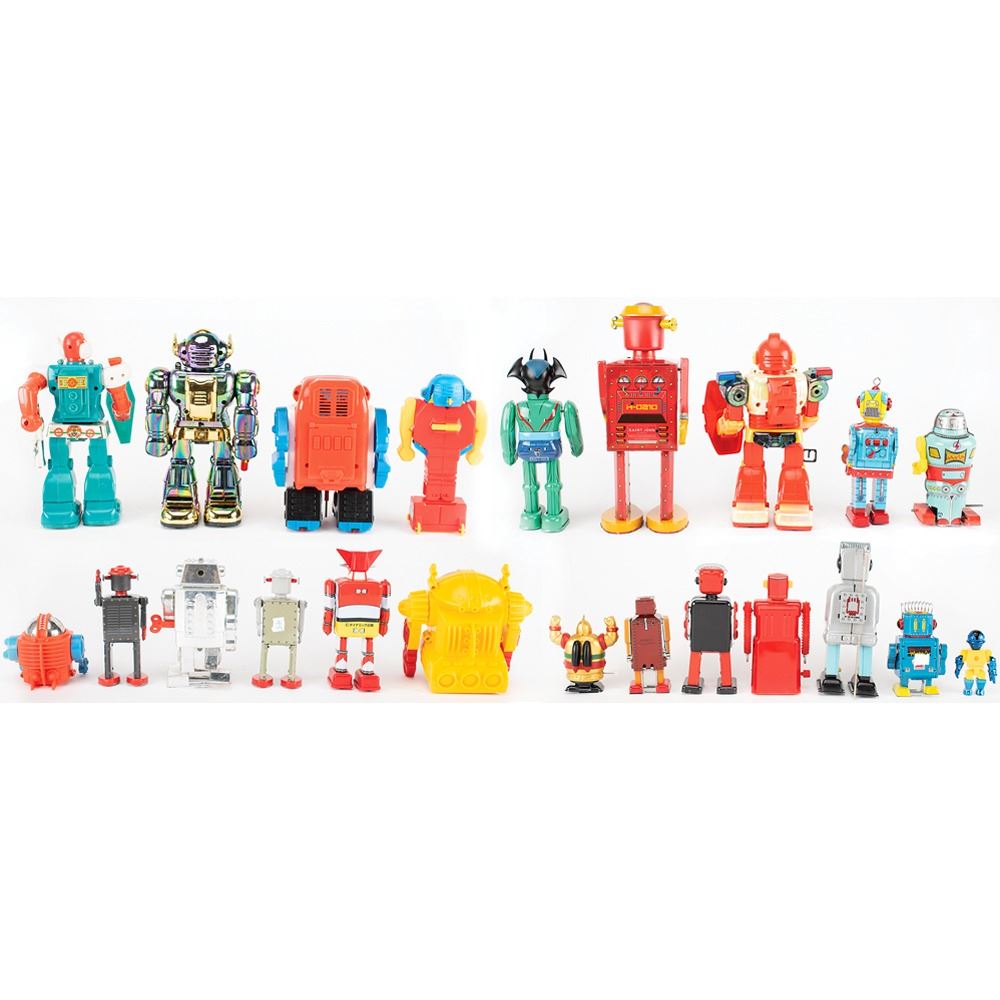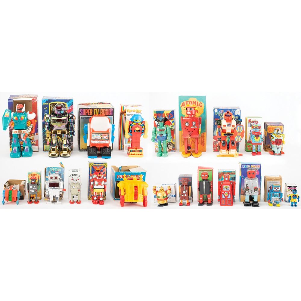 Huge lot of 22 vintage circa 1960s–2000s boxed robots, ranging in height from 2.5˝ to 11.5˝, mostly comprised of wind-up tin litho mechanical robots with a few plastic battery-operated examples. Highlights include a vintage "Mechanical Robot" wind-up toy made in Greece, a "Captain the Robot" clockwork robot made in Hong Kong (box flattened), a Billiken Shokai Mechanical "Devilman" made in Japan, a Marmit Character Collection "Robo Getter" mini wind-up walking robot, and three modern versions of "The Atomic Man," ranging in height from 5˝ to 11.5˝. Others include a "Laser Robot Fighter" made in China, a "Tumbling Space Warrer" (box damaged), a battery-operated "Funny Robot" made in Hong Kong (box lid damaged), a Robot Island "Mechanical Mighty Robot" made in China, battery-operated "HK-707A Mighty Robot Sonic," battery-operated "Super TV Robot," an F. J. Strauss "Bop-a-Bot," a battery-operated "Robot Warrior," and seven very small boxed robot toys including "Proton Robot" and "Robot Liliput."