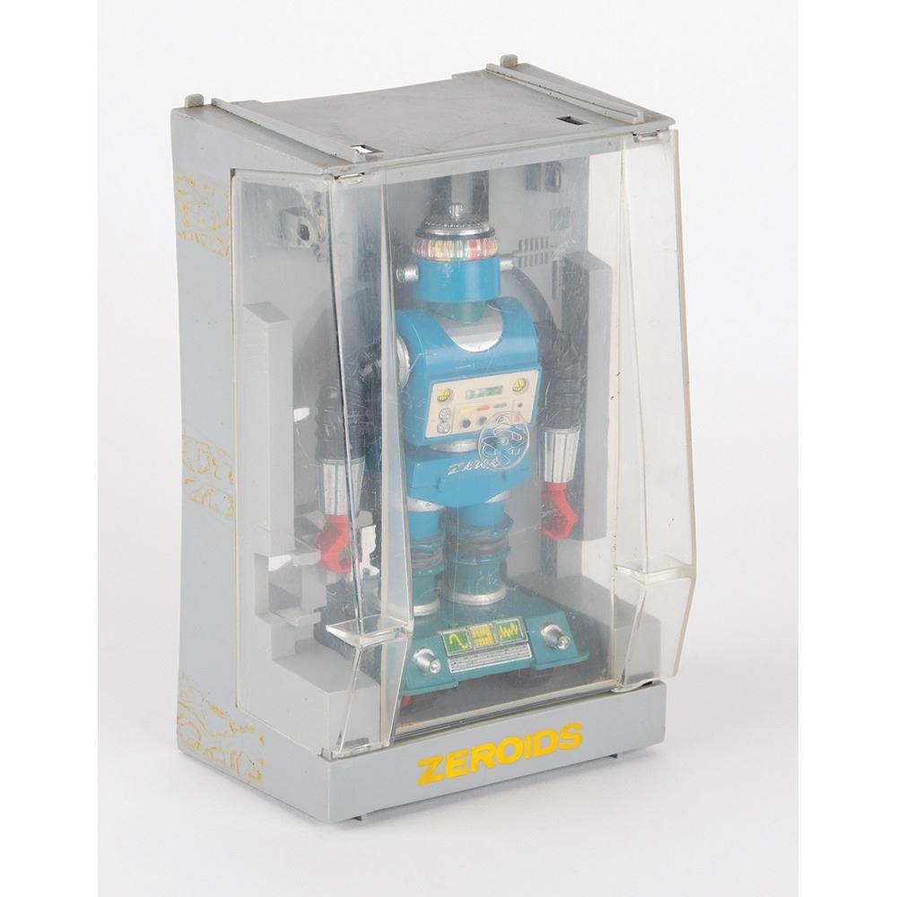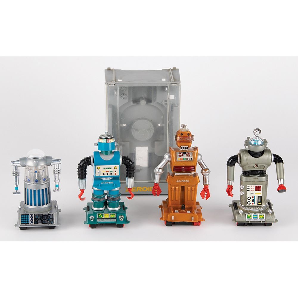 Lot of four vintage circa 1960s–70s Zeroid robots, made in Hong Kong by Ideal, ranging in height from 5˝ to 7˝. Includes Zerak the Blue Destroyer Robot in its original box, Zobor Robot, Zerak the Blue Destroyer Robot, and Star Team Pilot Robot.
