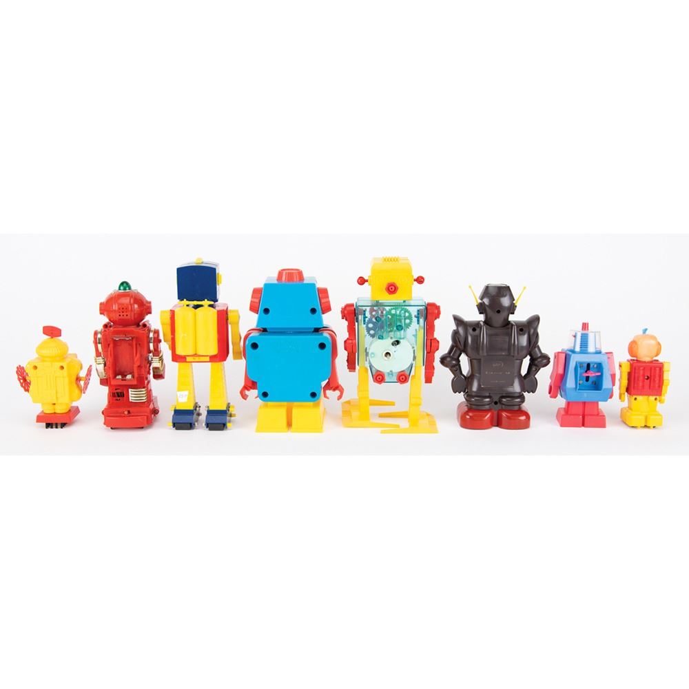 Group of eight vintage mid-size plastic toy robots, ranging in height from 6Àù to 9.5Àù, including a variety wind-up and battery-operated toys. Highlights include a classic MorToys "Robbie Robot," a "Teacher Gantsu" robot slot machine by Popy, and a Cragstan "Furo" toy from the 'Moon Men' series. Includes toys made in Japan, Hong Kong, and elsewhere.