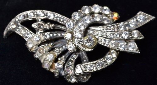Rhinestone brooch is missing one rhinestone, and Brooch with blue stones is missing one stone. Other wise all in good wearable condition. Est Value $15.00-20.00