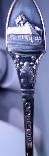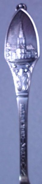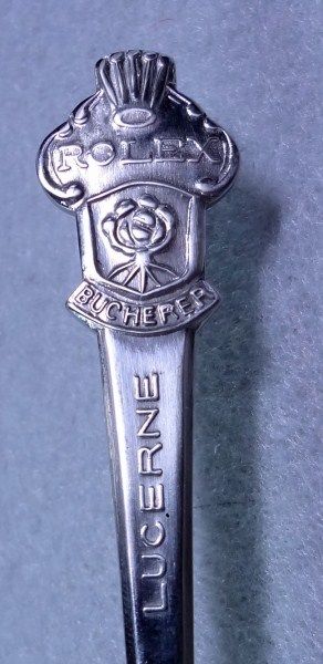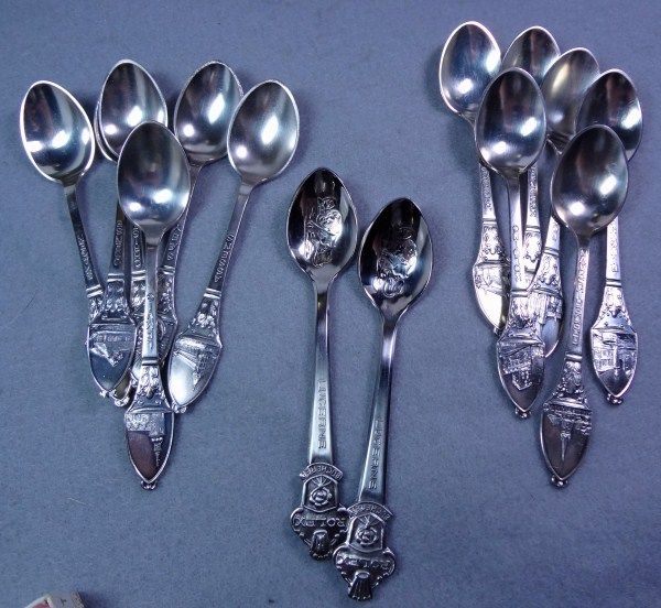 Two sets of souvenir spoons containing 6 spoons each in original boxes from Denmark. Each spoon has picture of landmark buildings. Also two Rolex souvenir spoons 14 spoons in all. silver plated