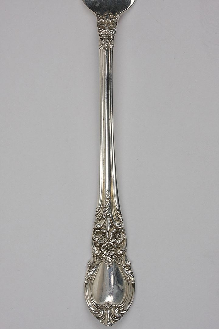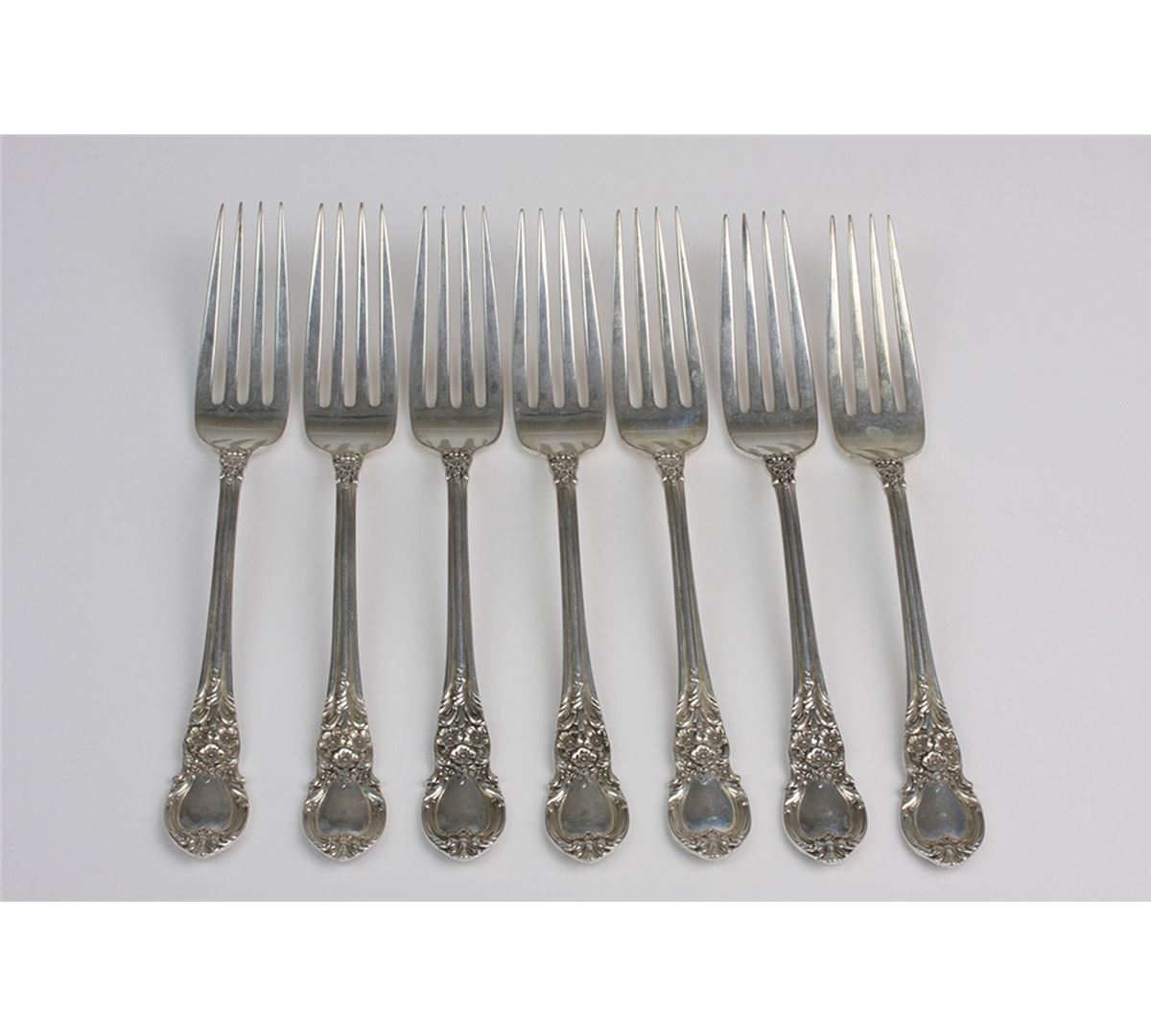 One vintage set of 7 sterling silver dinner forks by Lunt "American Victorian". Approximate total weight of set: 320gm. Measures 7". Valued between $700 - $800.