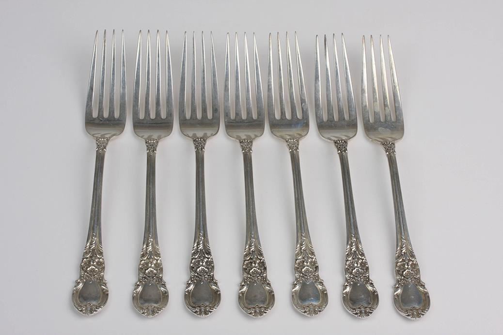 One vintage set of 7 sterling silver dinner forks by Lunt "American Victorian". Approximate total weight of set: 320gm. Measures 7". Valued between $700 - $800.