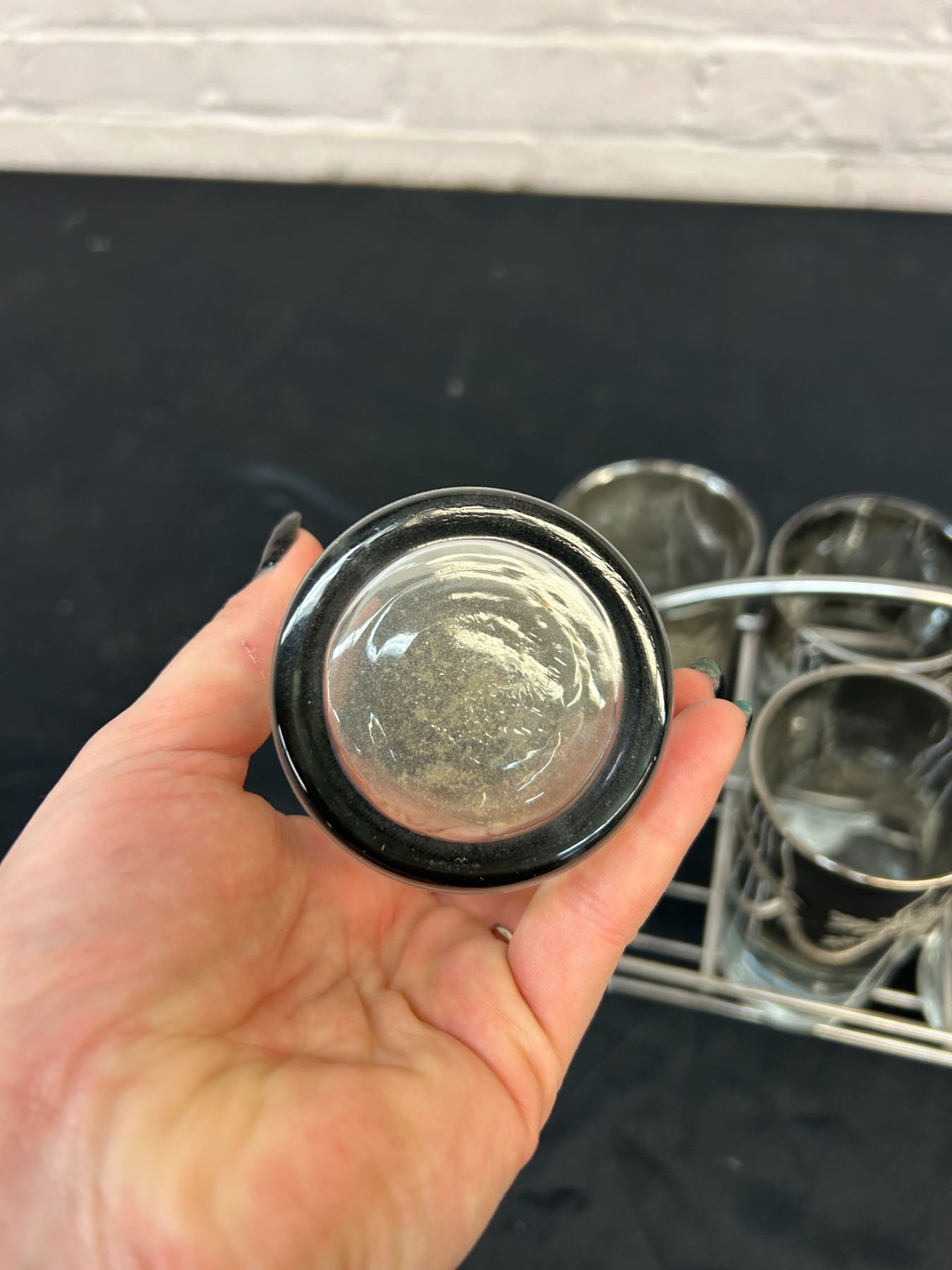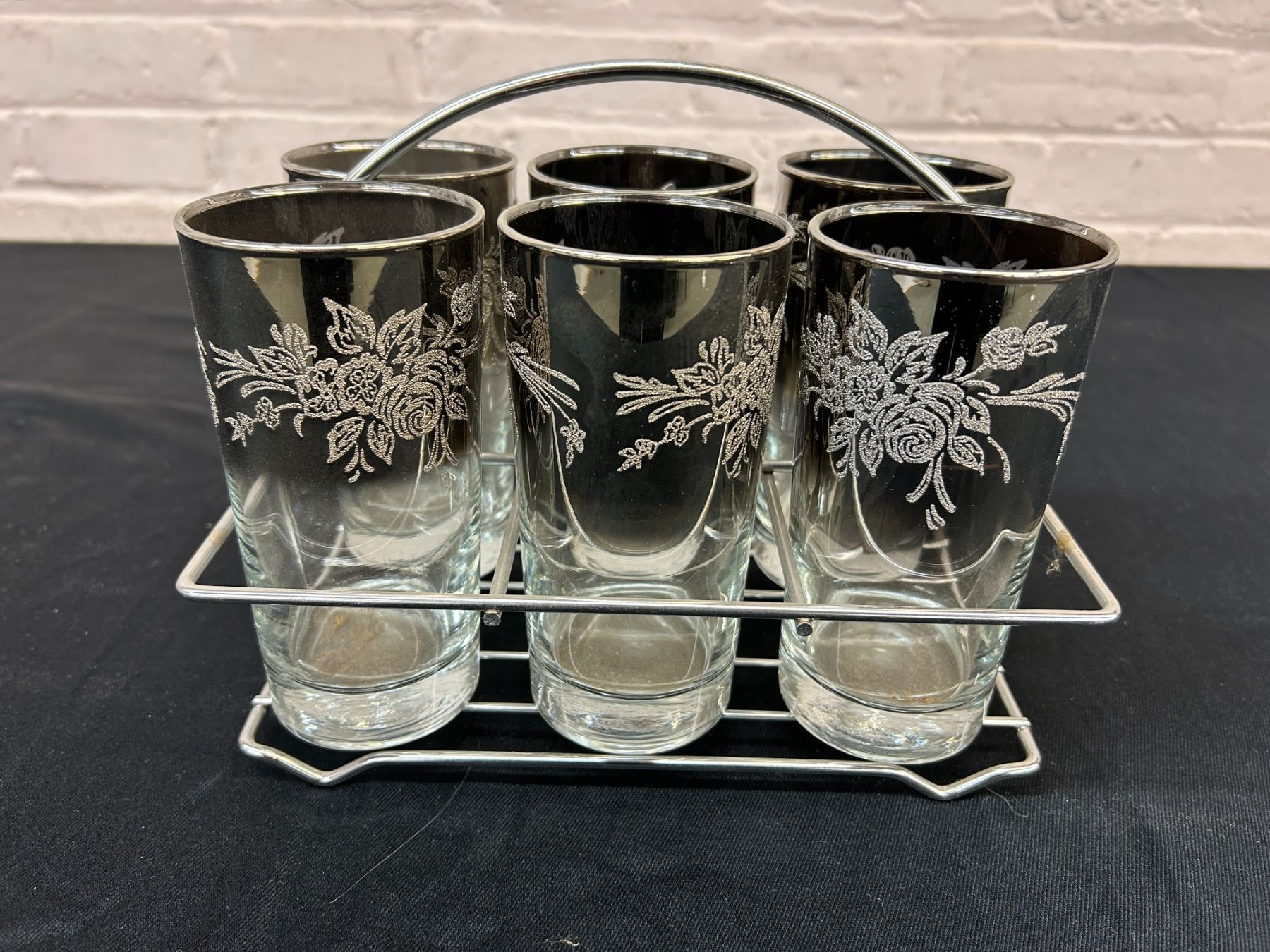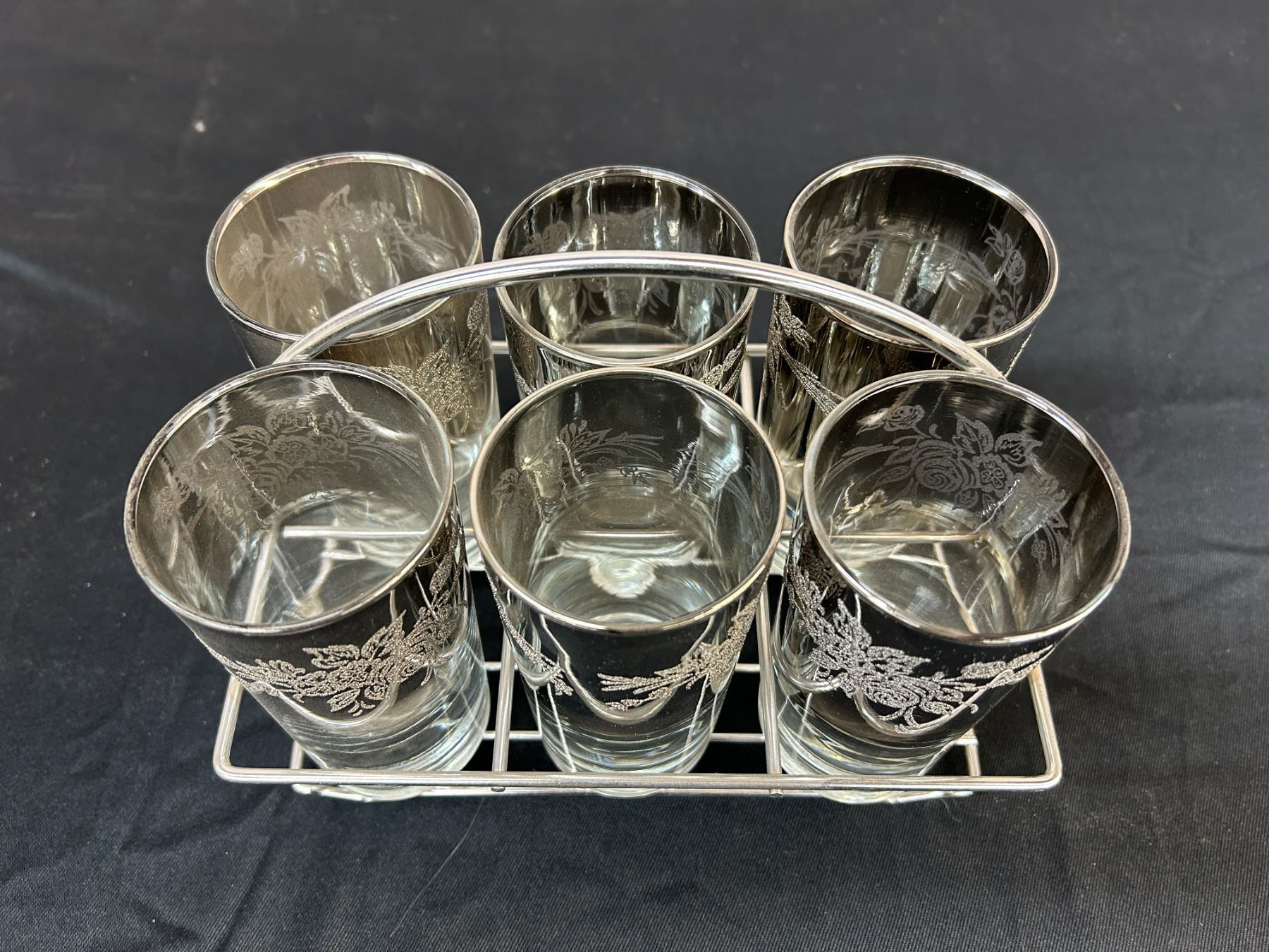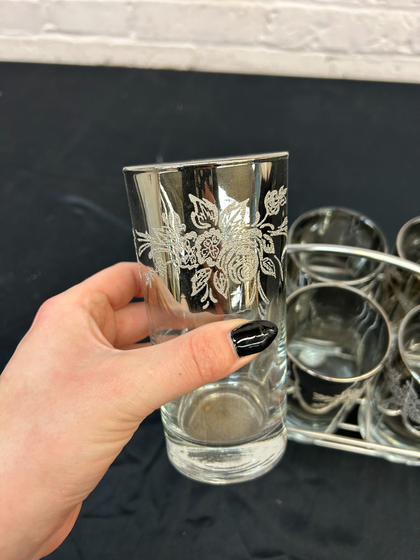 Vintage MCM Silver Fade Embossed Tall Rocks Glasses Set of 6 with Caddy
