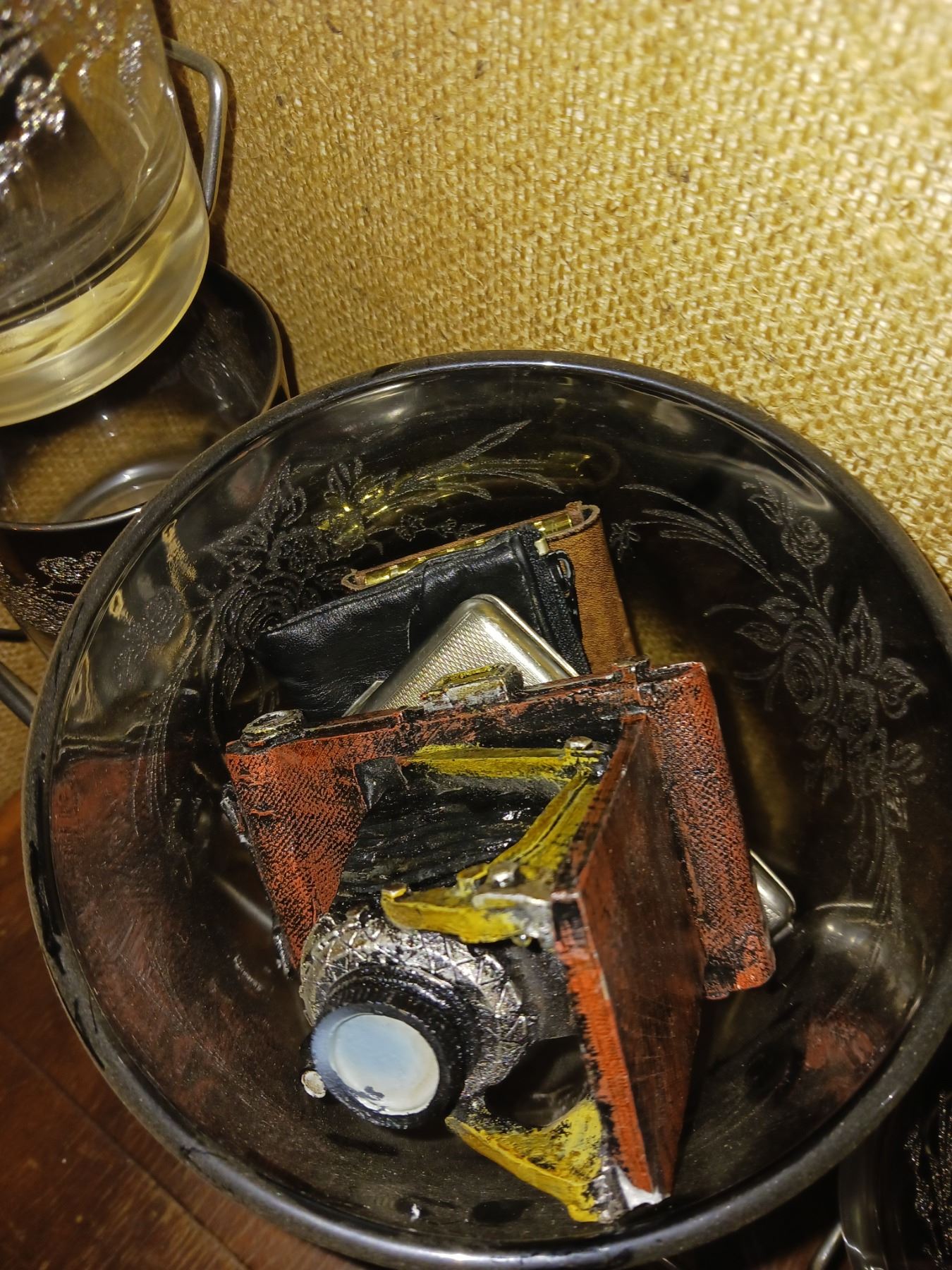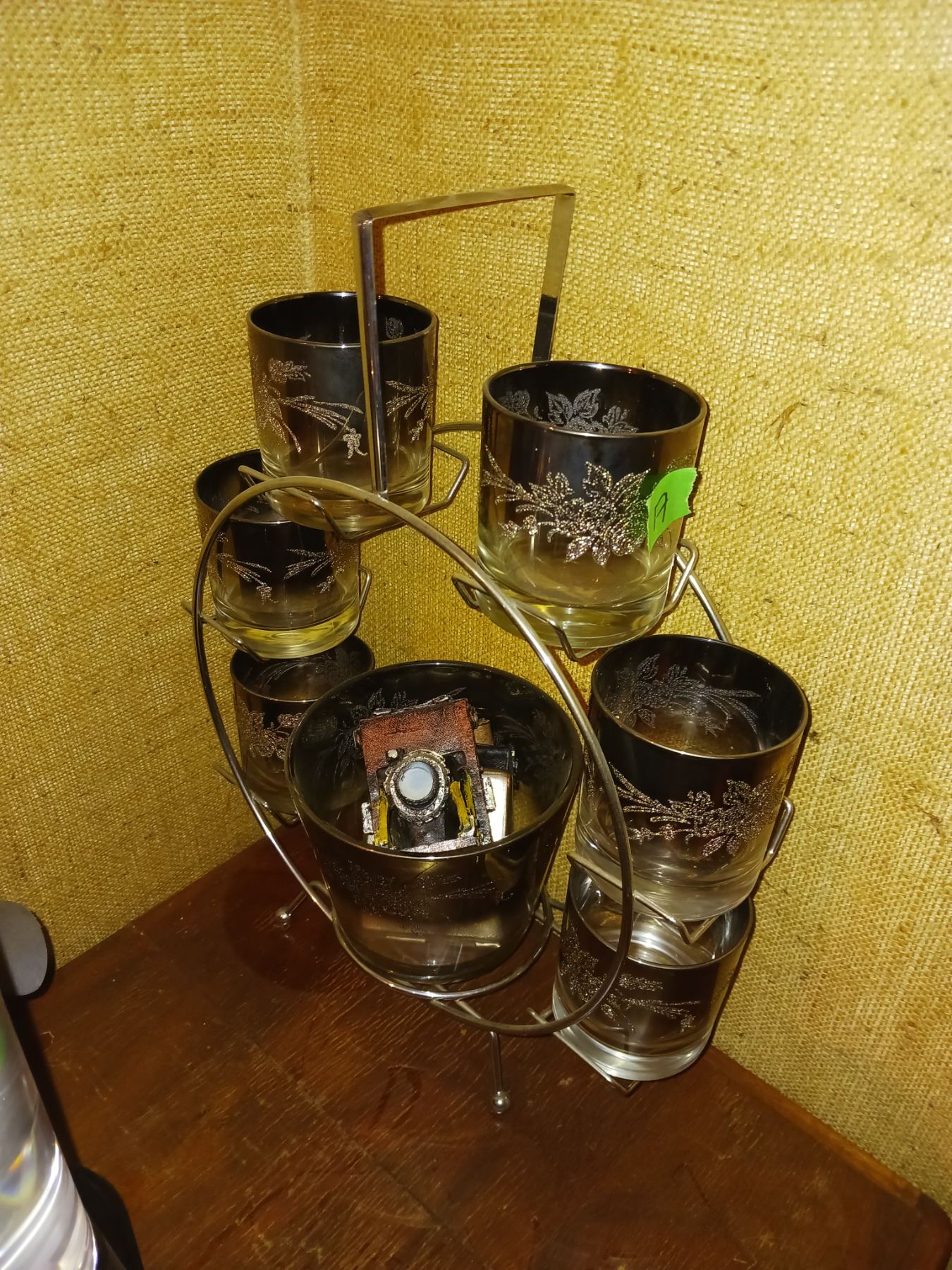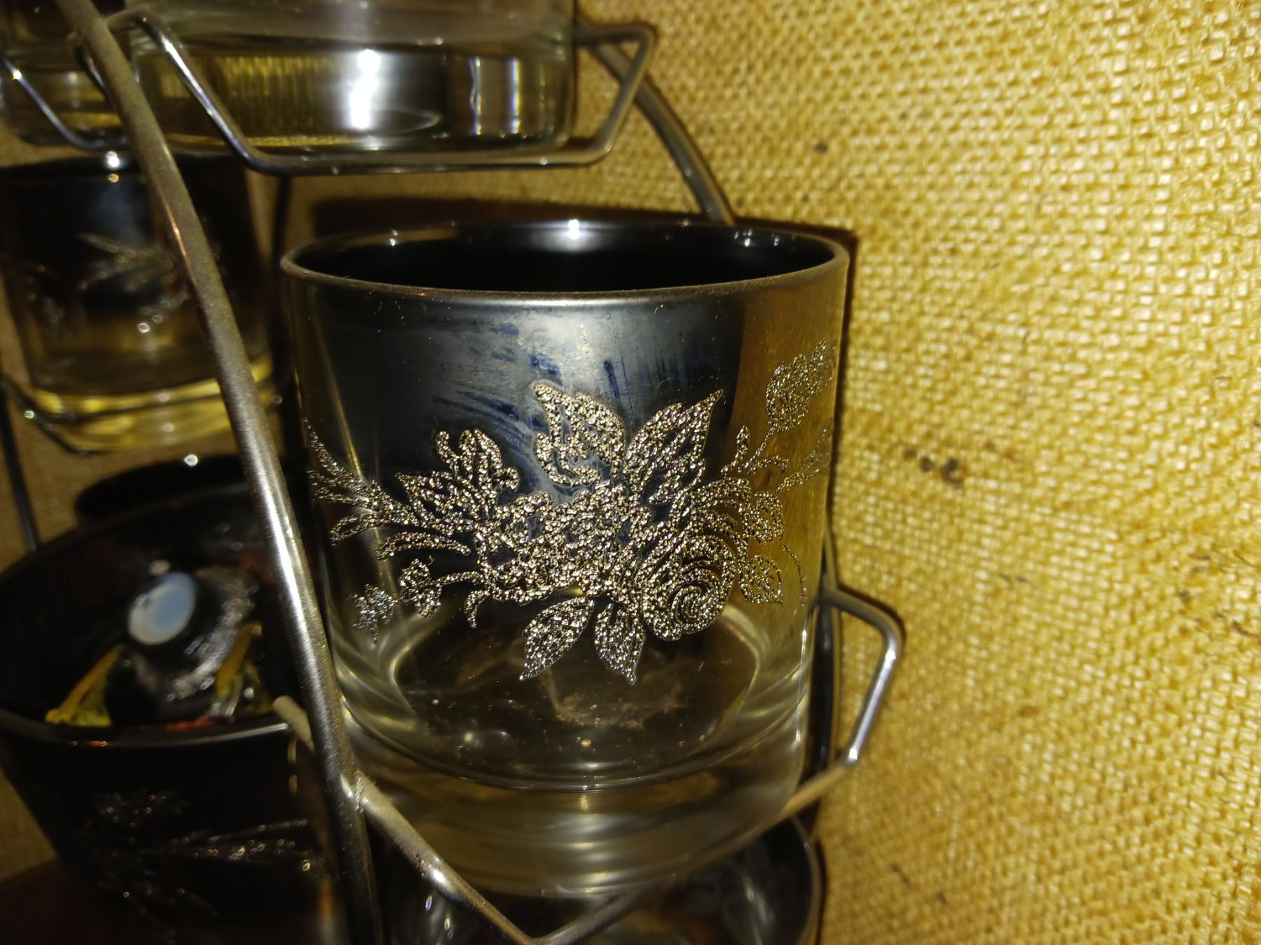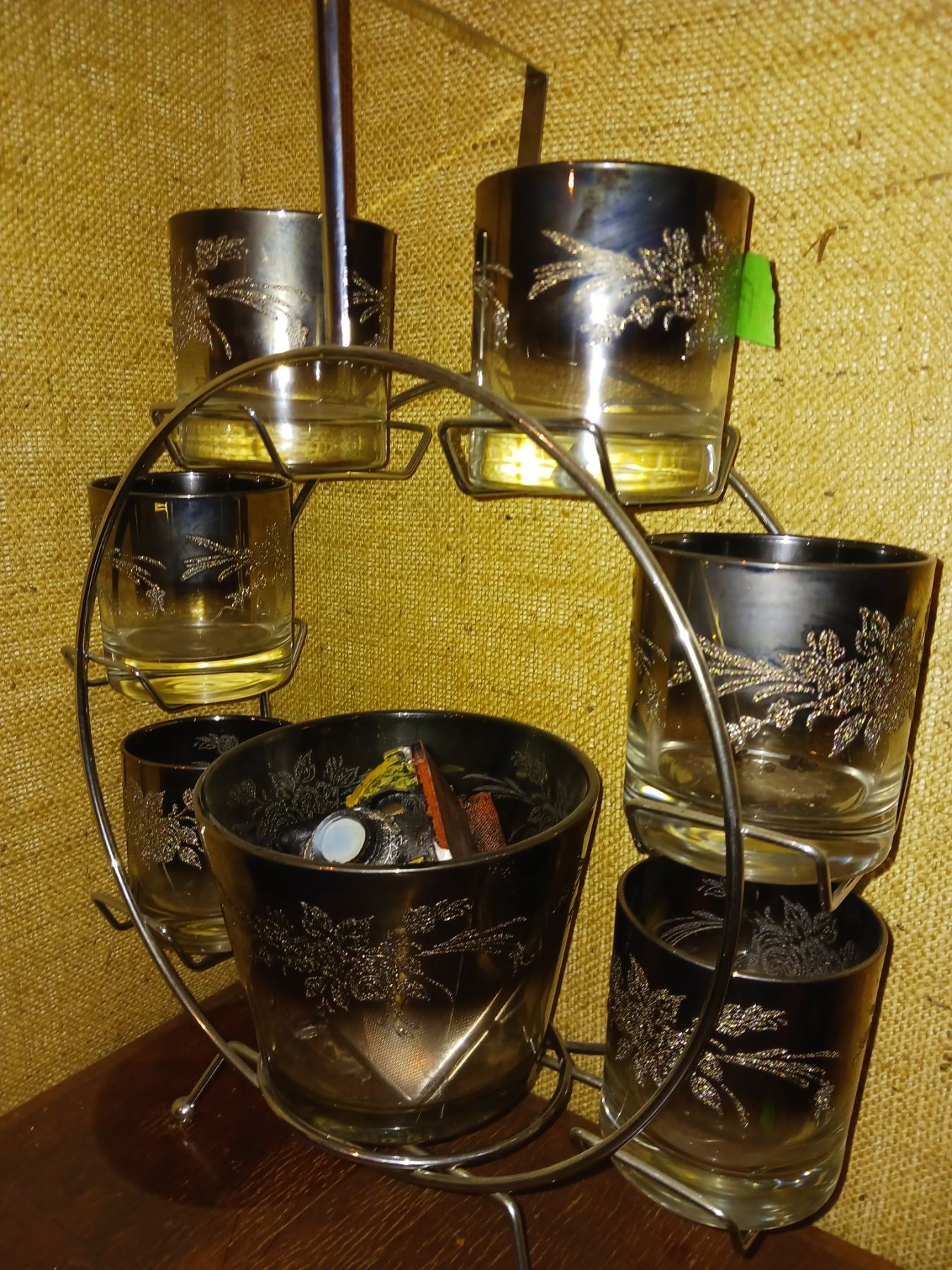 Vintage MCM Vitreon Queens Lusterware, Etched Silver Rose, Cocktail Ferris Wheel Set With Ice Bucket + Contents