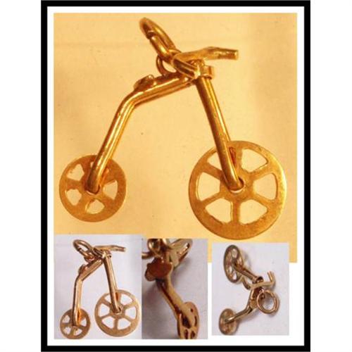 Not only do the wheels spin, the handle bars move left and right, but the wheels in the front move forward to the handle bars so it can be a short unicyle or a tall one like in a circus. This is one of the neatest mechanical charms I have seen. Lots of quality work in it and it is in great shape. This measures 3/4" x 3/4" and is 14kt gold.