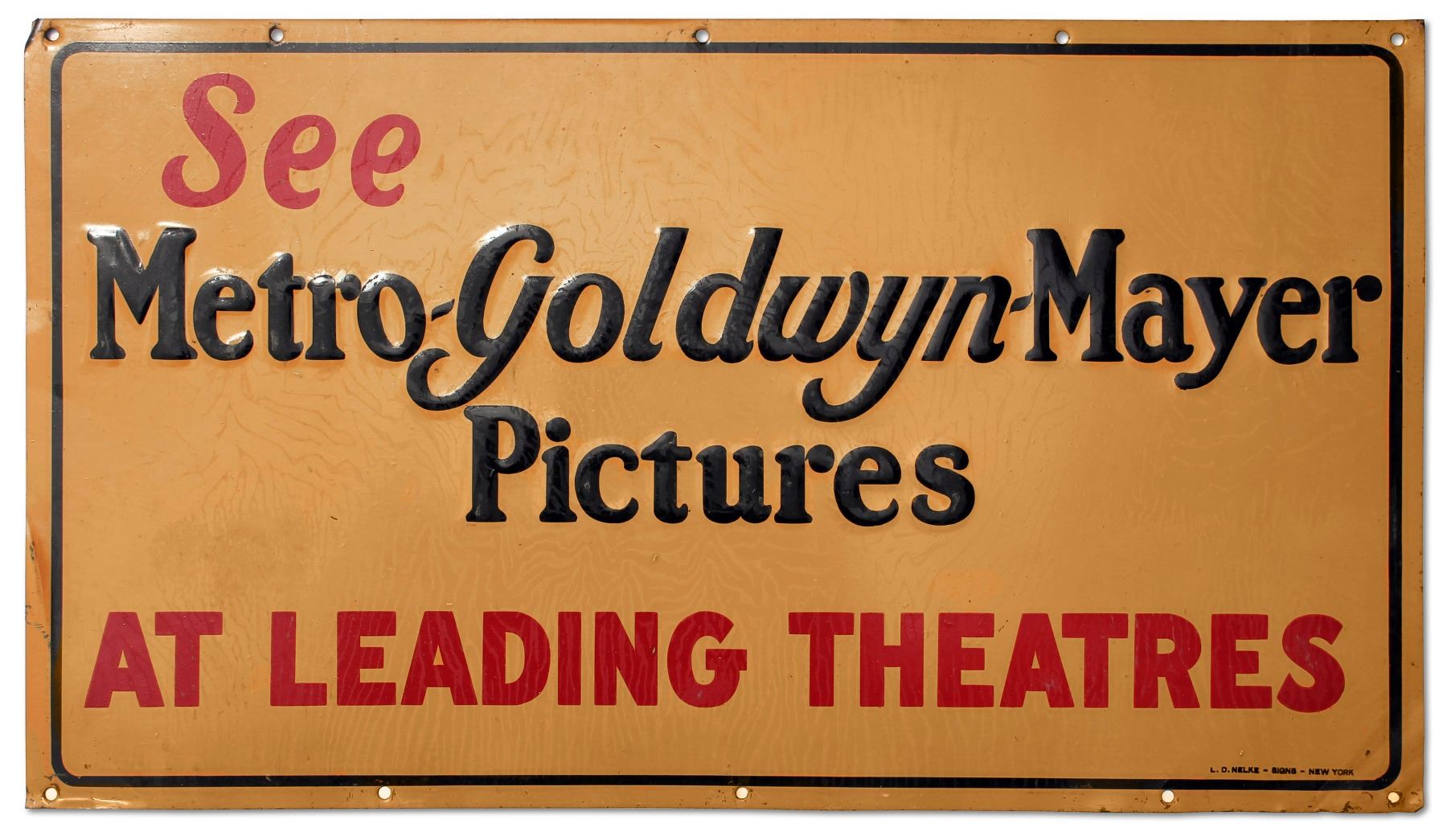 Vintage stamped tin sign circa 1940s. Mustard yellow sign has black-lined border and reads: ''See Metro-Goldwyn-Mayer Pictures / AT LEADING THEATERS'', with raised middle portion. Sign is original and was acquired from local theater. Made by L.D. Nelke in New York, as stated at lower right. 8 holes at top and bottom edge are part of design. Verso is colored green. Measures 21'' x 11.75''. Some wear and dirt, minor bending, overall very good condition, displaying nicely.